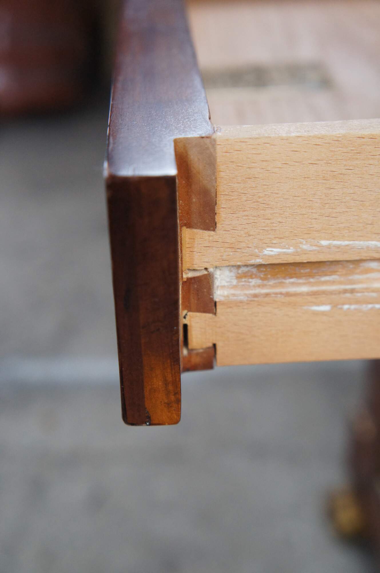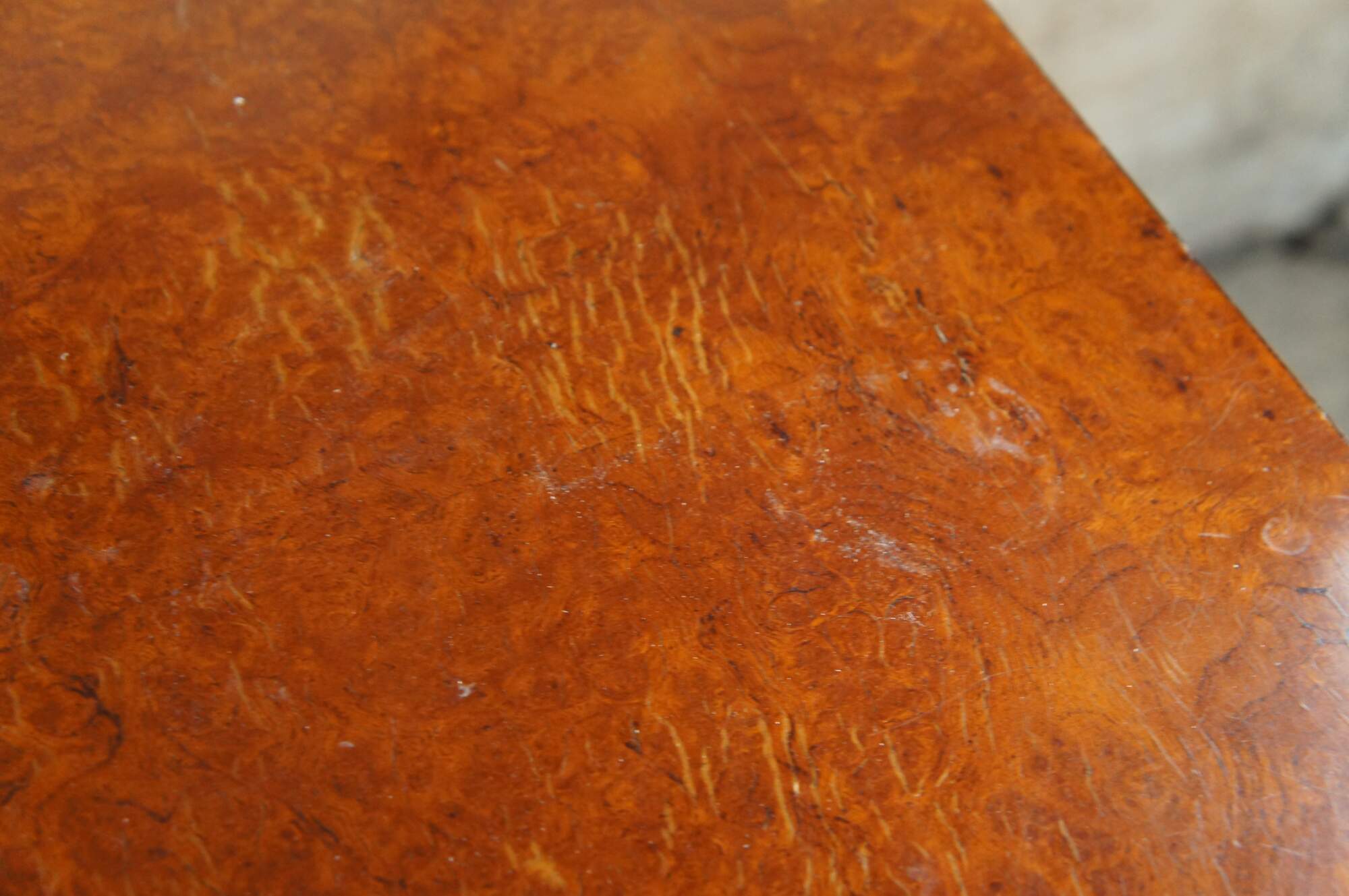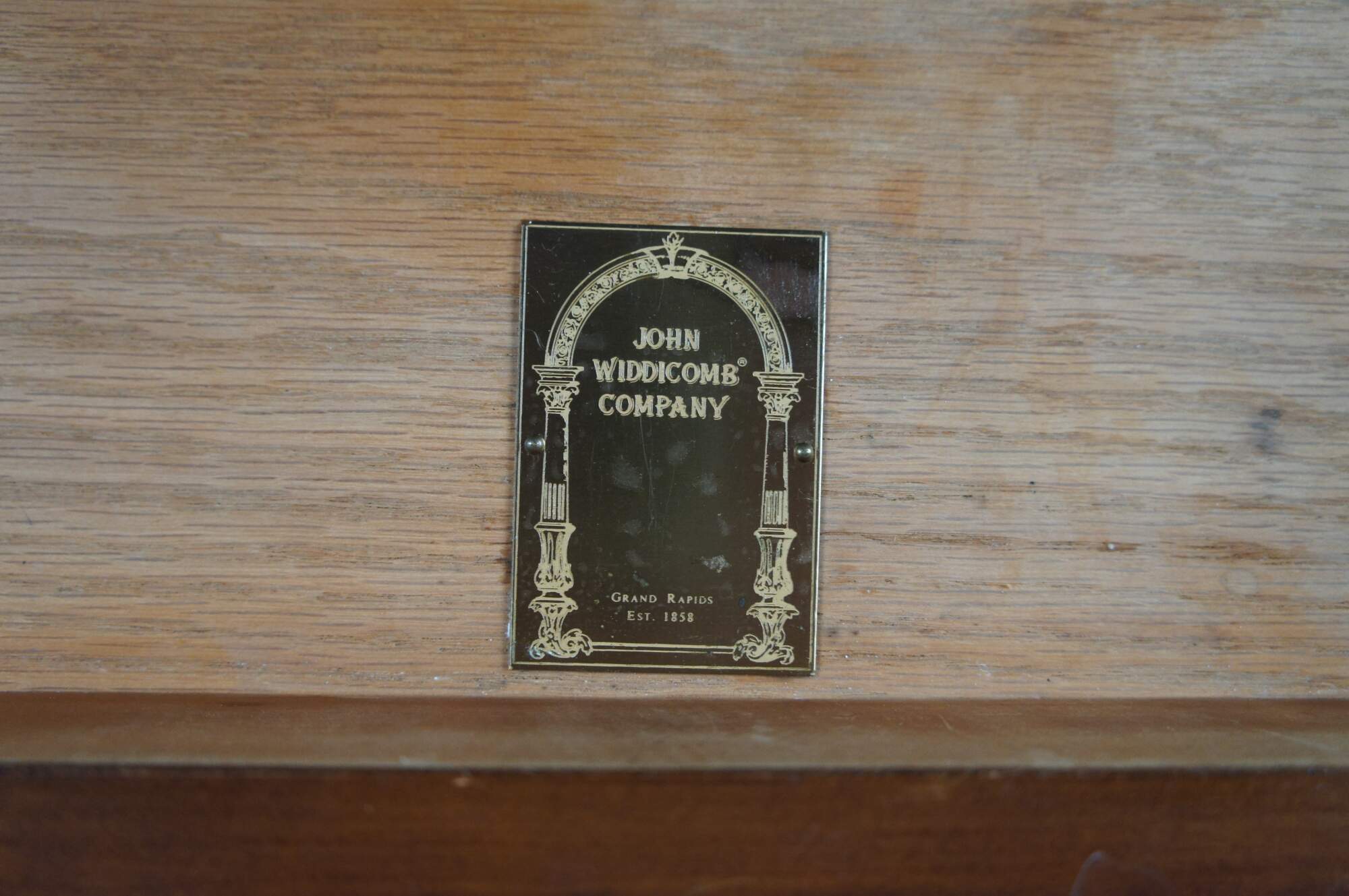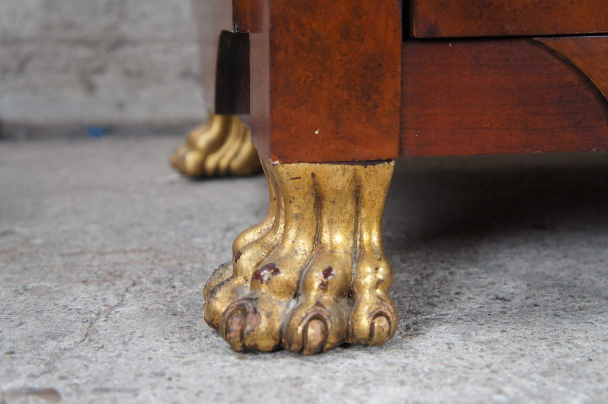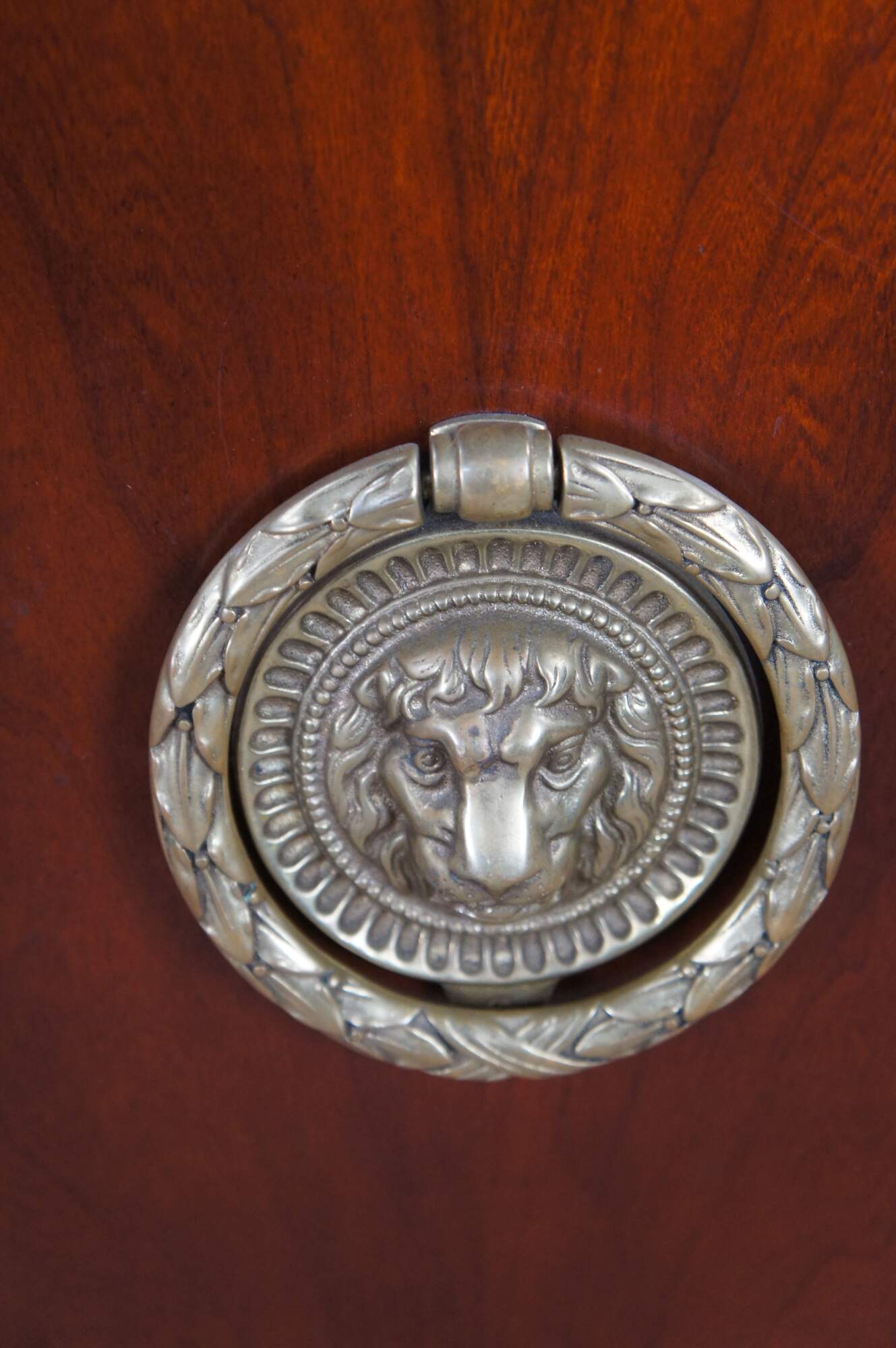 An exceptional nightstand or low cabinet by John Widdicomb. Part of their Russian Collection designed by Chad Womack in the 1970s. Features a cherry case with inset panels trimmed in brass, burled surfaces, gilt ormolu and paw feet. Features a hidden dovetailed drawer and a lower cabine with large lion knocker pull and interior with shelf. Makers mark on brass plate inside drawer