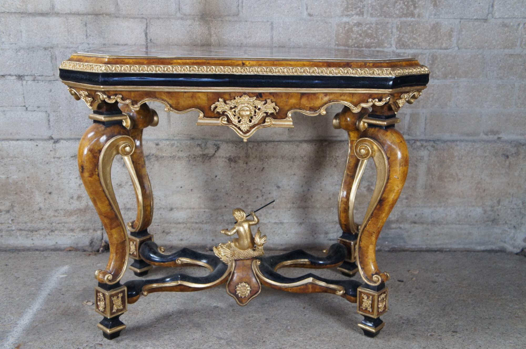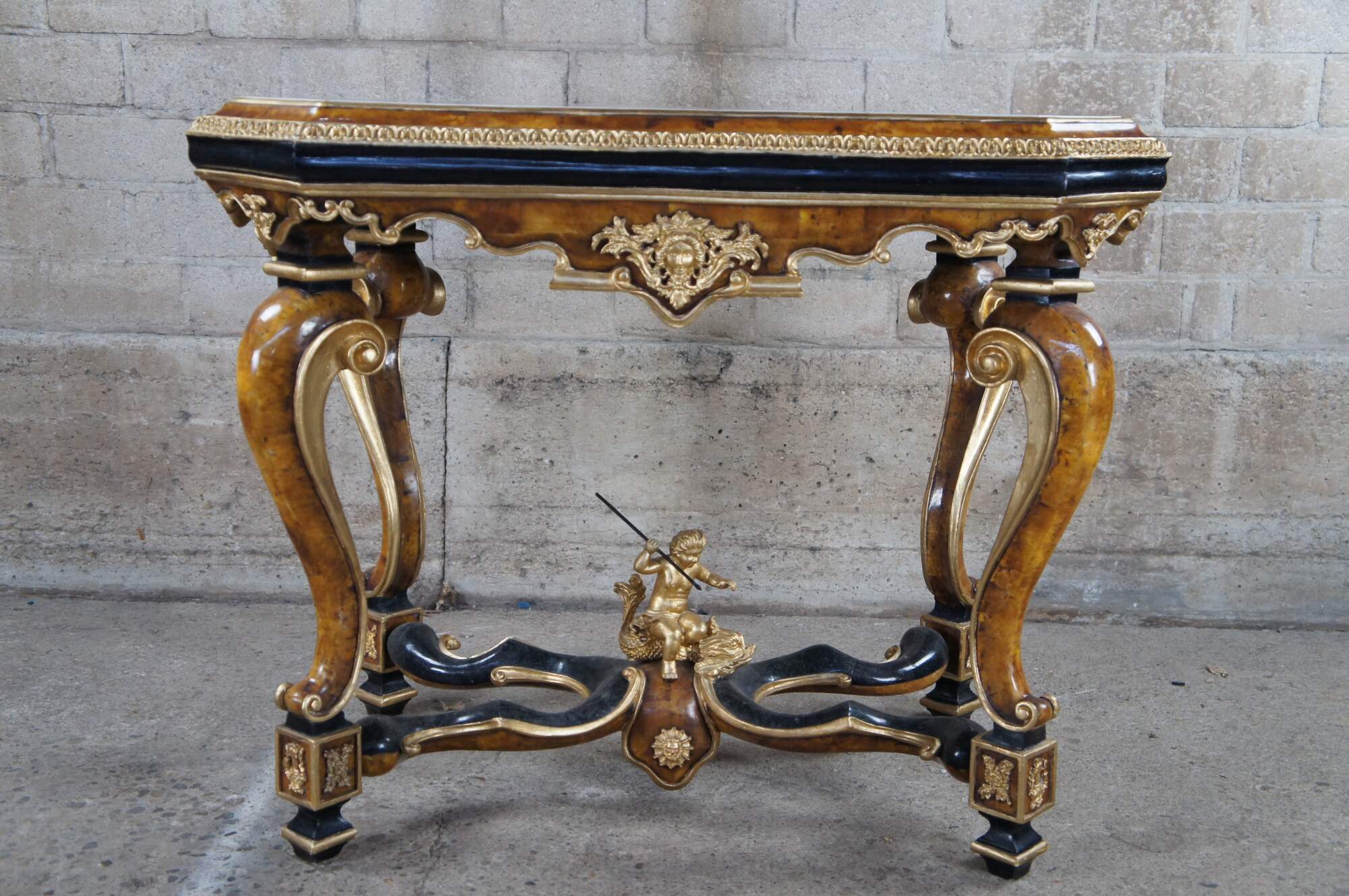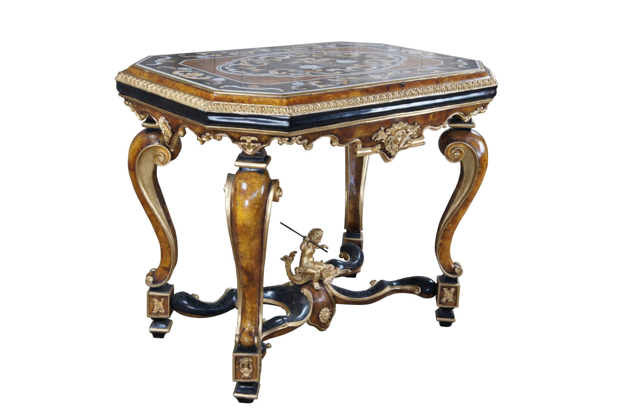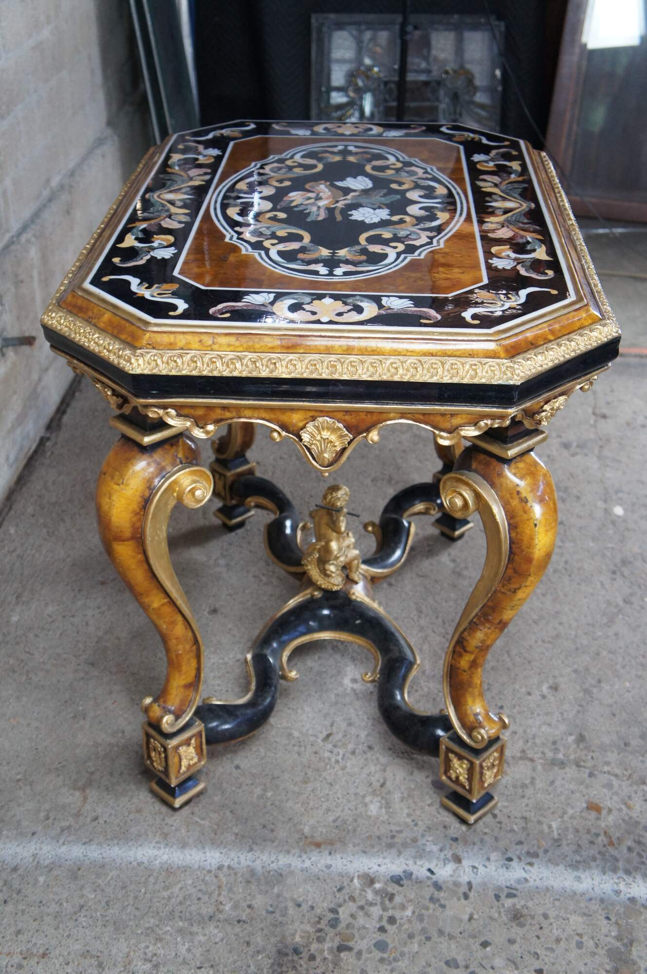 Monumental Italian Napoleon III inspired salon, centre or console table. Having a octagonal formed exotic pietra dura marble inlaid top with pen shell and stone inlays. Features a carved gilt molding resting on "S" scroll legs leading to blocked footed base connected by ornate "H" stretcher with a bronze putti holding a spear over a Dolphin. A true work of art that will make a statement in any space.