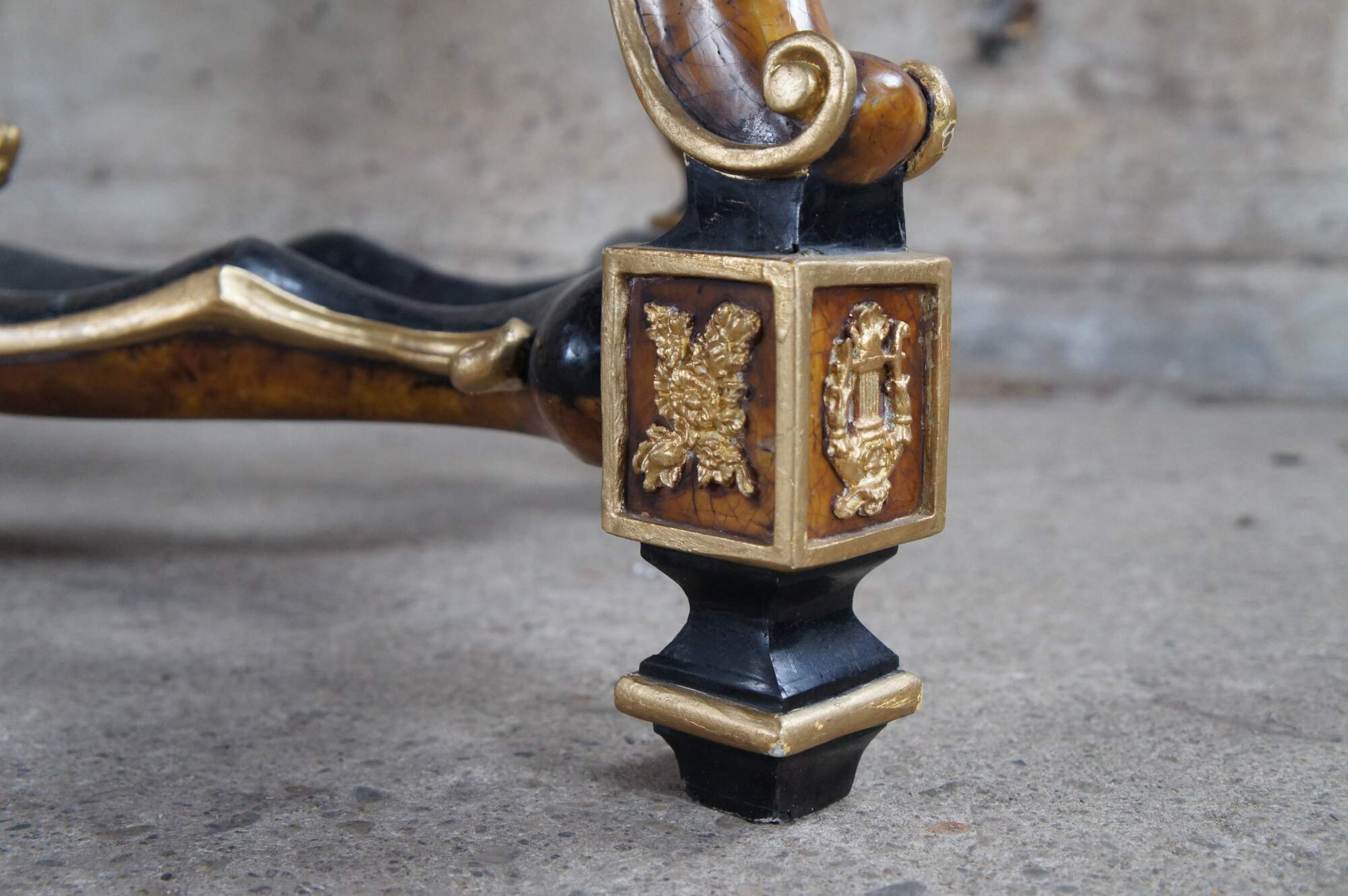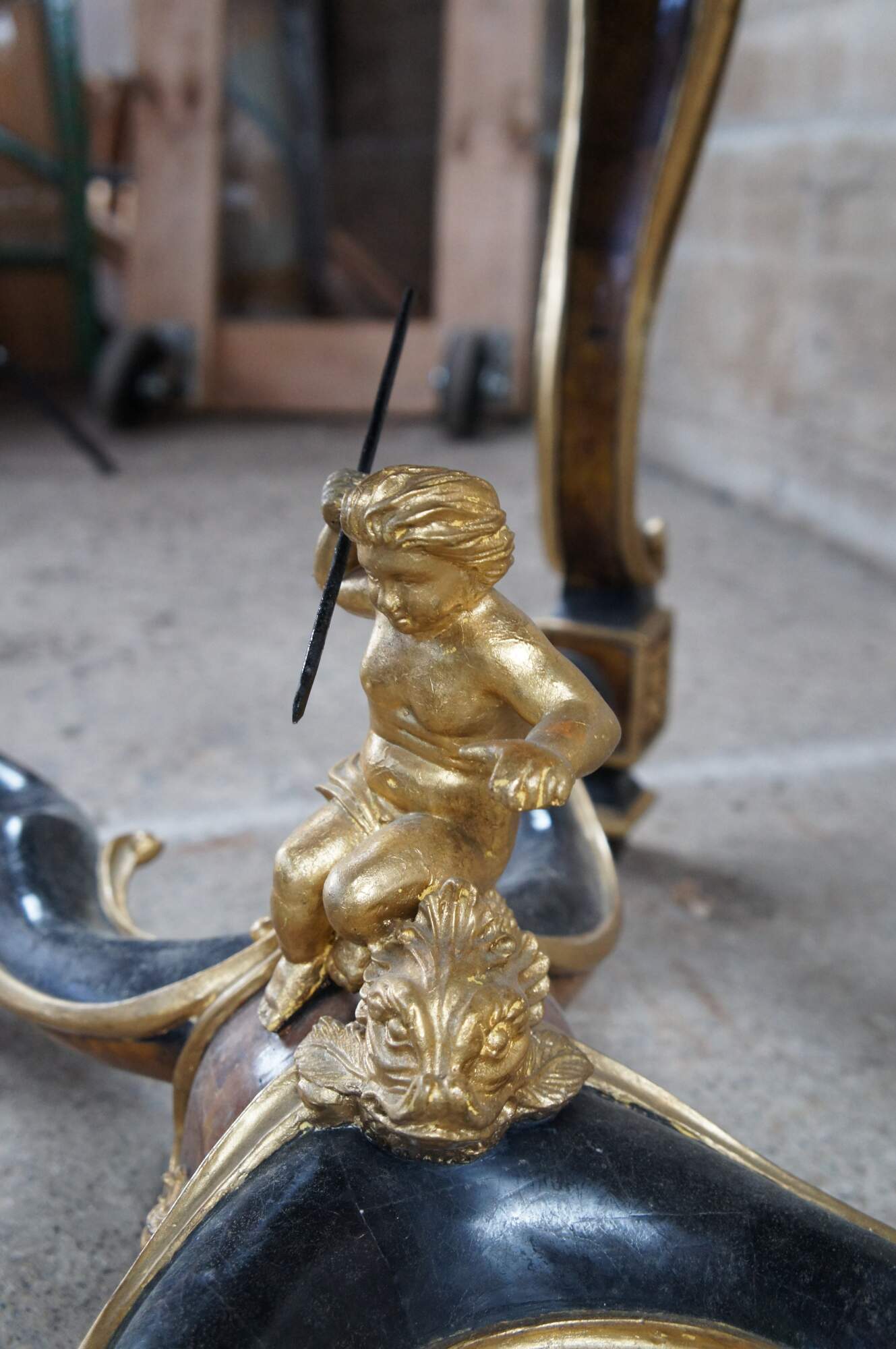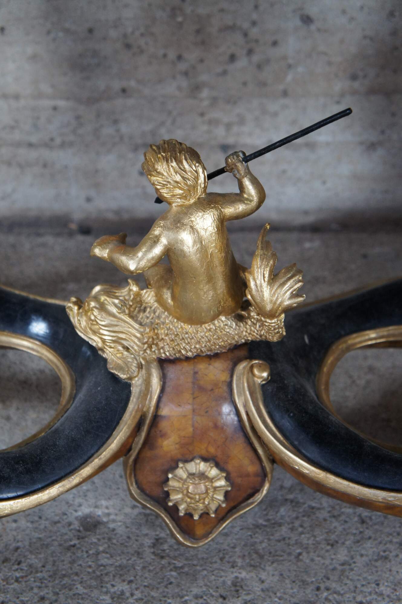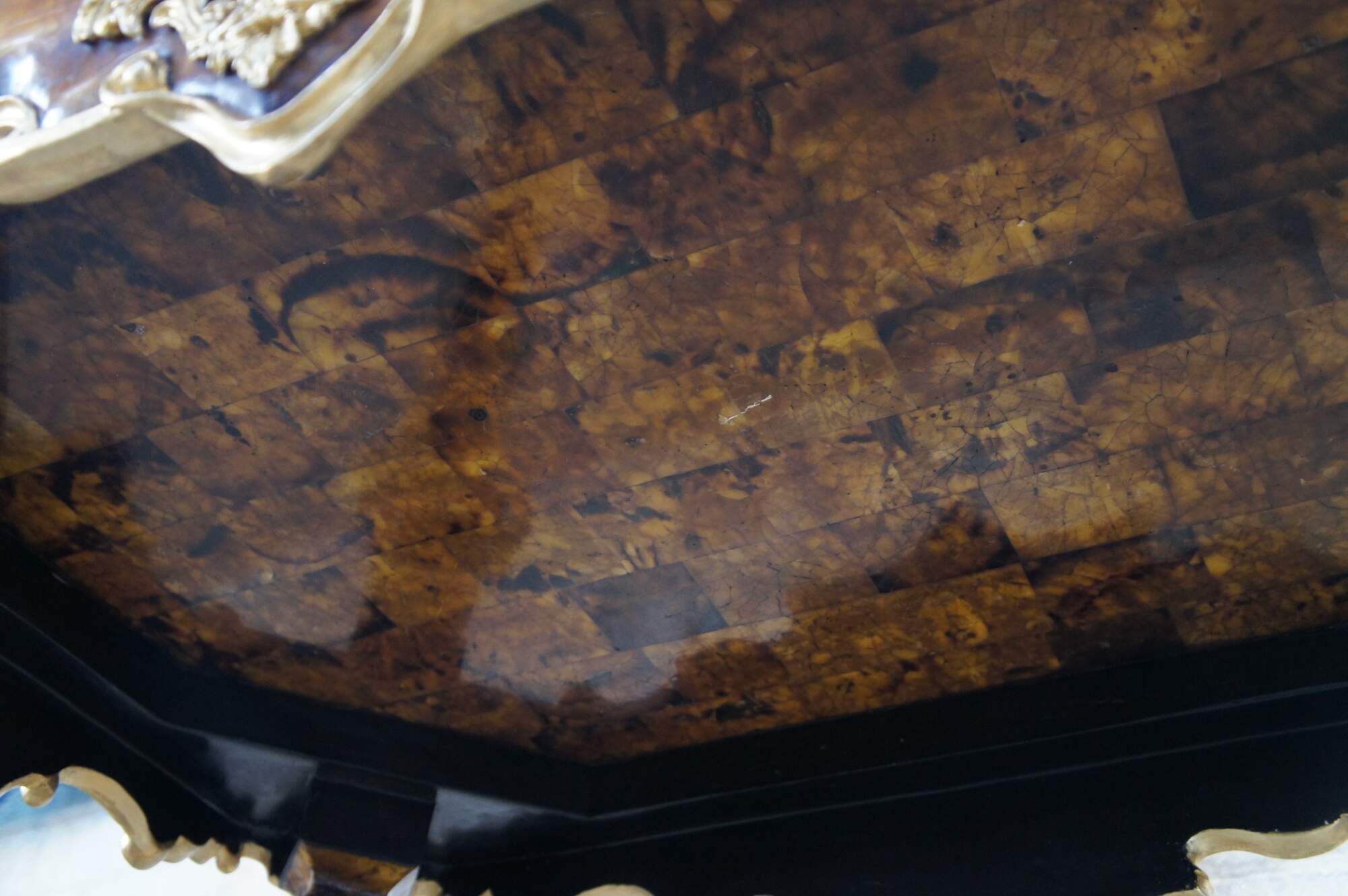 Monumental Italian Napoleon III inspired salon, centre or console table. Having a octagonal formed exotic pietra dura marble inlaid top with pen shell and stone inlays. Features a carved gilt molding resting on "S" scroll legs leading to blocked footed base connected by ornate "H" stretcher with a bronze putti holding a spear over a Dolphin. A true work of art that will make a statement in any space.