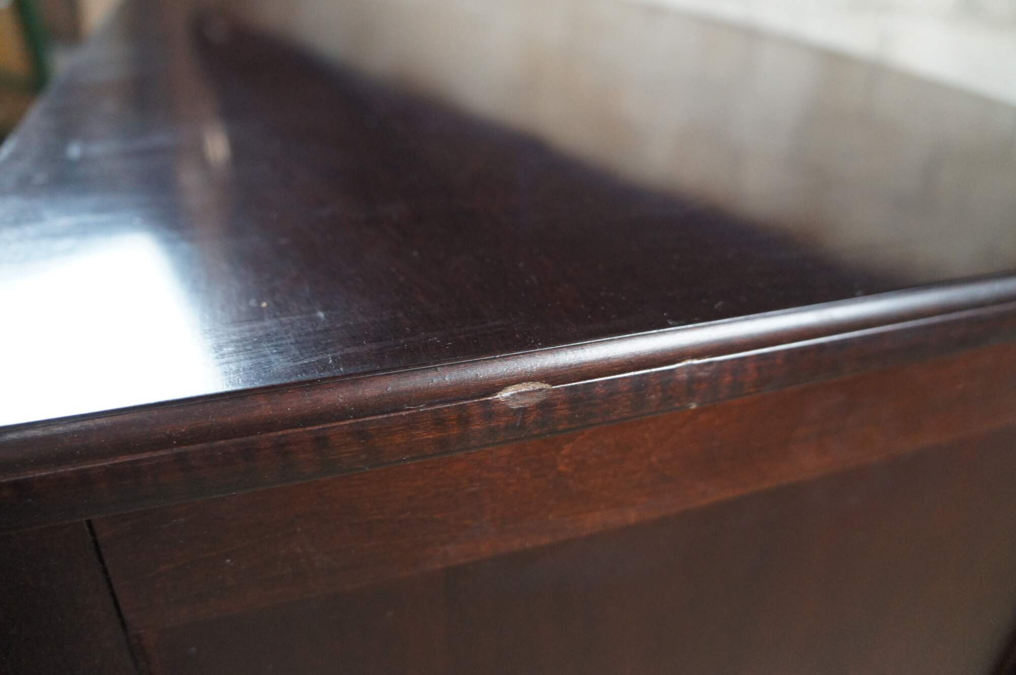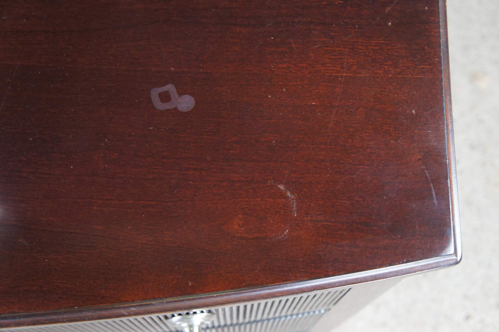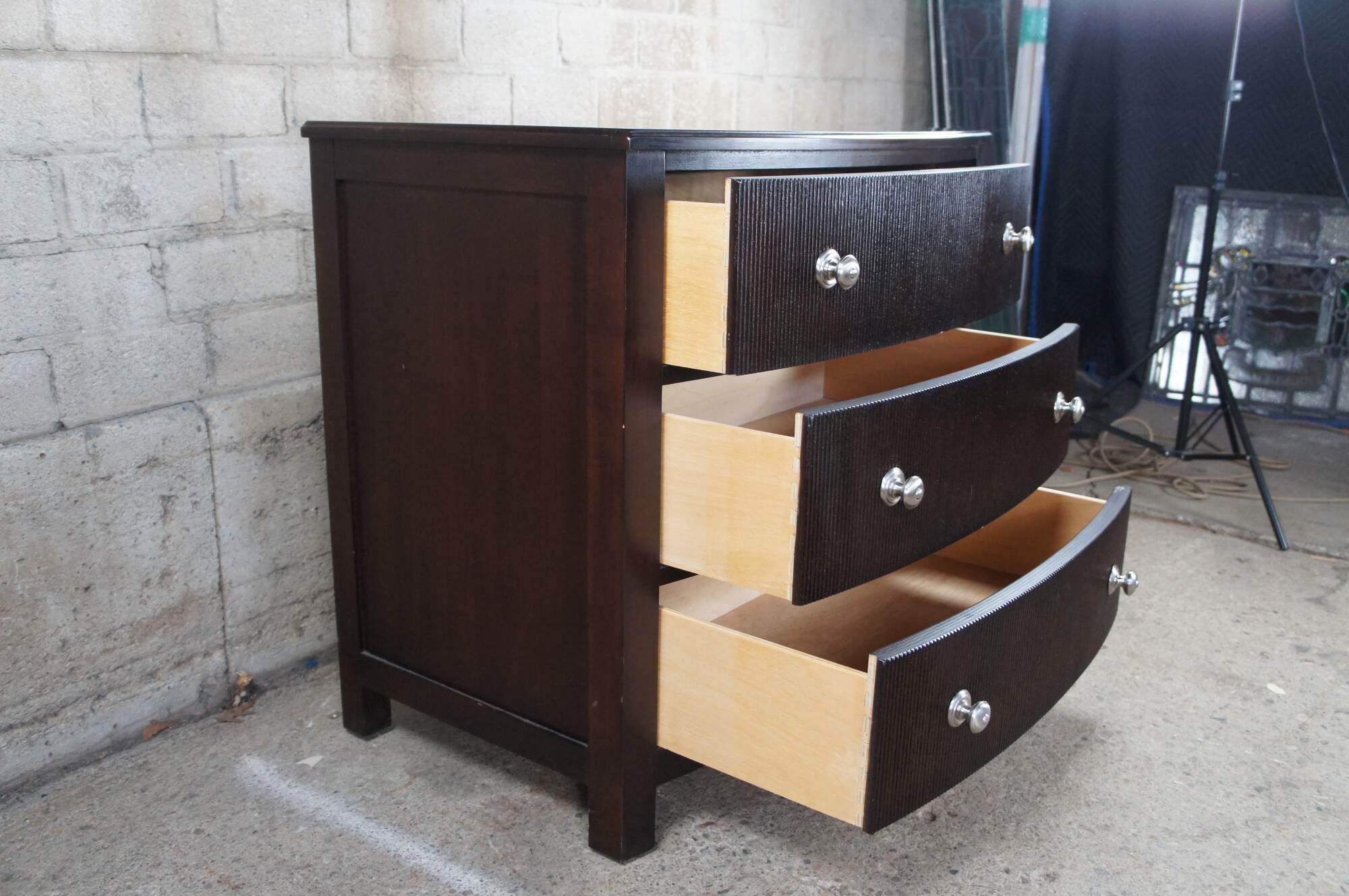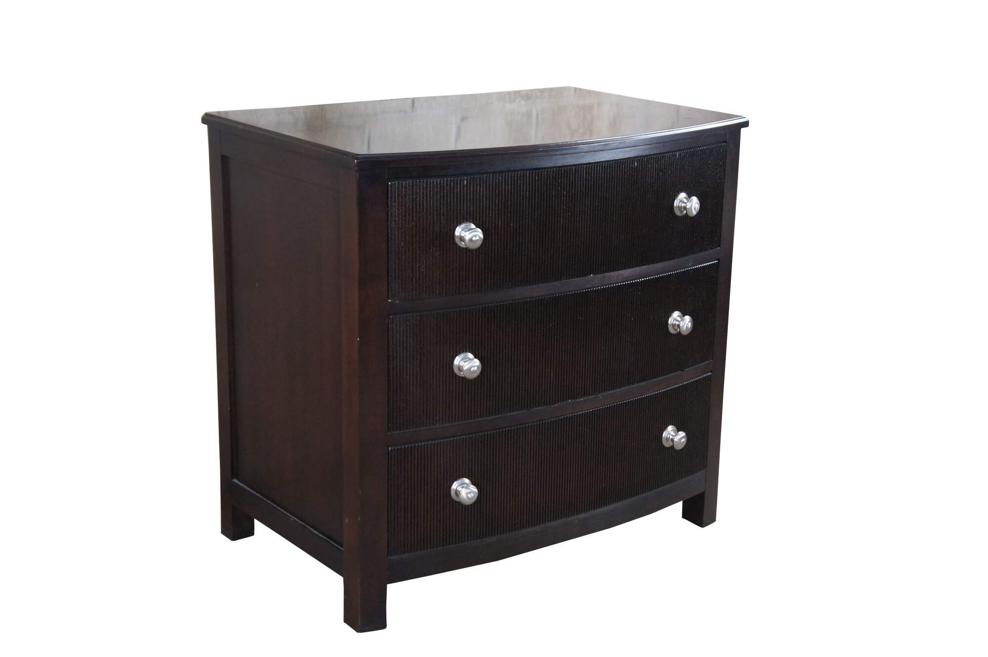 Nautica Home by Lexington Furniture commode or bedside table. Features a bow front with three dovetailed drawers. Drawer fronts are reeded with silver rounded pulls. Finished in cherry
