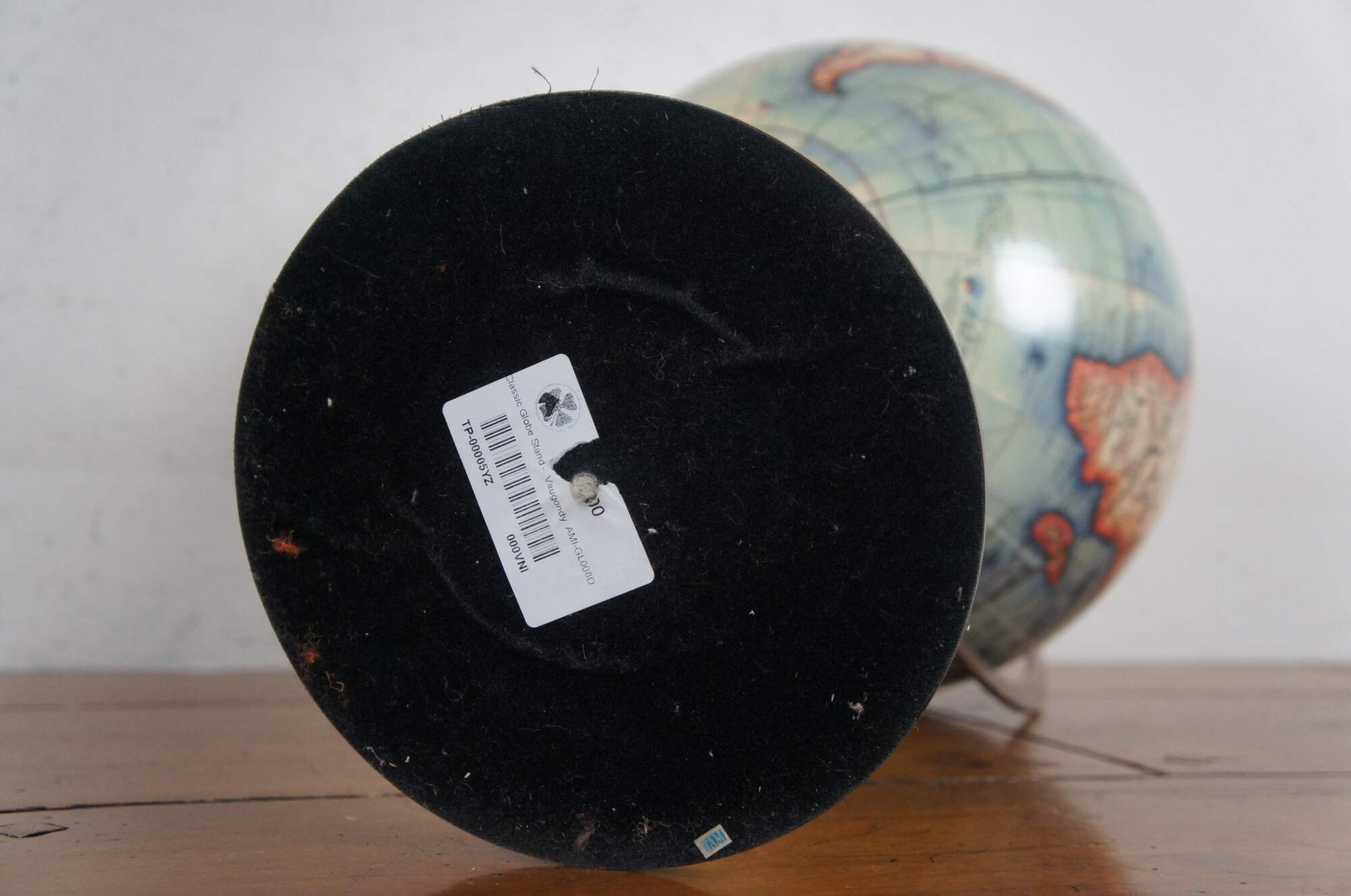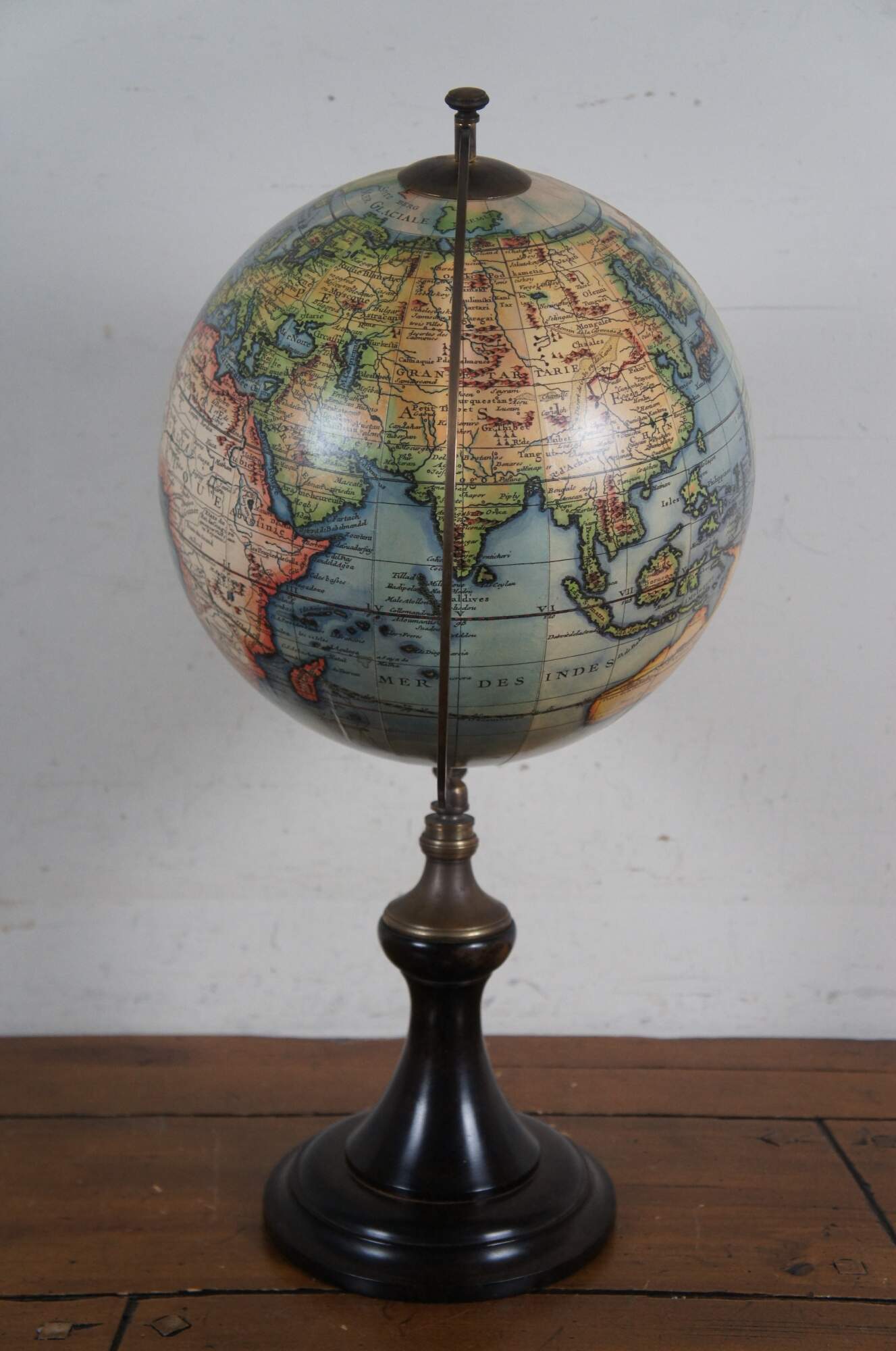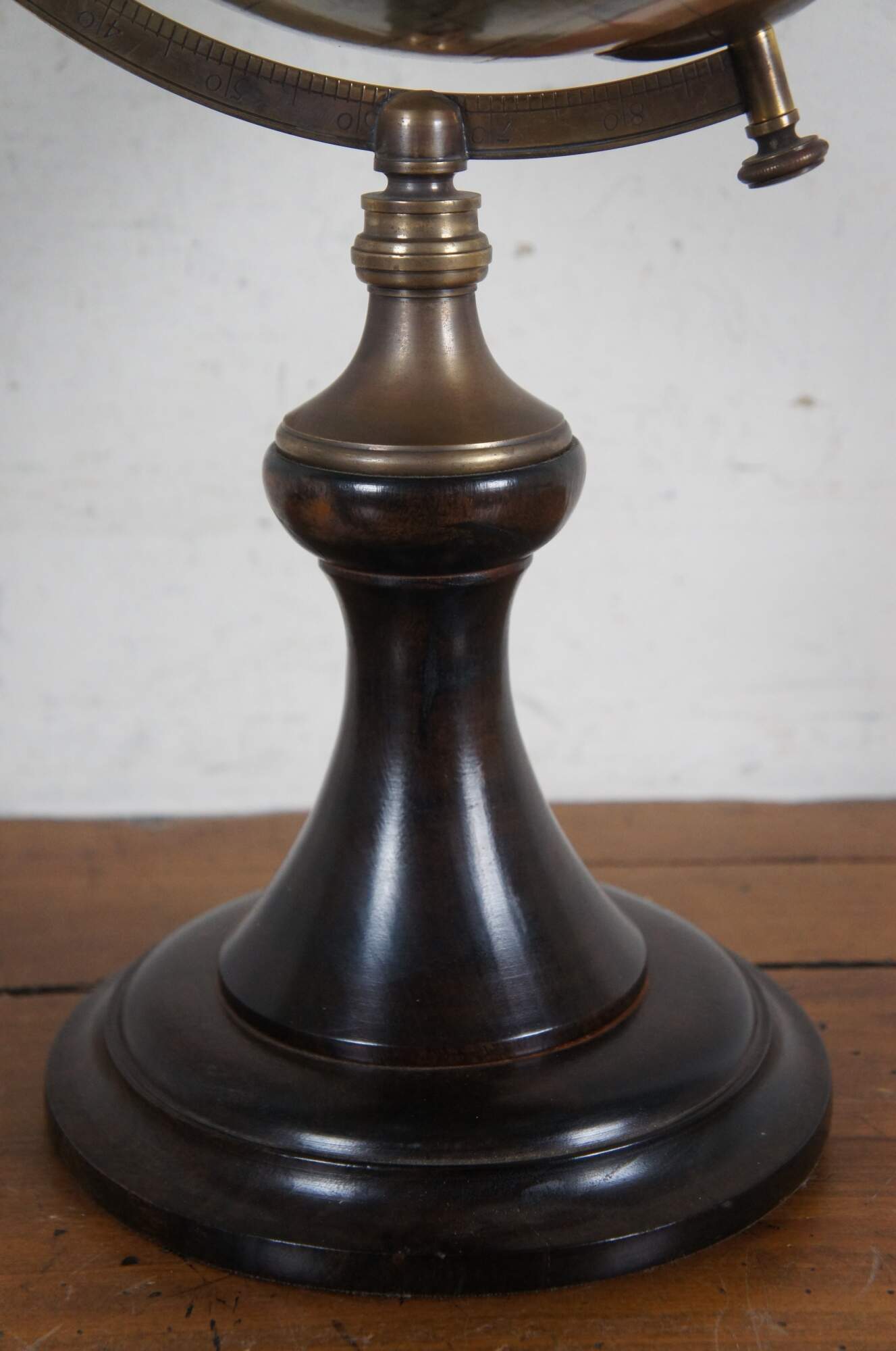 Late 20th century tabletop library globe with an elegant turned wood base and antique brass meridian. Globe is modeled on a 1745 edition by Gilles and Didier Robert De Vaugondy. Produced by AM India. Terrestrial Globe, A Paris.