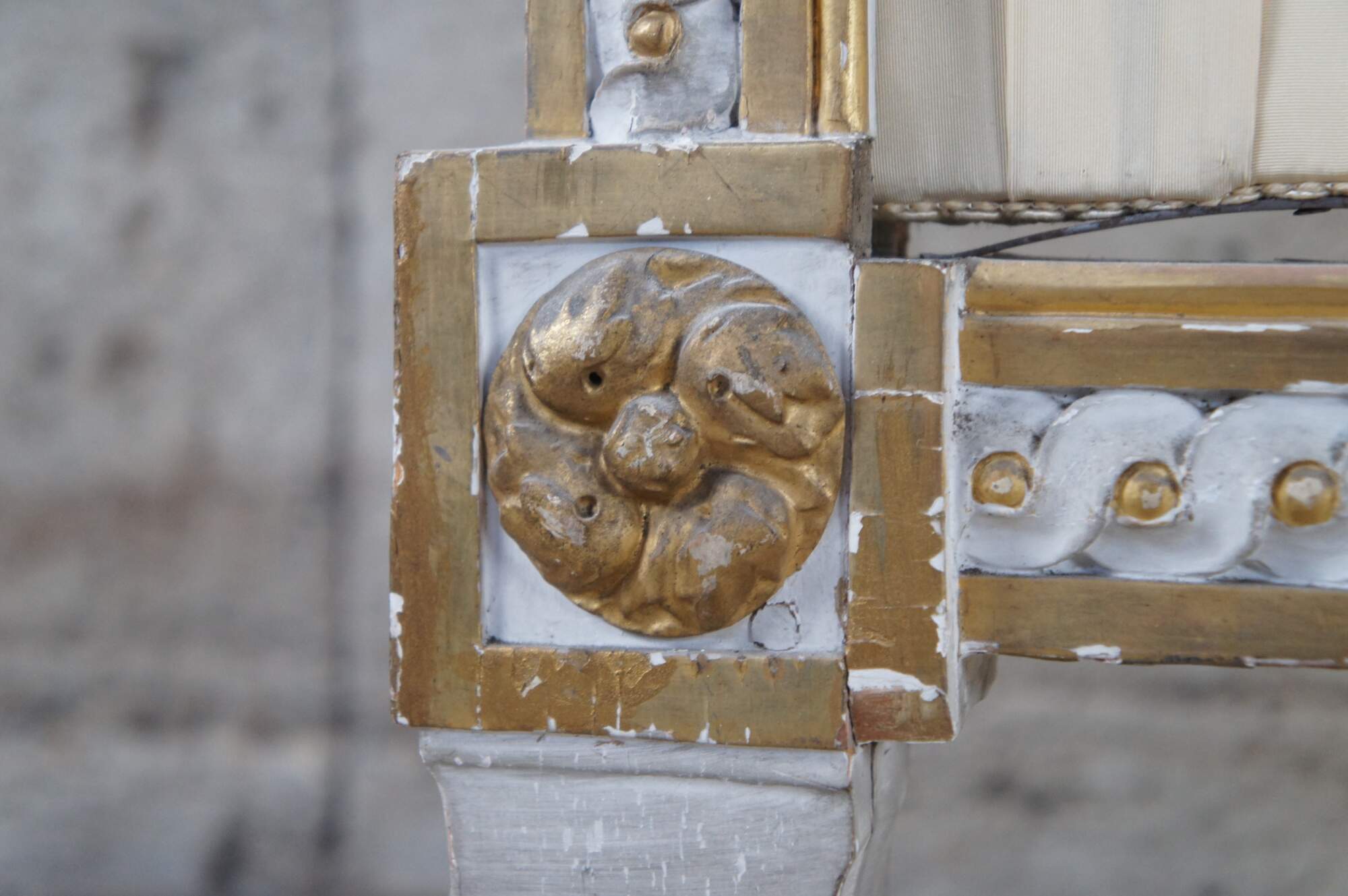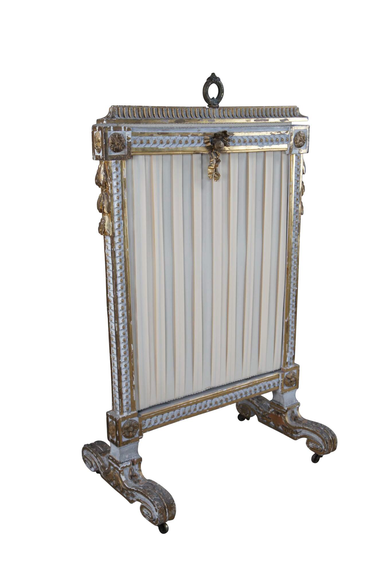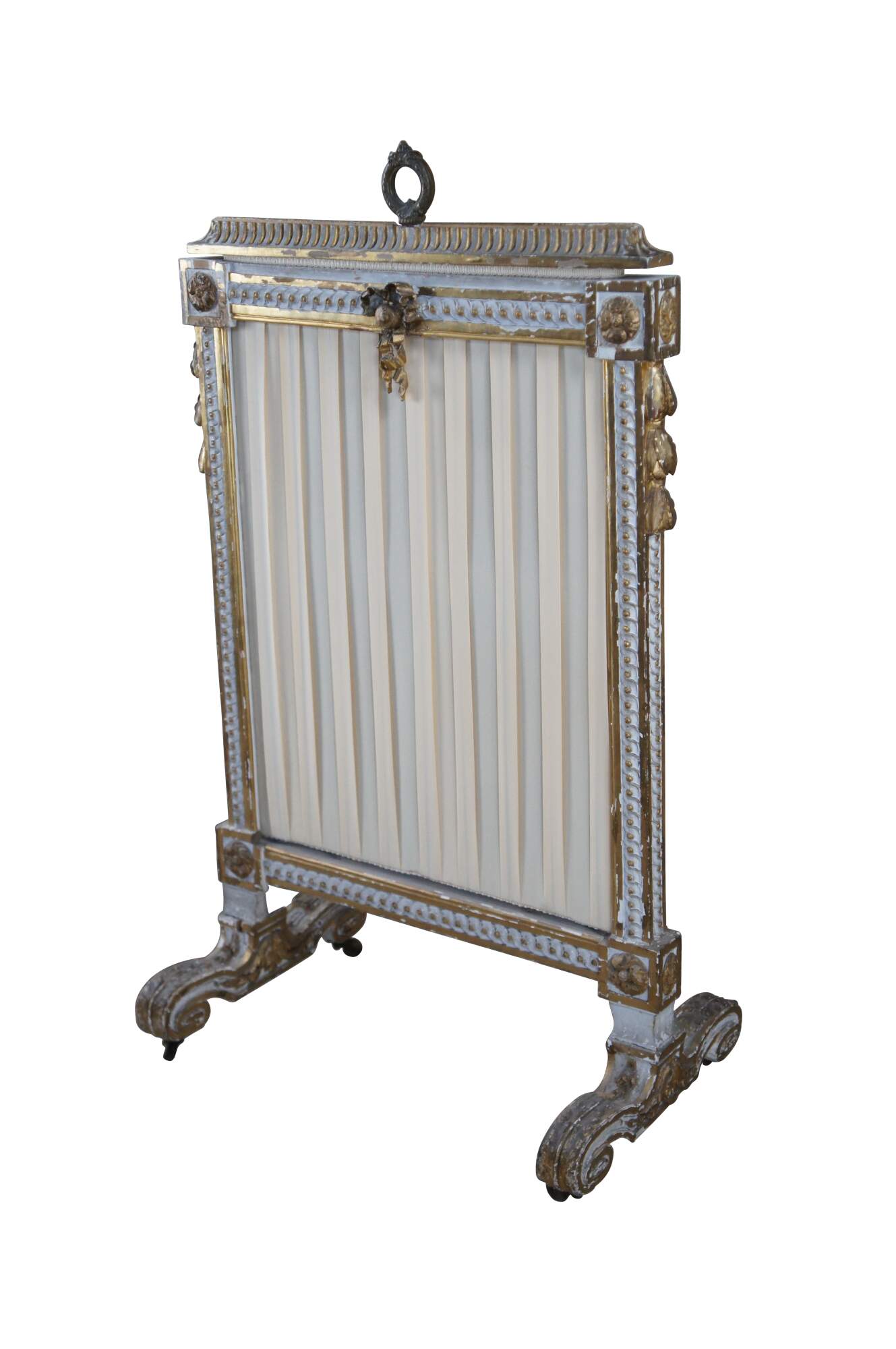 Antique 19th century Louis XVI fire screen / hearth ware. Made of wood featuring Neoclassical styling with gold gilt carved ribbons / bows and floral acanthus designs.
