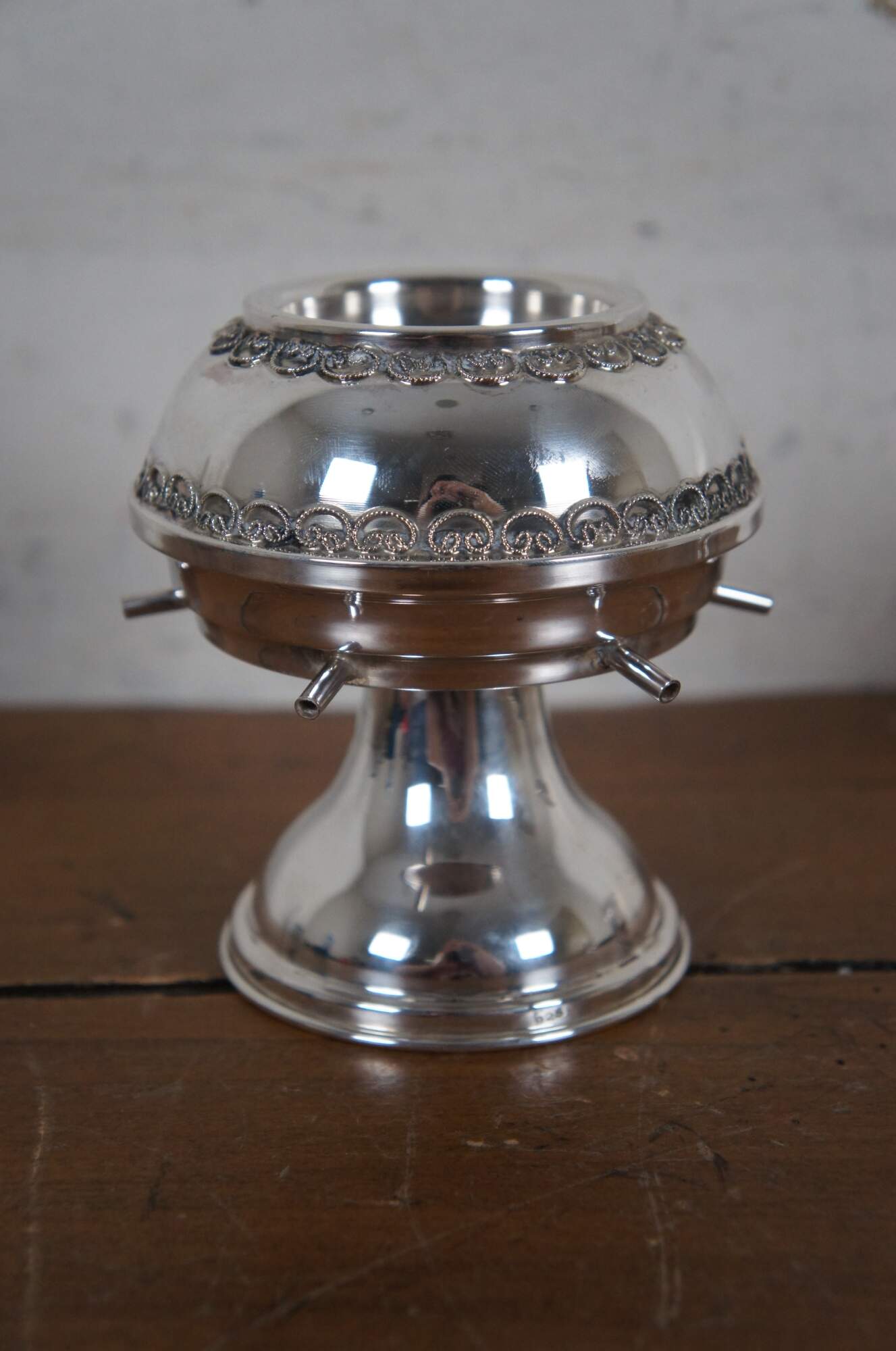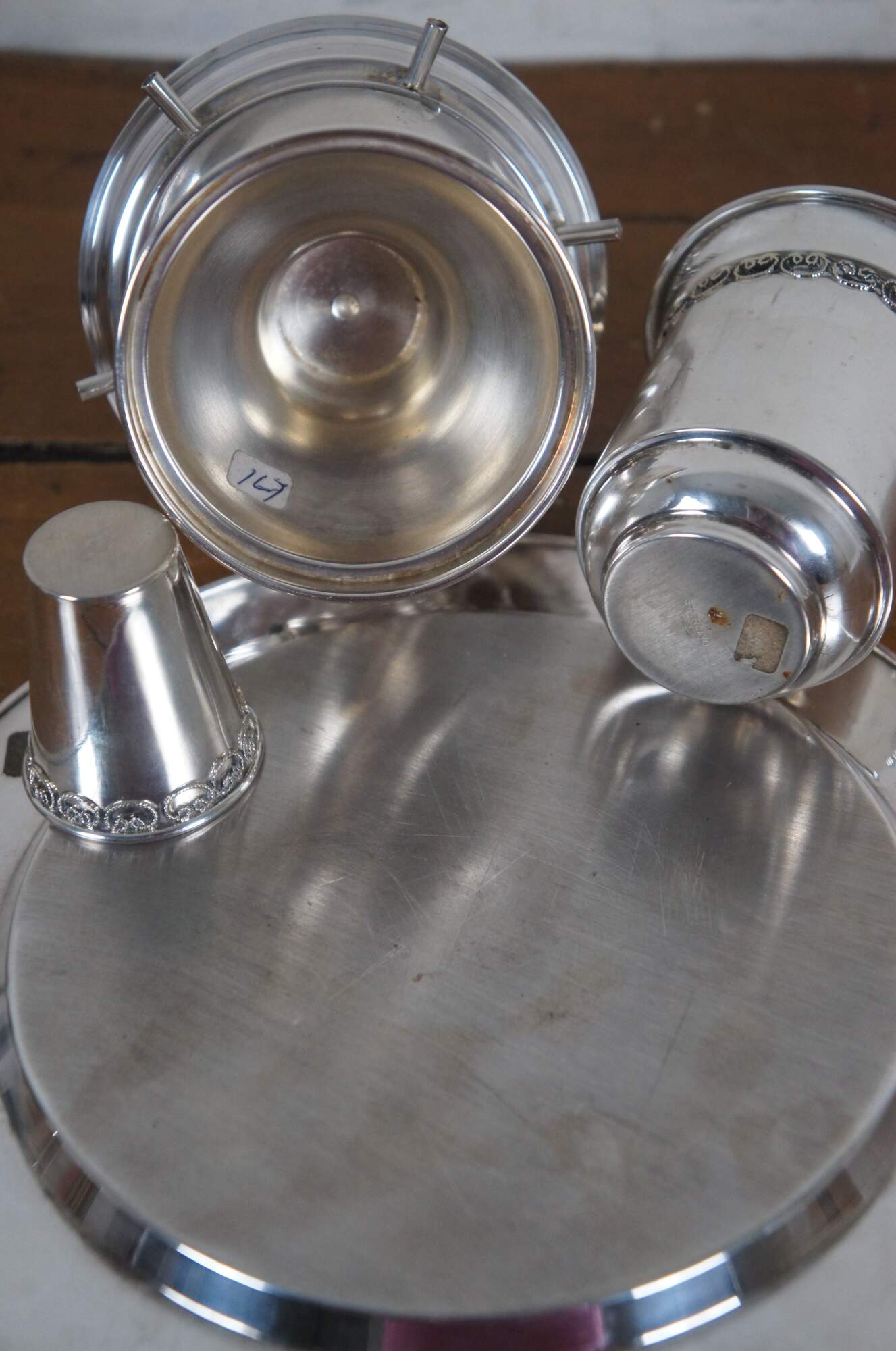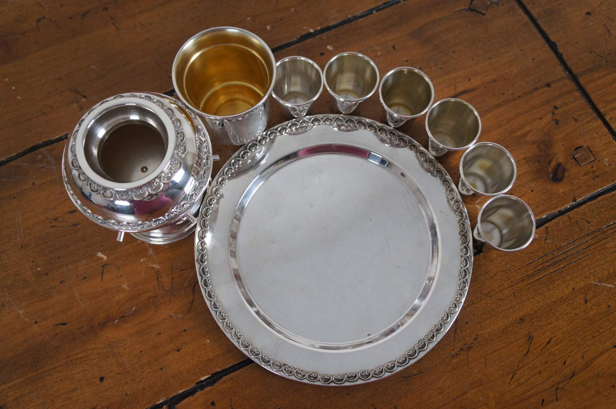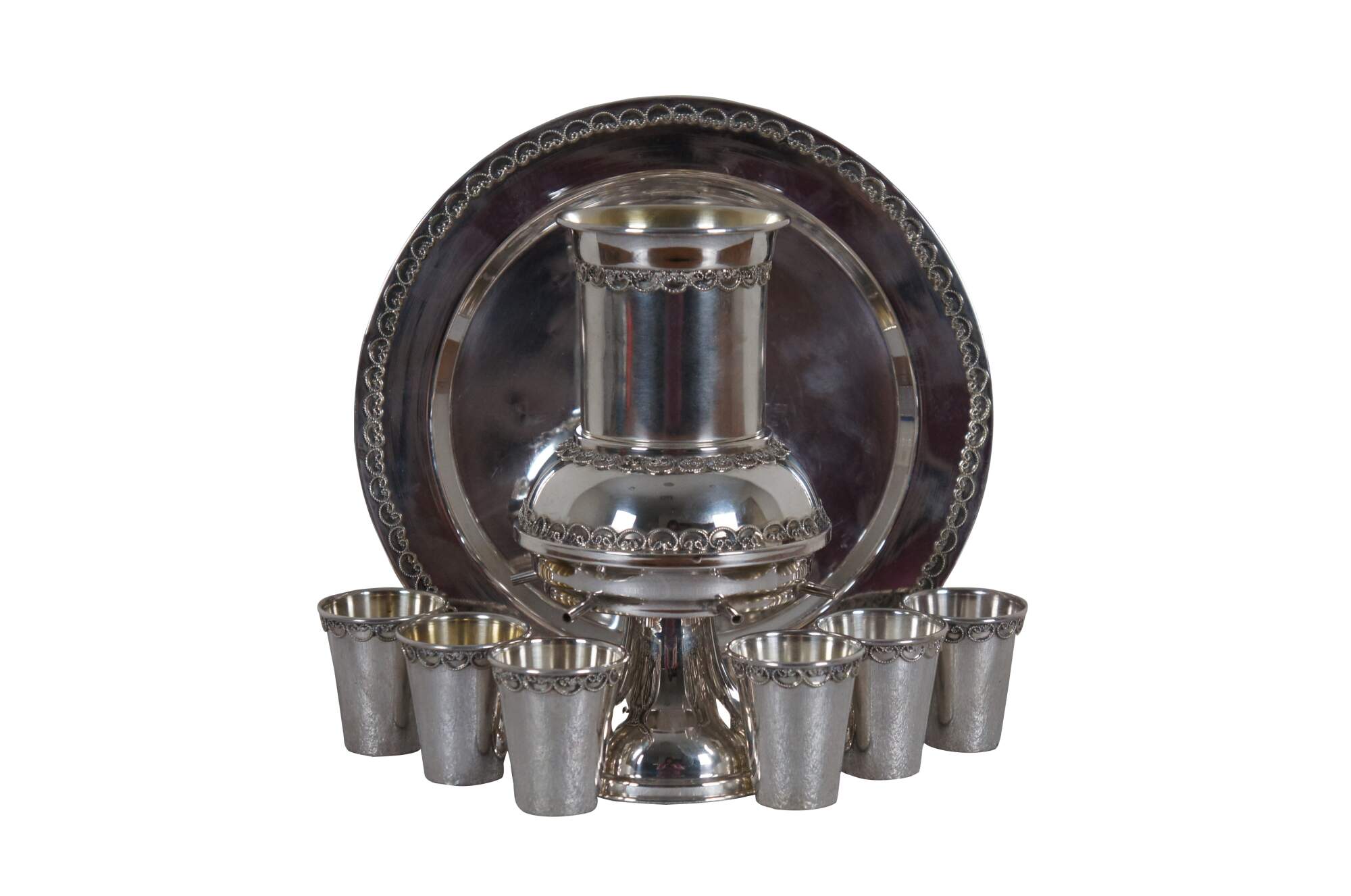 Vintage 925 sterling silver kiddush wine fountain set, decorated with bands of repeated filigree swirls. Set includes six cups, underplate, fountain and wine cup.