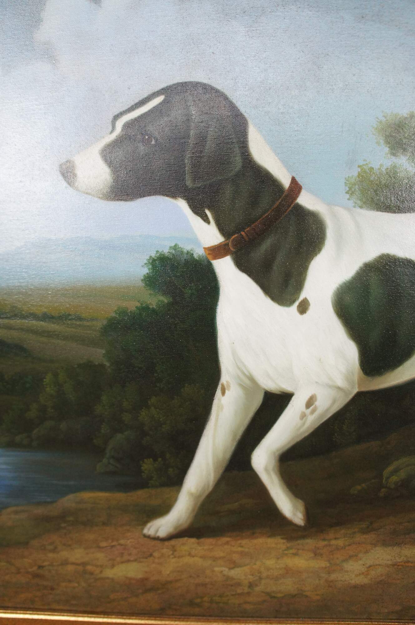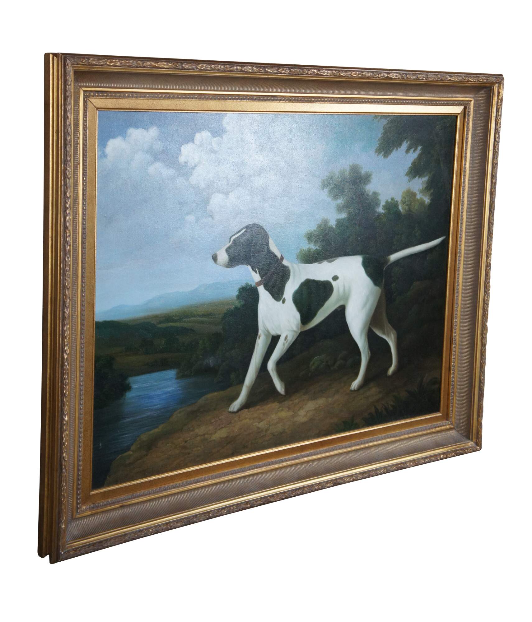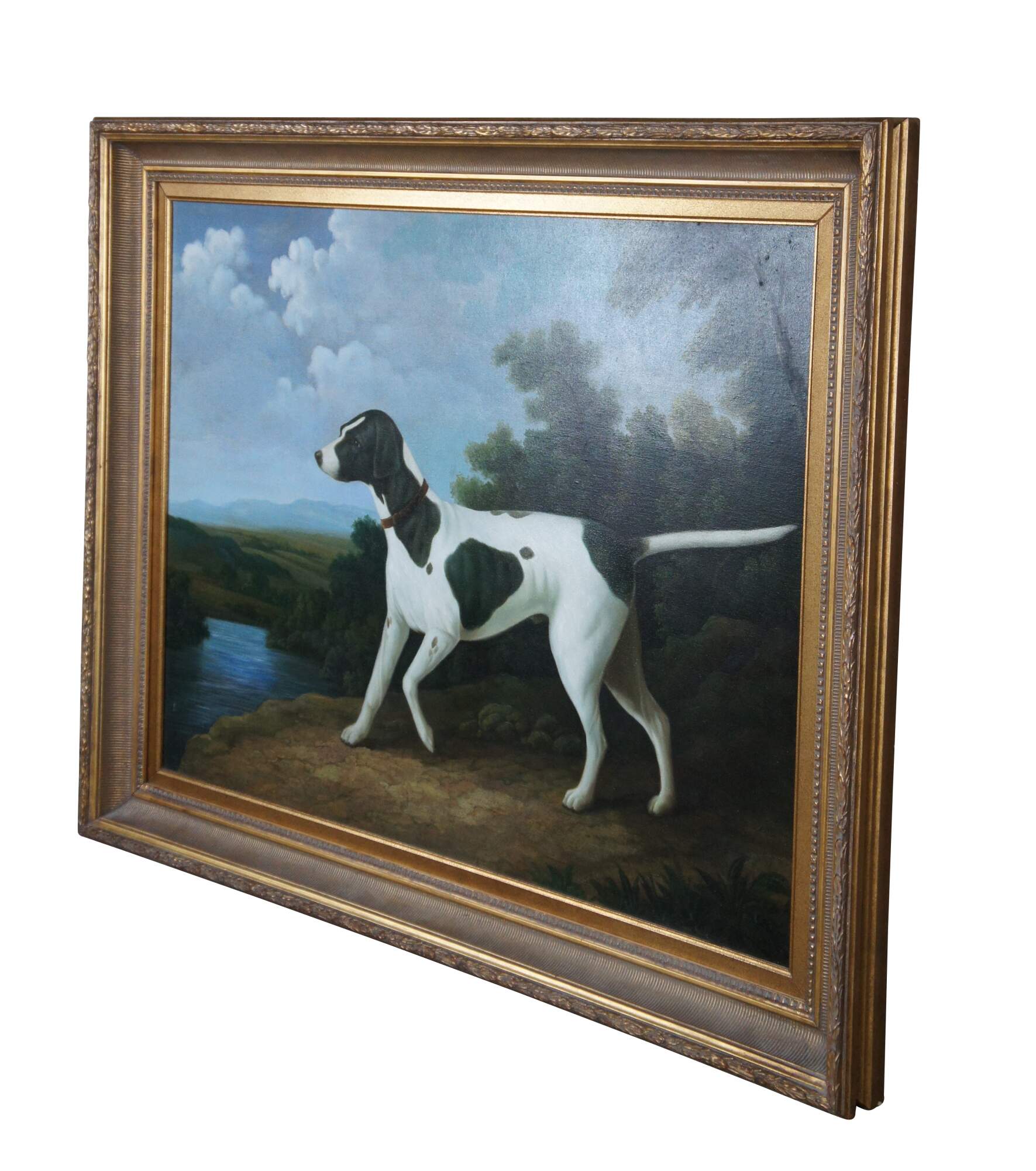 A large oil painting of an English Pointer posing on the edge of a trail over a river. A landscape of water, rock outcroppings, trees and mountains can be seen in the background. The pointer is white with black spots. The oil painting is on canvas. Framed in a gold finished wood frame with beading, and acanthus accents. Circa 20th Century, unsigned.