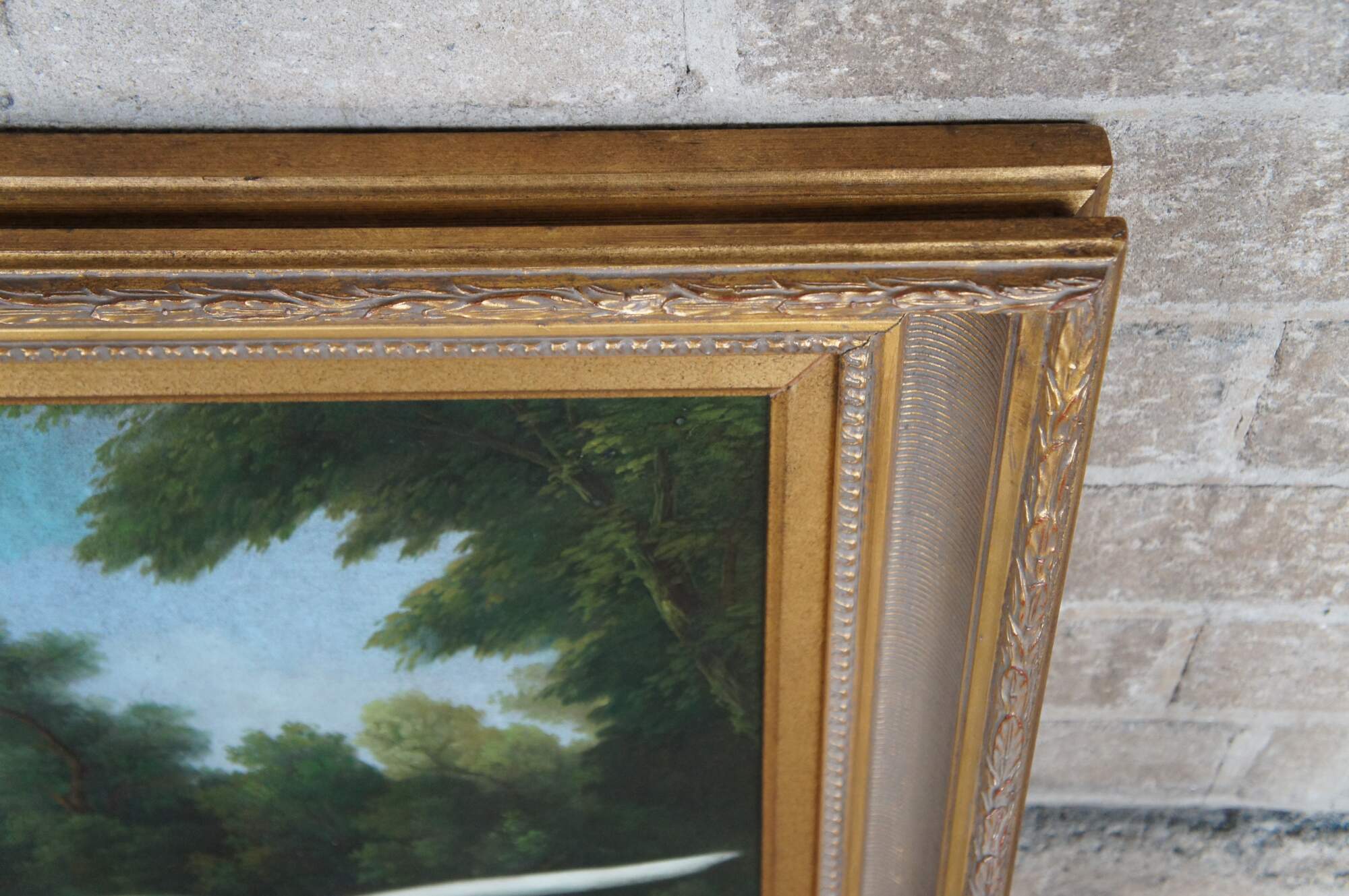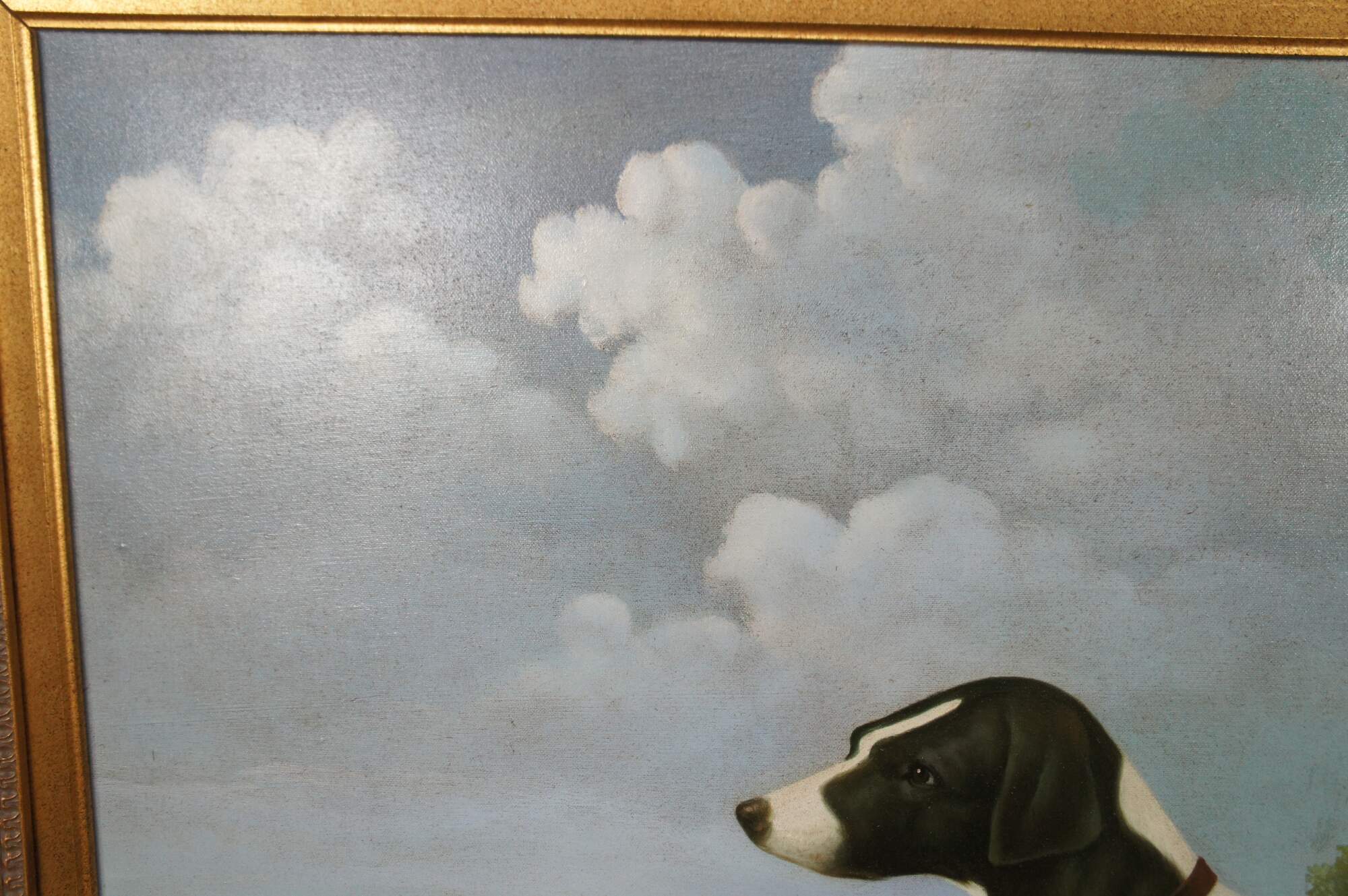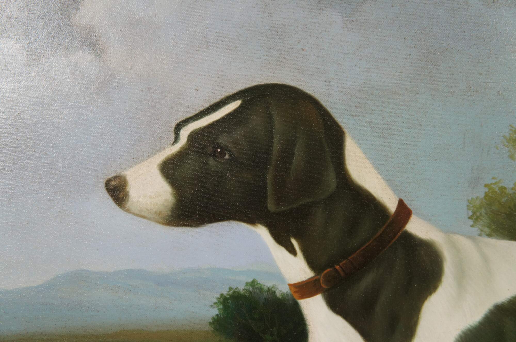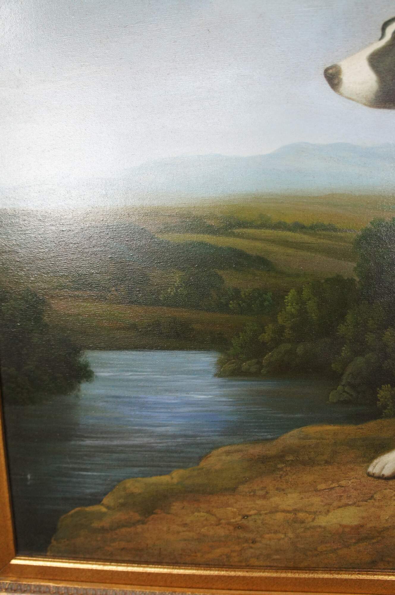A large oil painting of an English Pointer posing on the edge of a trail over a river. A landscape of water, rock outcroppings, trees and mountains can be seen in the background. The pointer is white with black spots. The oil painting is on canvas. Framed in a gold finished wood frame with beading, and acanthus accents. Circa 20th Century, unsigned.