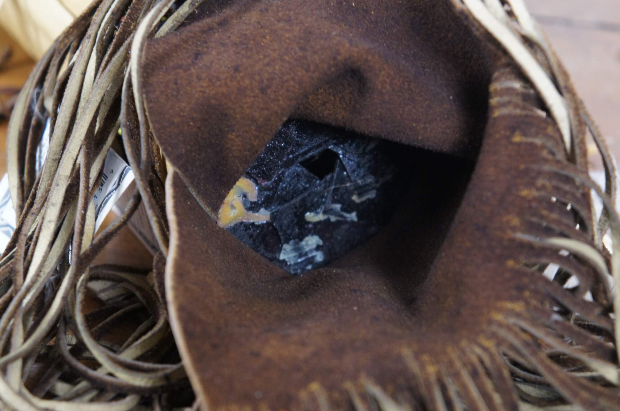 Late 20th century Native American deerskin leather quiver. Beaded bands around top and base, soft leather fringe at bottom, decorated with feathers, beads, several pieces of animal bone, quartz prism, arrowhead and medicine bag. Crafted by Jannee Martinez, Navajo, Census #413301.
