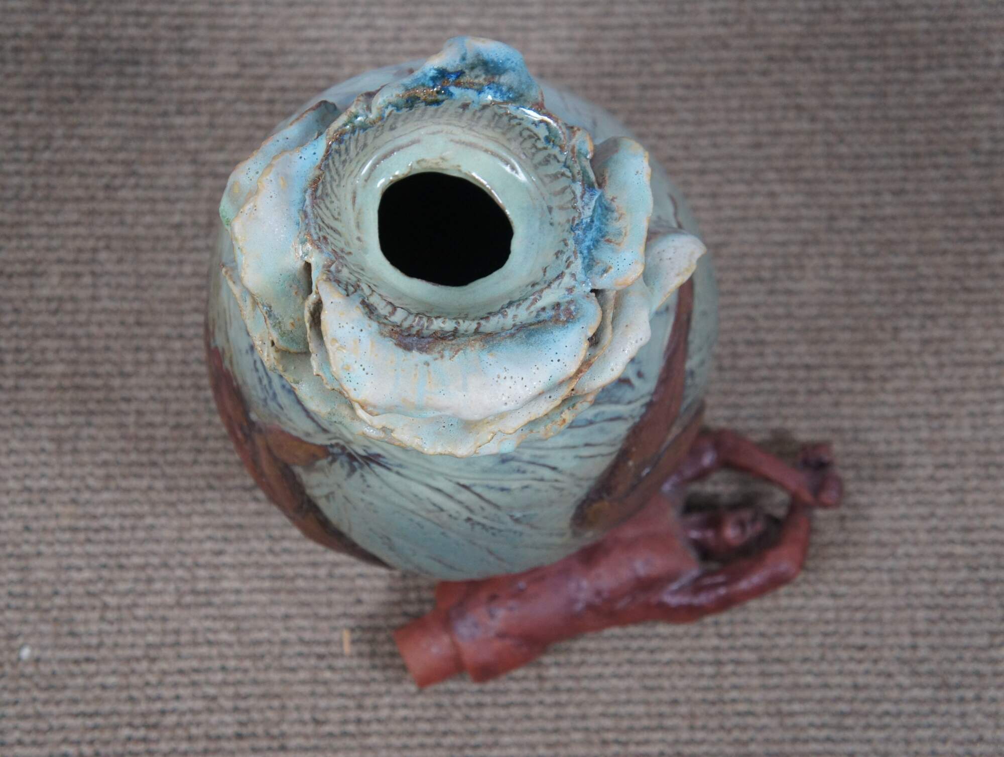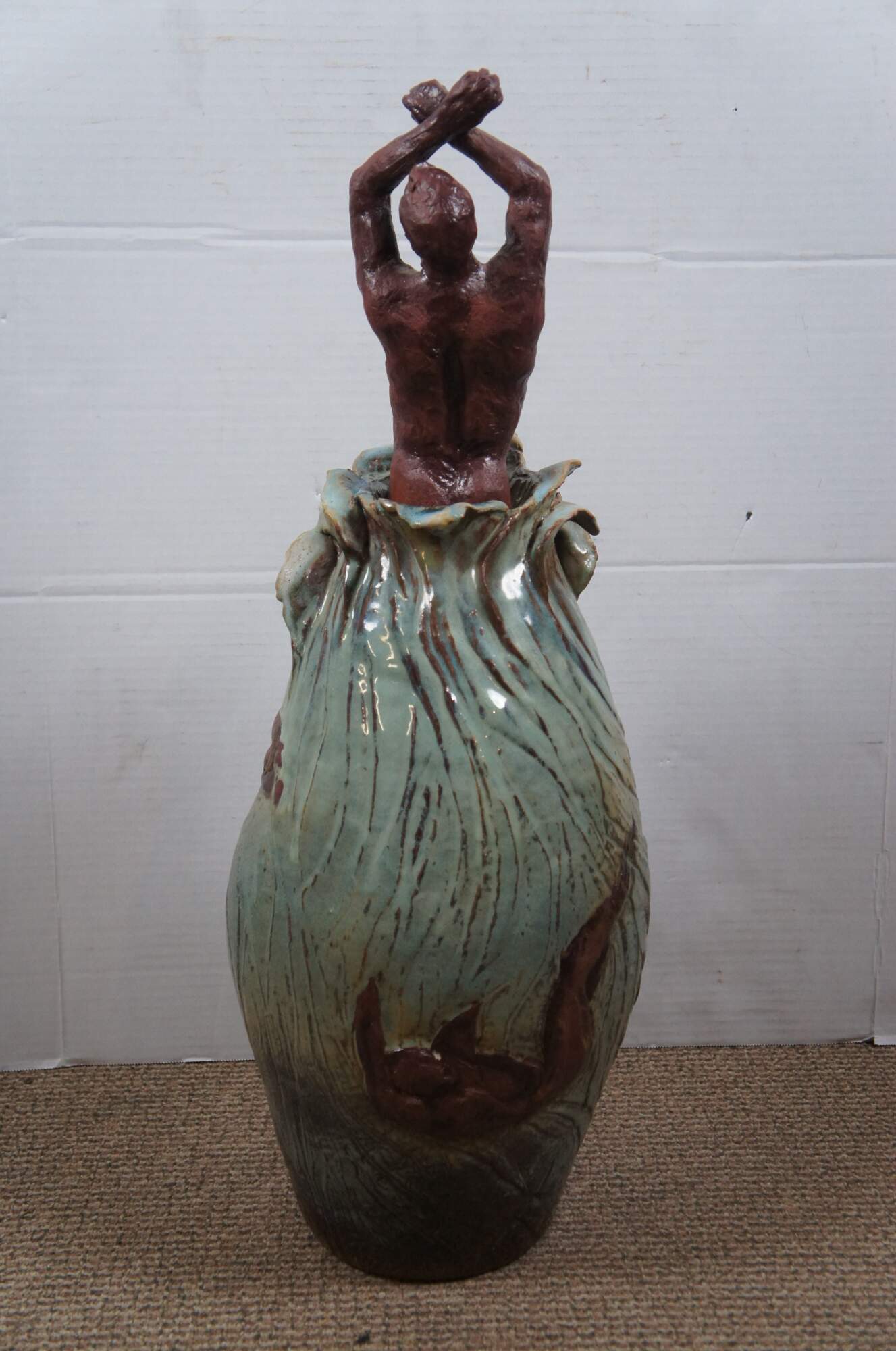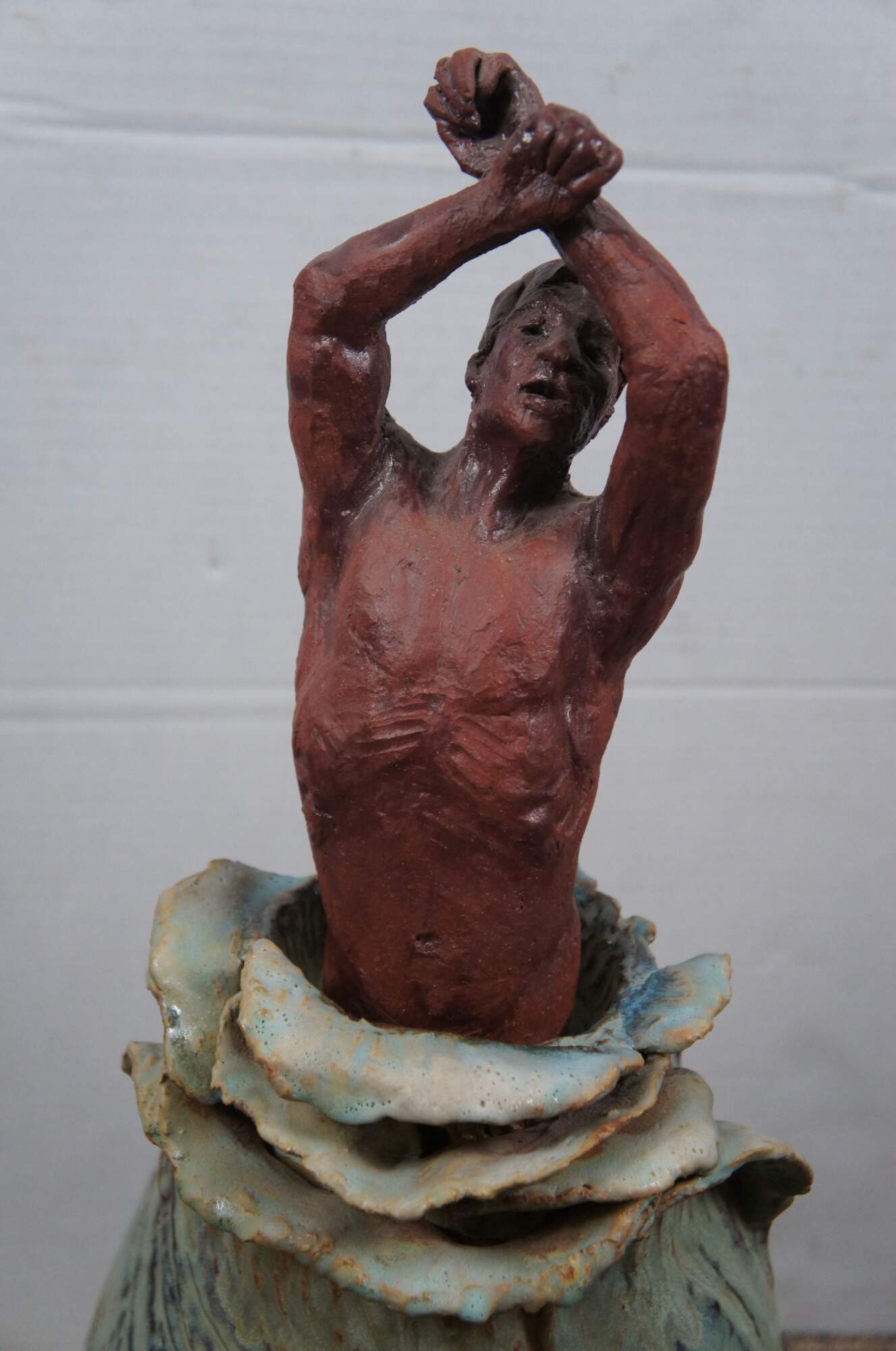 Vintage ceramic art sculpture by Bob Coates. Features a male figure emerging from the waist up from a swirling green base that resembles ocean waves or a veined flower bud, decorated with other brown figures in various dancing / falling attitudes. Signed Coates '02