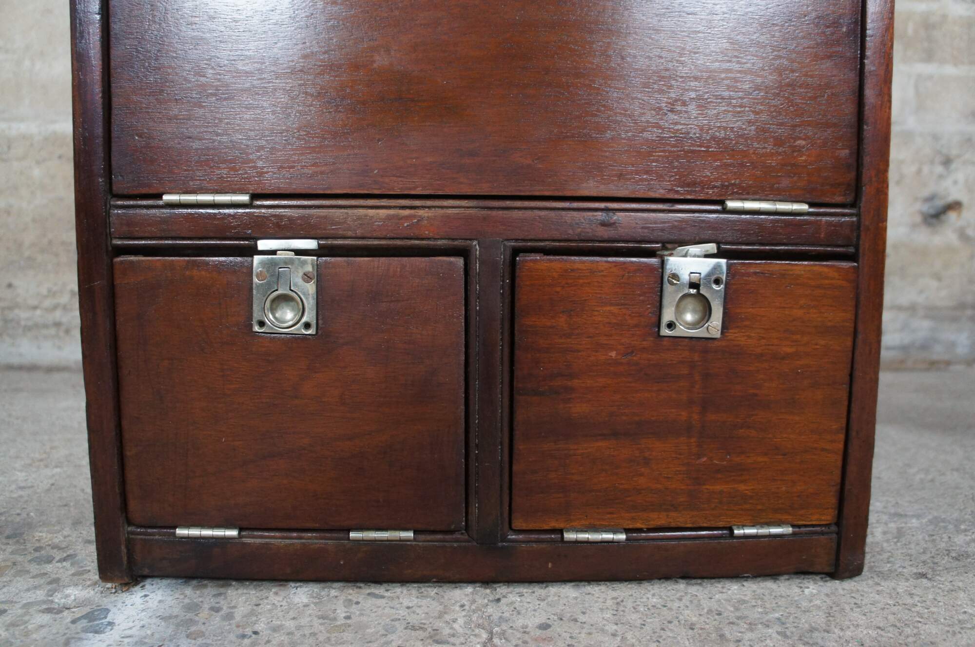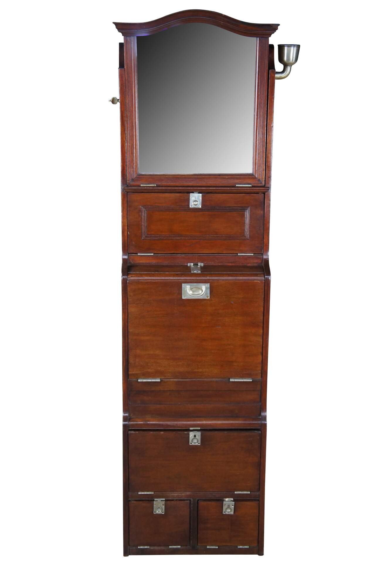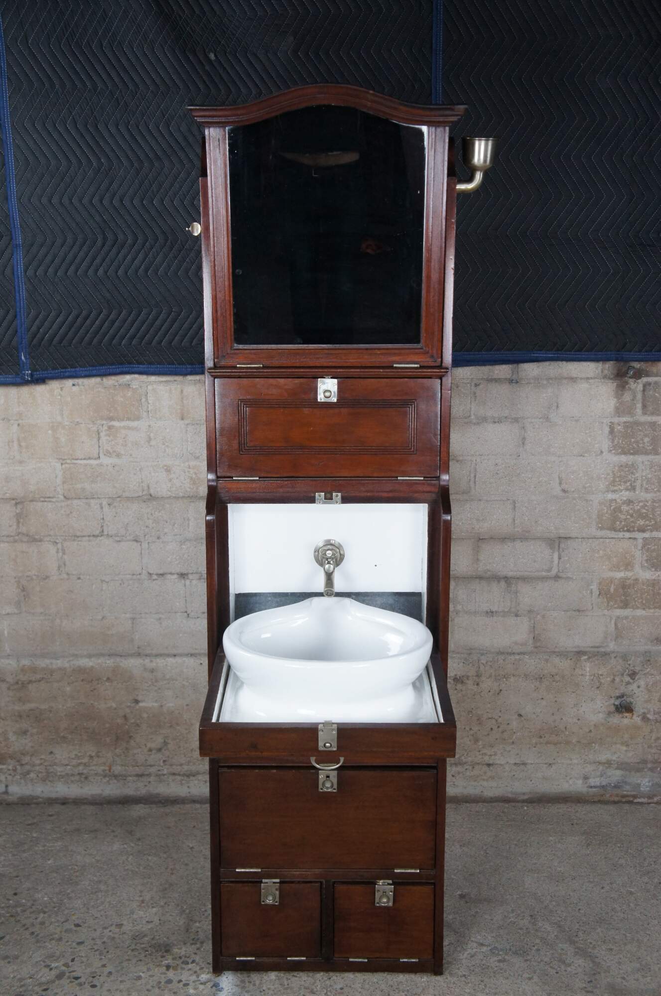 Antique nautical maritime boat / ship / steamship first class cloakroom compactum cabinet with porcelain wash basin and extras. Made of mahogany featuring overhead adjustable mirror with multiple storage cabinets / cubbies.