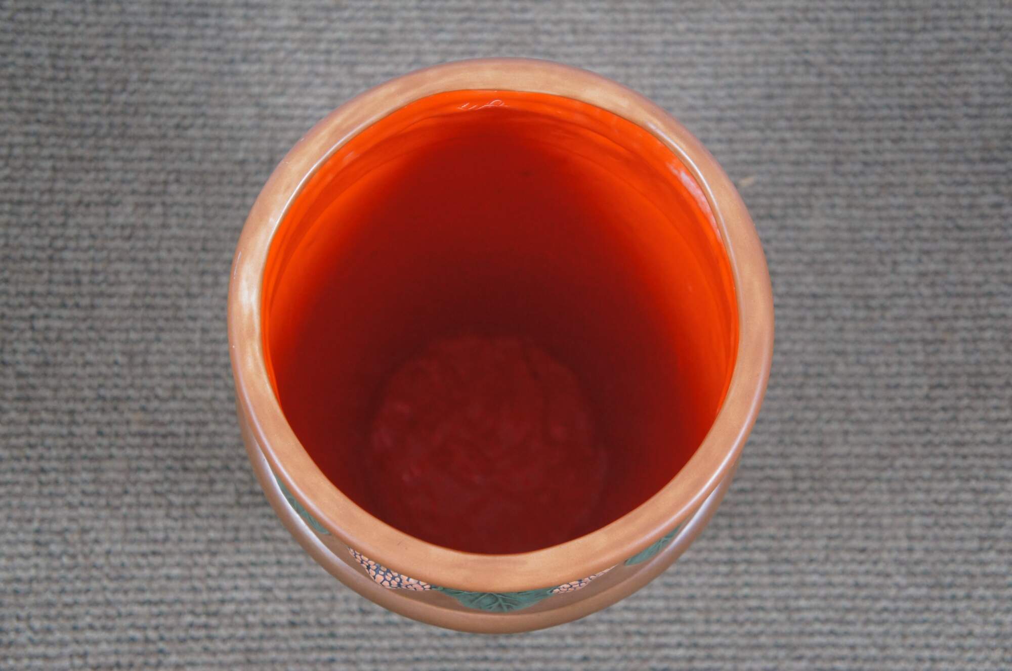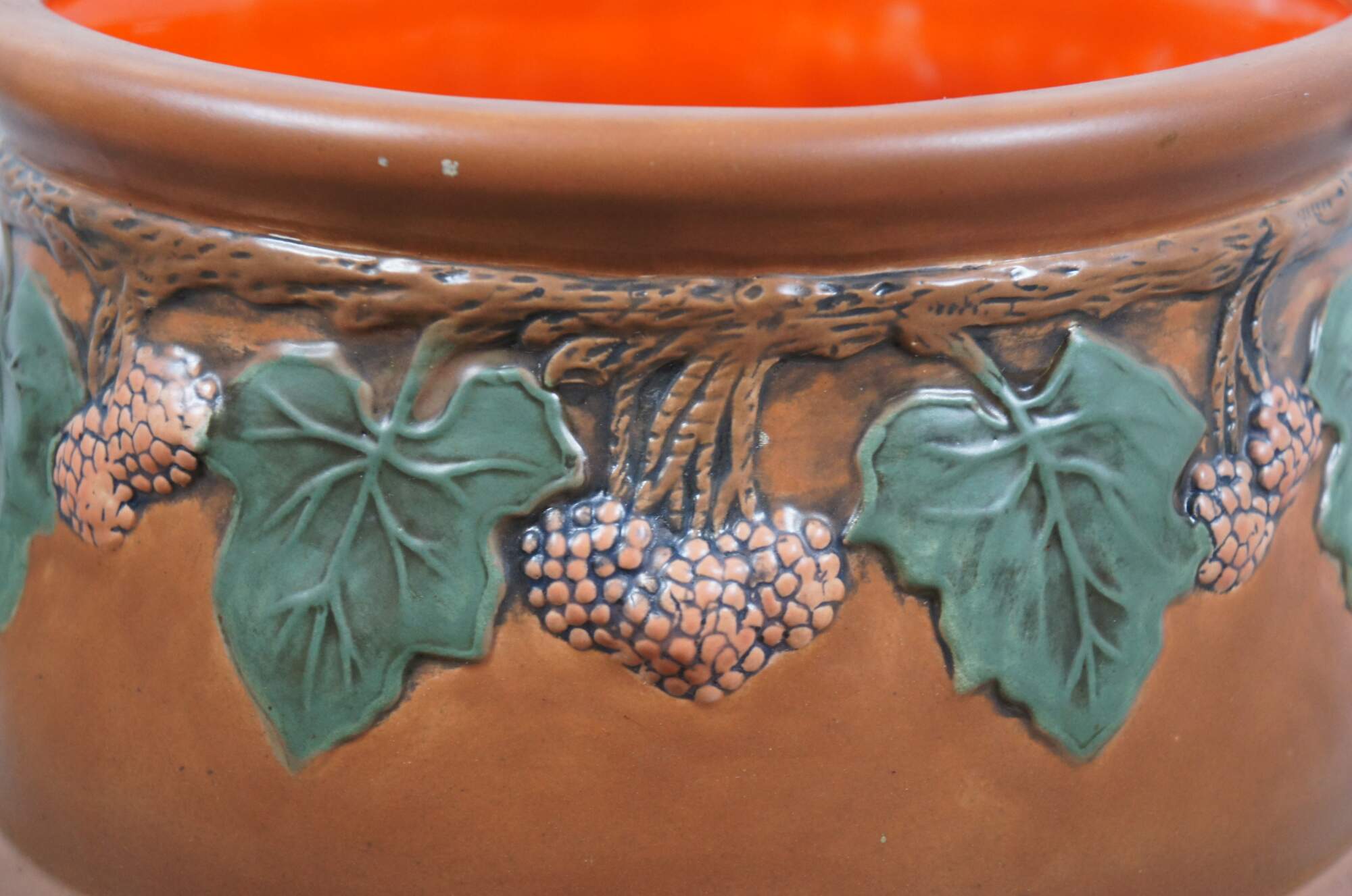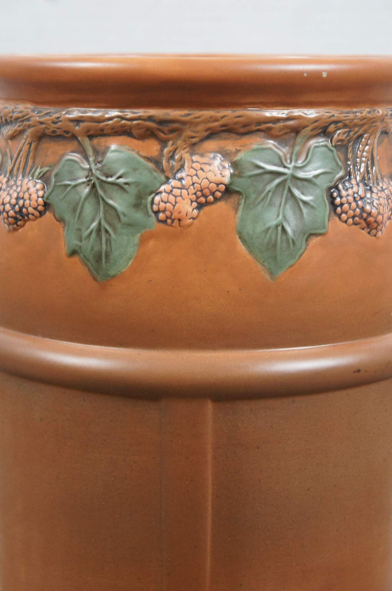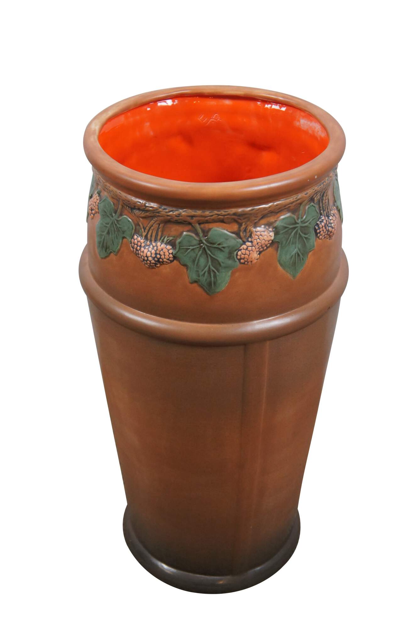 Mid 20th century ceramic umbrella / cane stand. Cylindrical body with molded straps and raspberry vine around the upper edge; brown ombre coloring with orange interior. Marked E.P and "Rhiest" or "Priest.