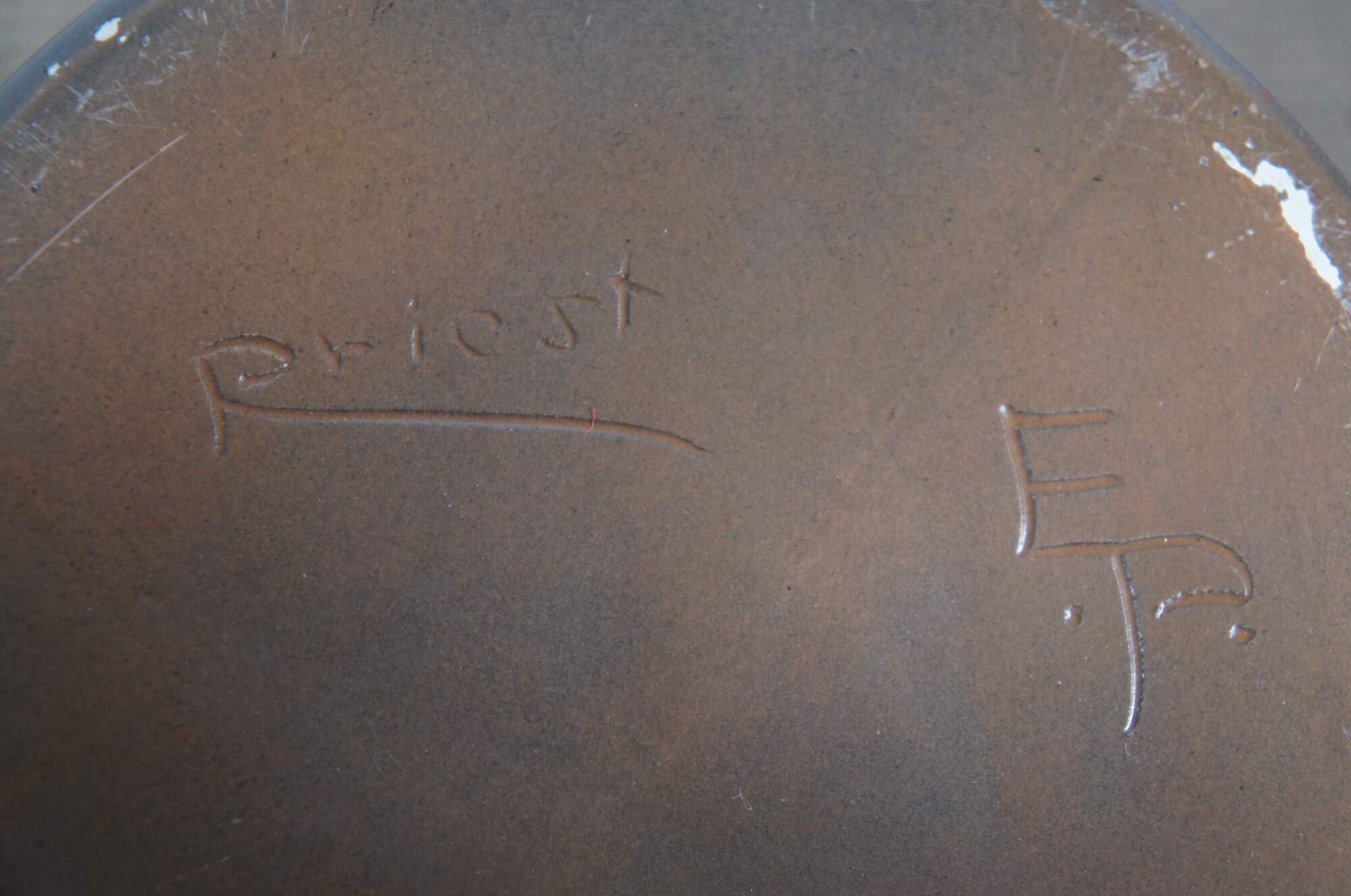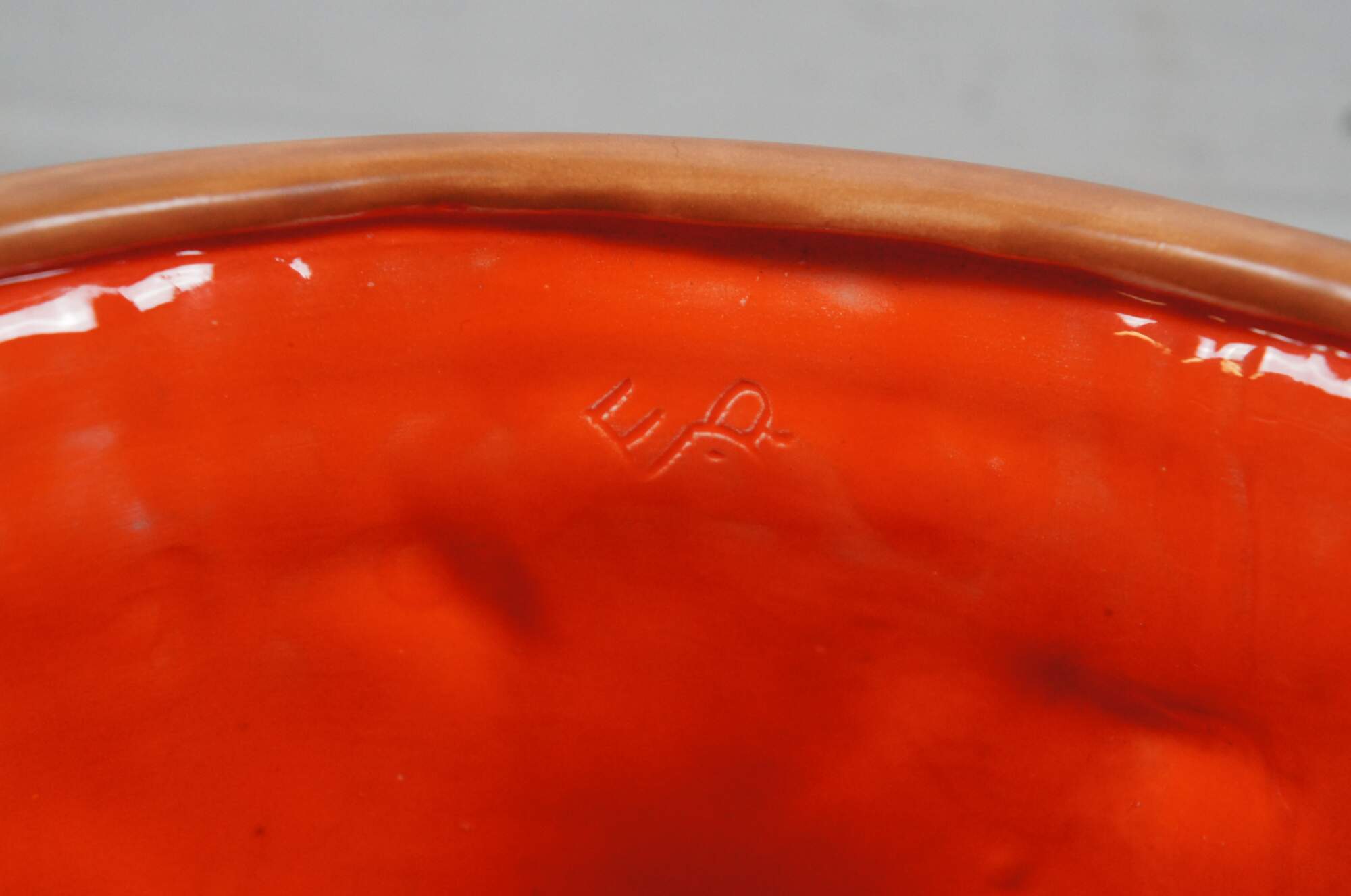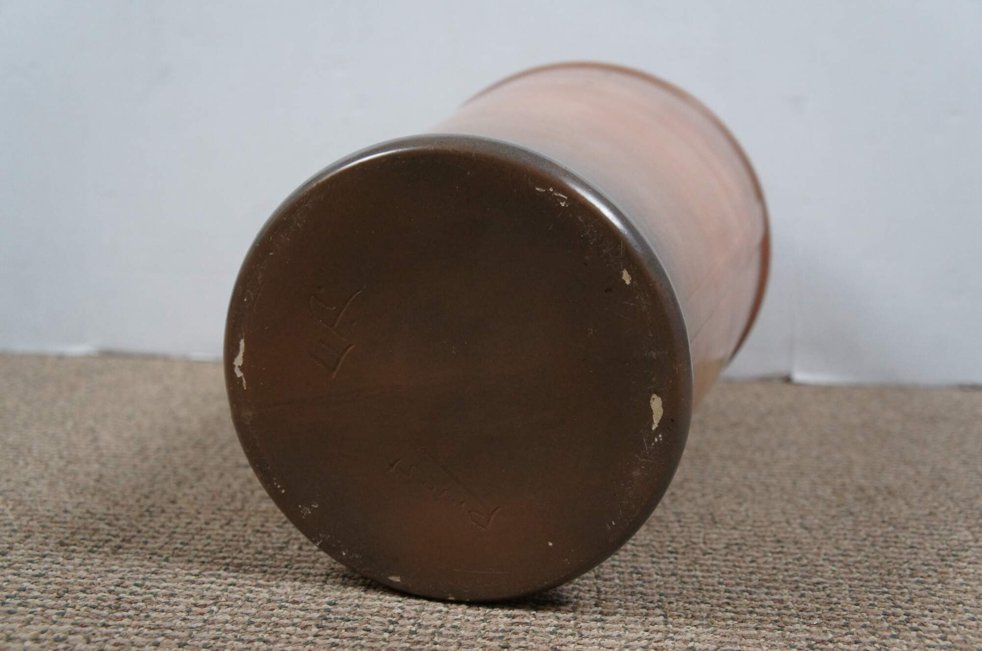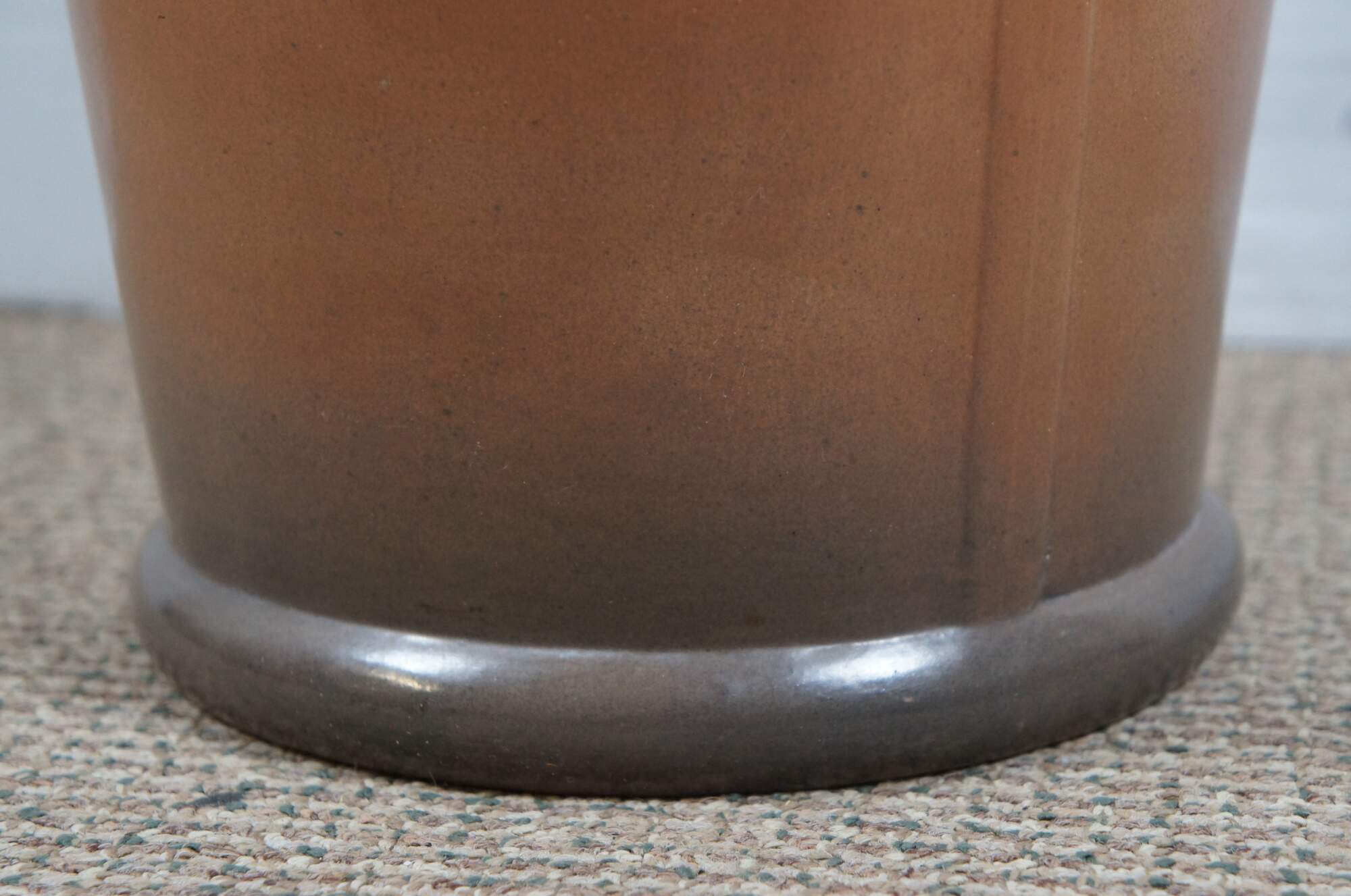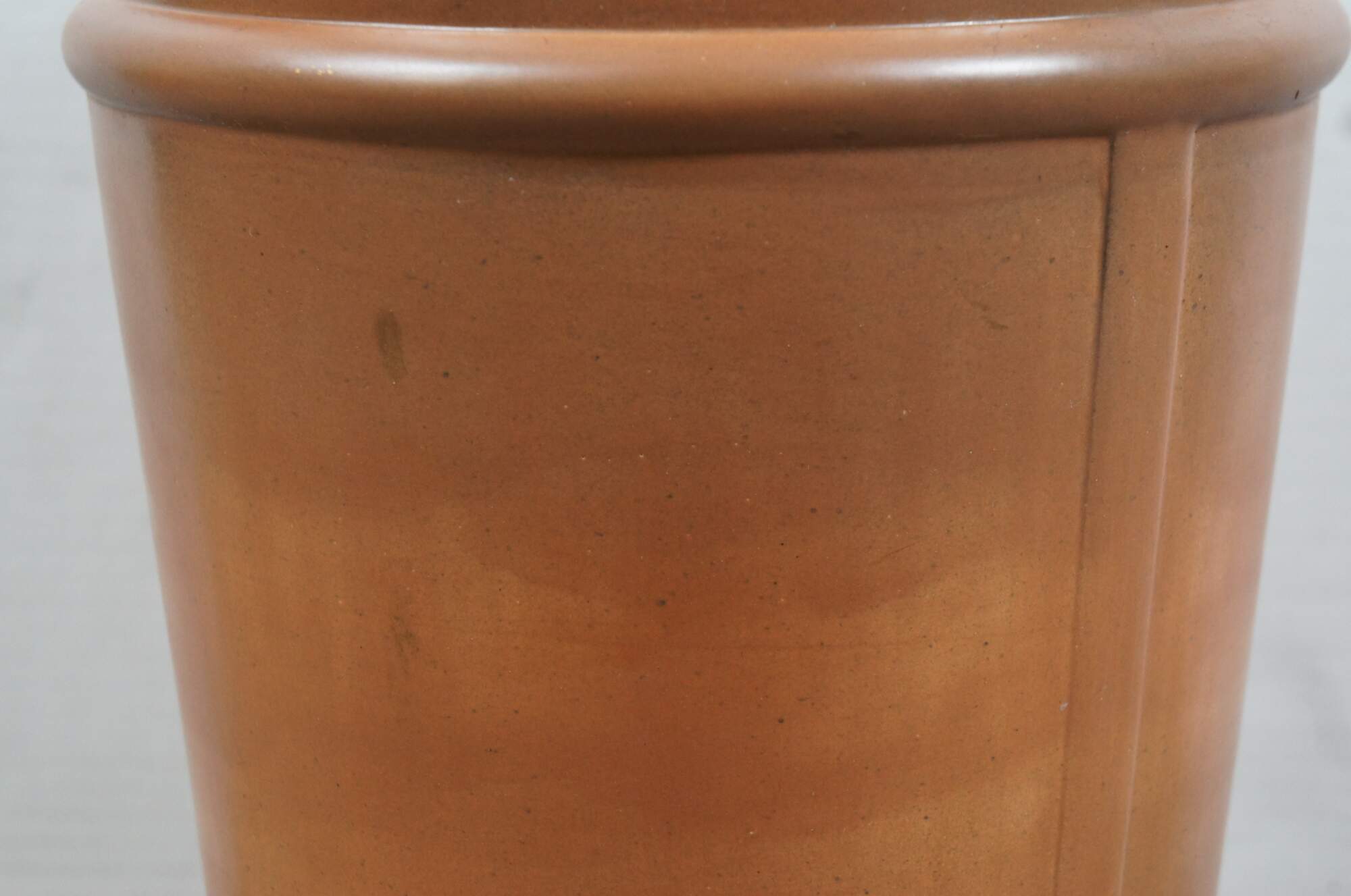 Mid 20th century ceramic umbrella / cane stand. Cylindrical body with molded straps and raspberry vine around the upper edge; brown ombre coloring with orange interior. Marked E.P and "Rhiest" or "Priest.