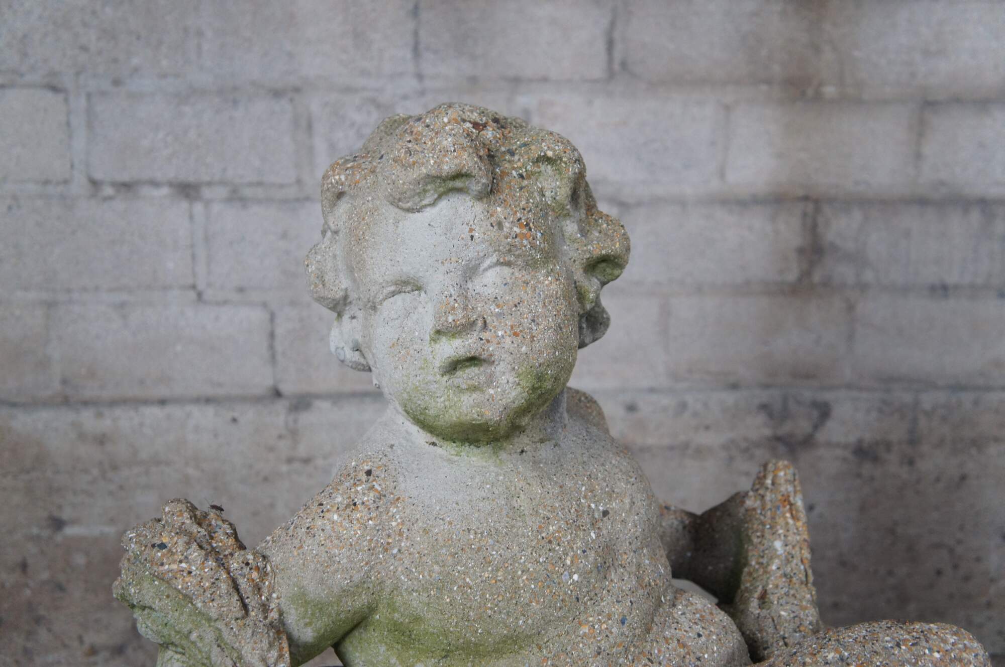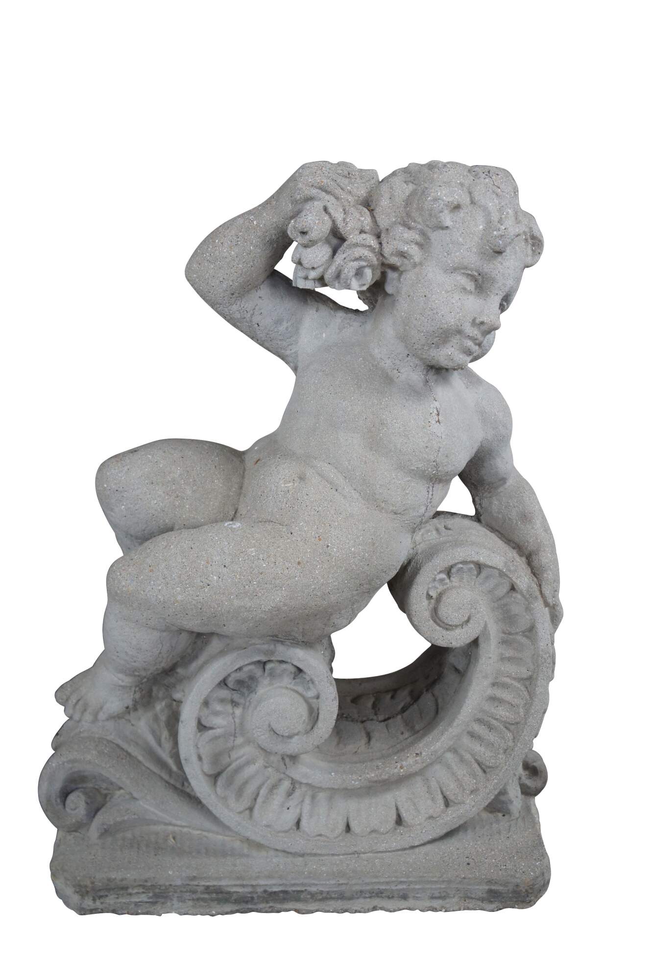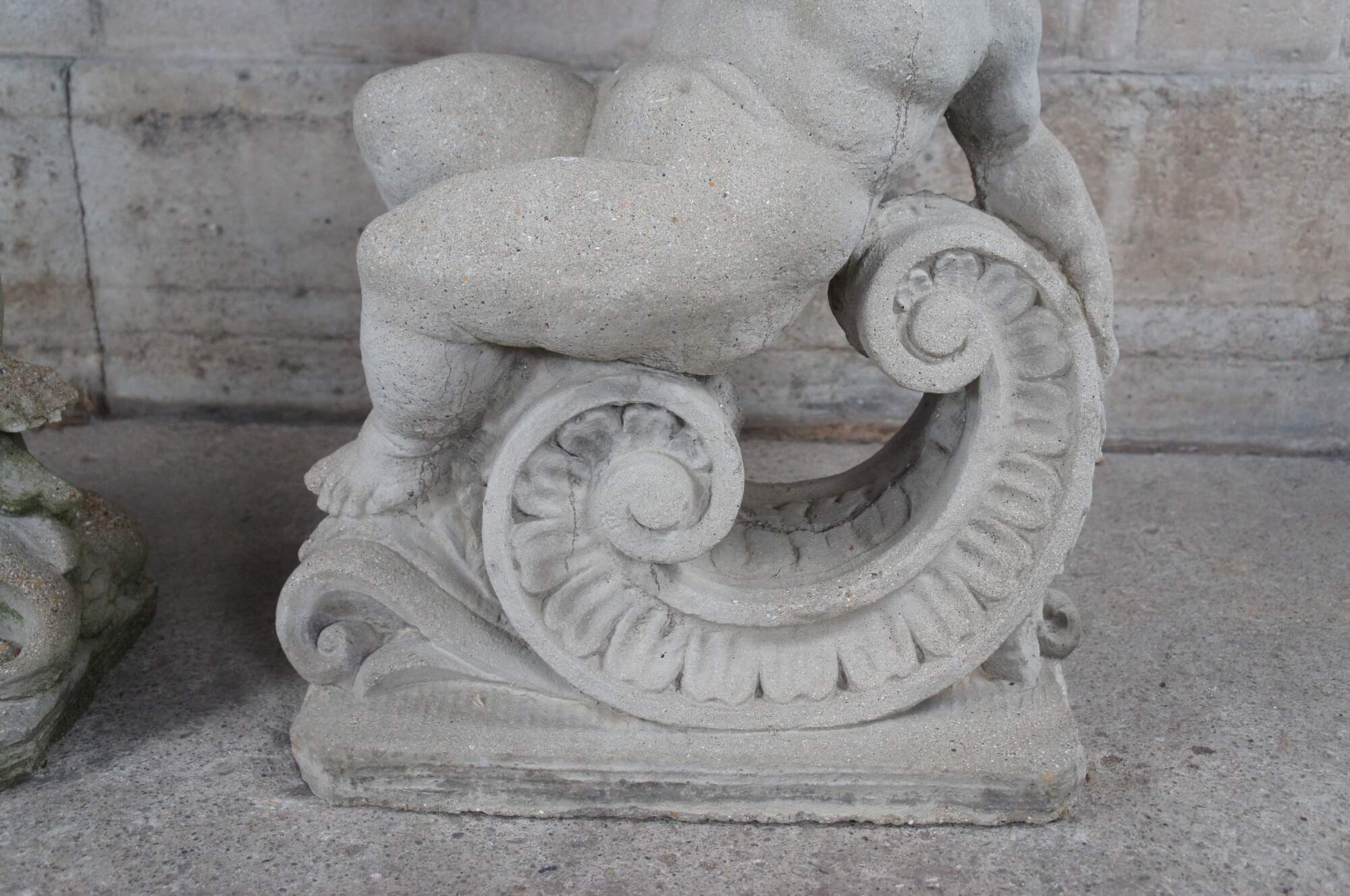Pair of antique classical French putto / cherub statues representing two of the four seasons. Made of concrete / stone featuring two reclining figures, one left facing with wheat and the other right facing with grapes. Both figures sit on a central cartouche with a acanthus leaf and shell design. Atrributed to Portland Cement circa 1920s.