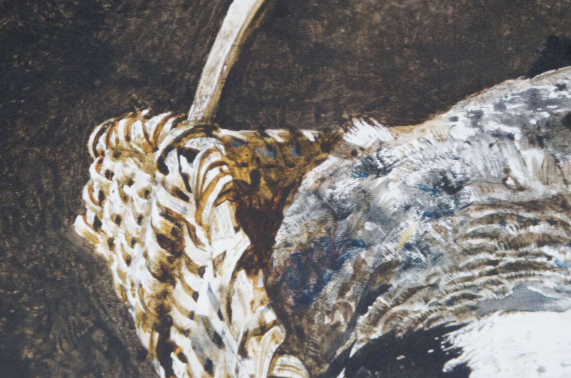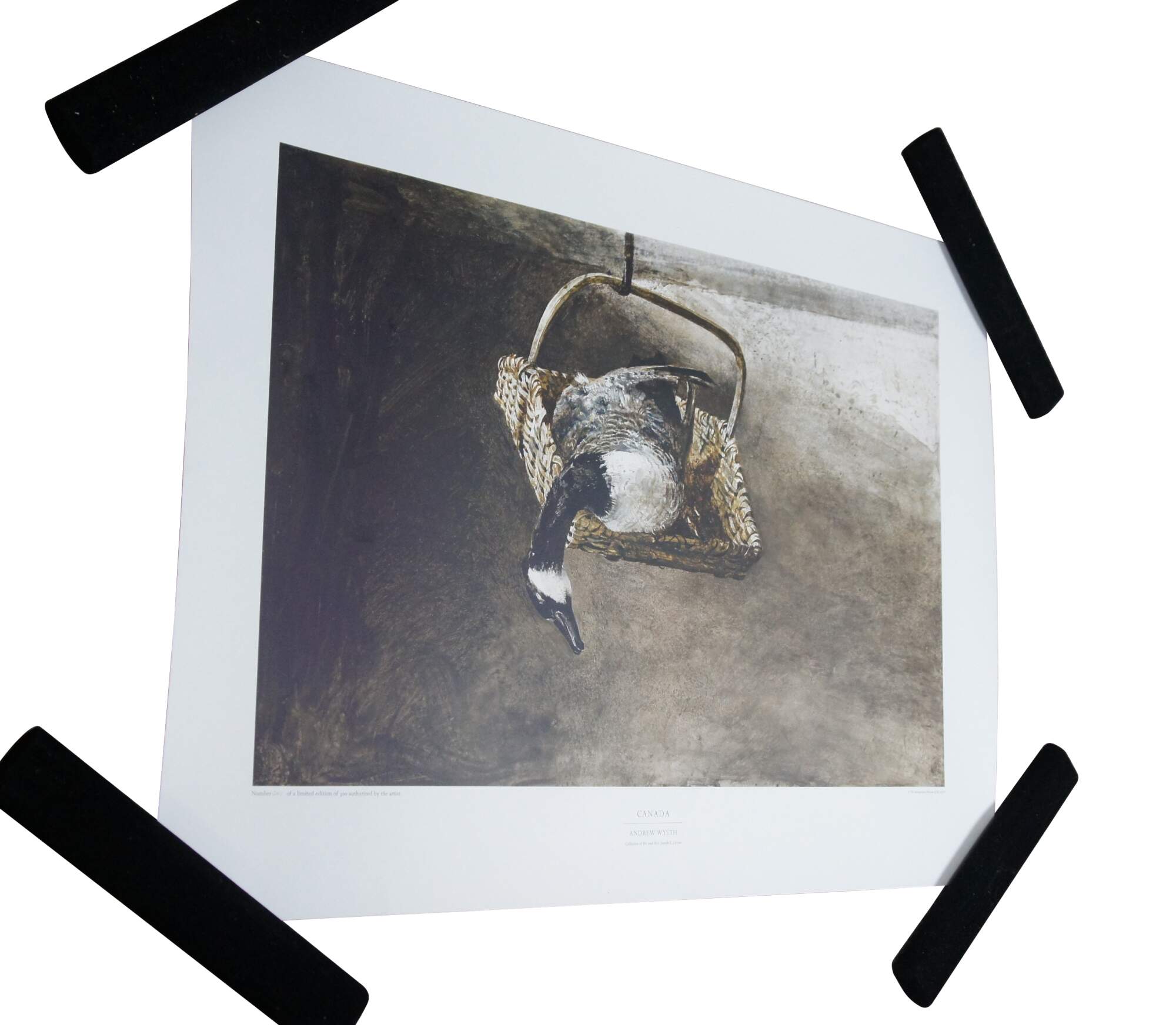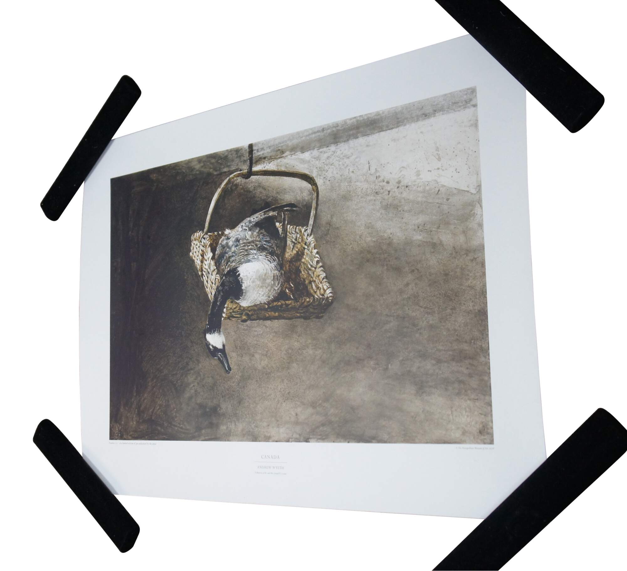 Vintage 1976 collotype on paper of "Canada" by Andrew Wyeth. Shows a Canada goose in a basket hanging from a hook in the ceiling of a stone cottage. Number 241 of a limited edition of 300 authorized by the artist - produced by the Metropolitan Museum of Art, New York.