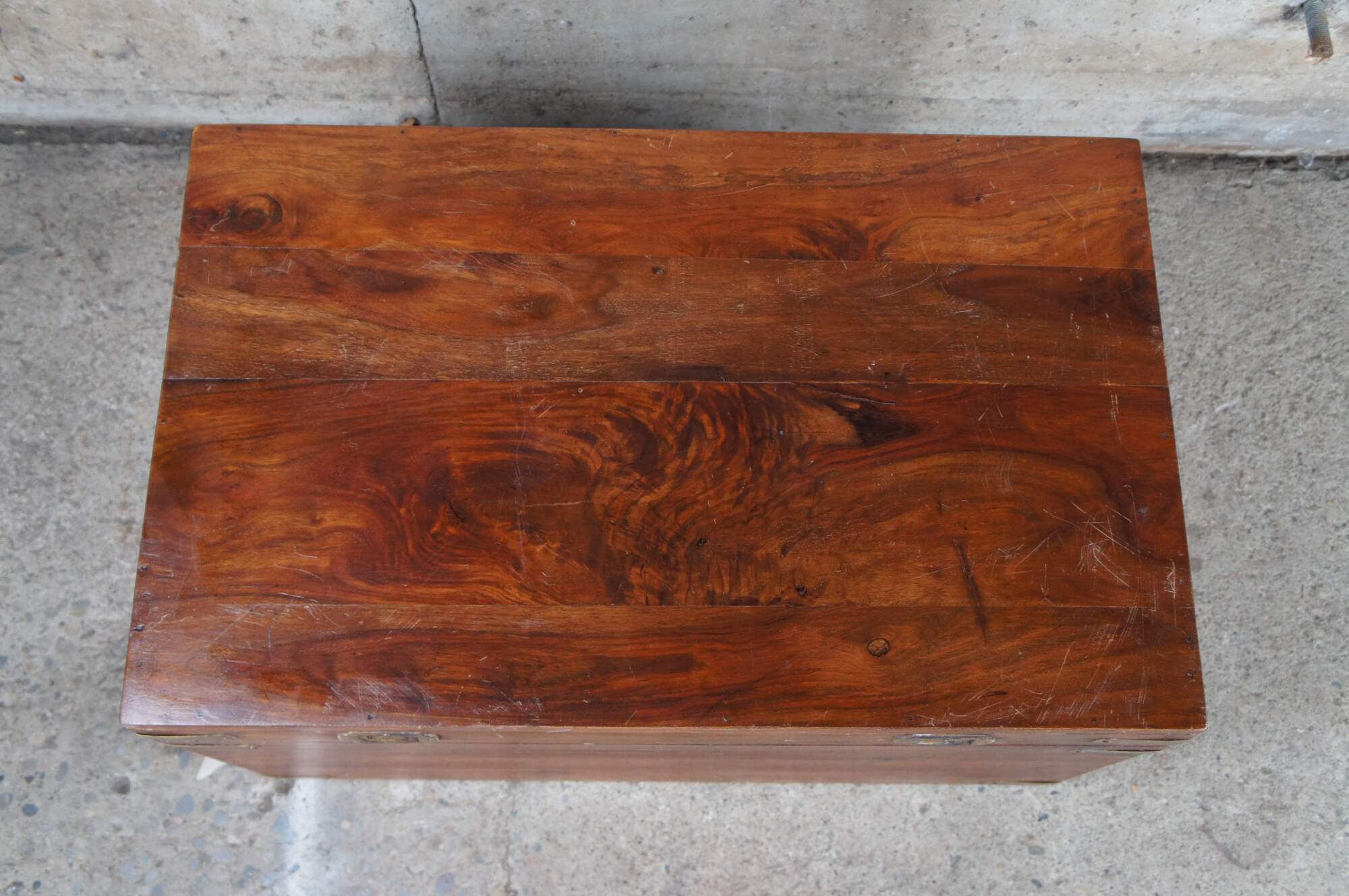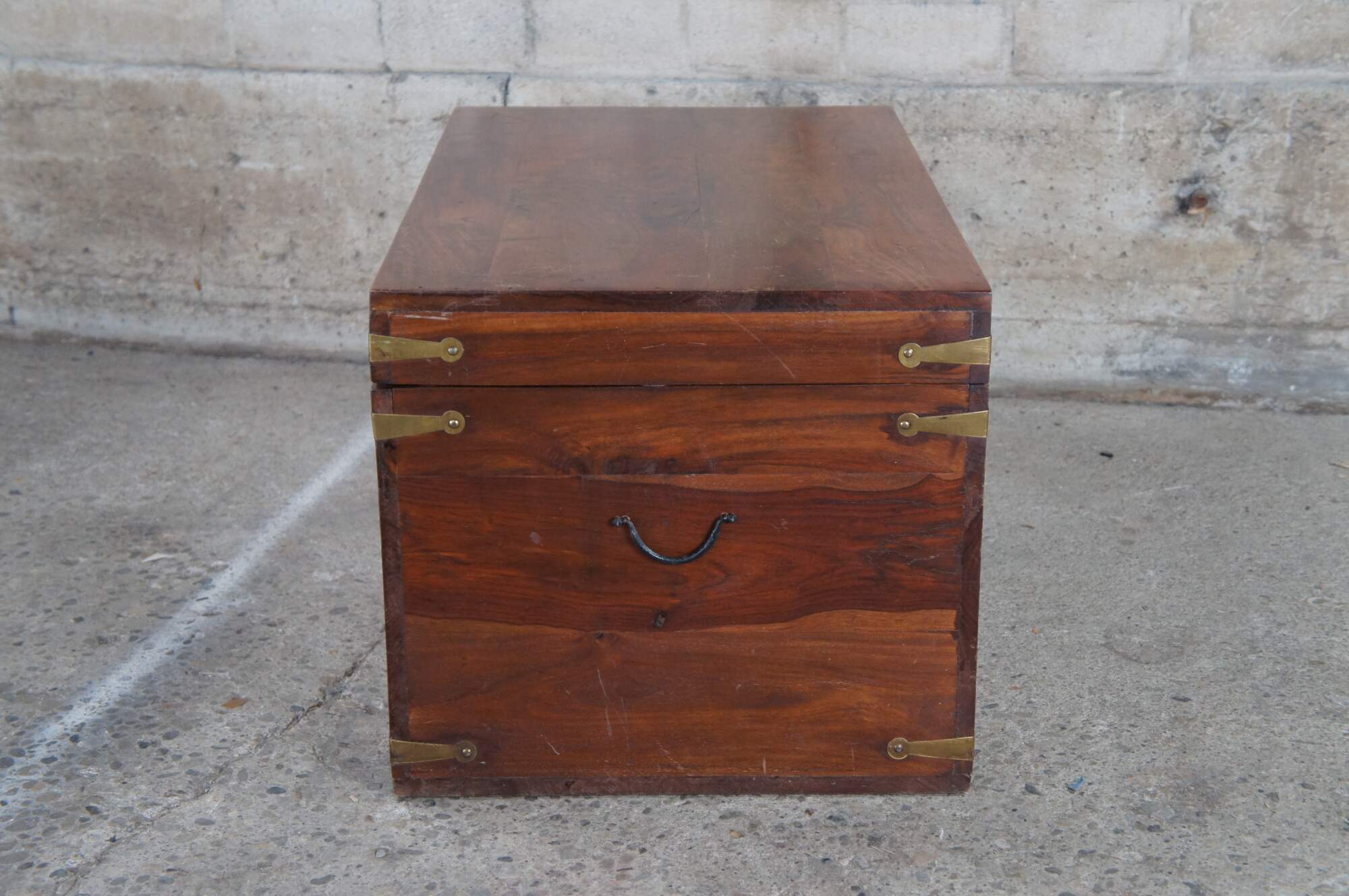British Colonial style Camphor wood blanket storage chest or coffee table. Features a nice patina with brass accents and iron handles. Brass handles along the fron are recessed. Trunk has a stop along the back side to keep the top open. Circa 1980s
