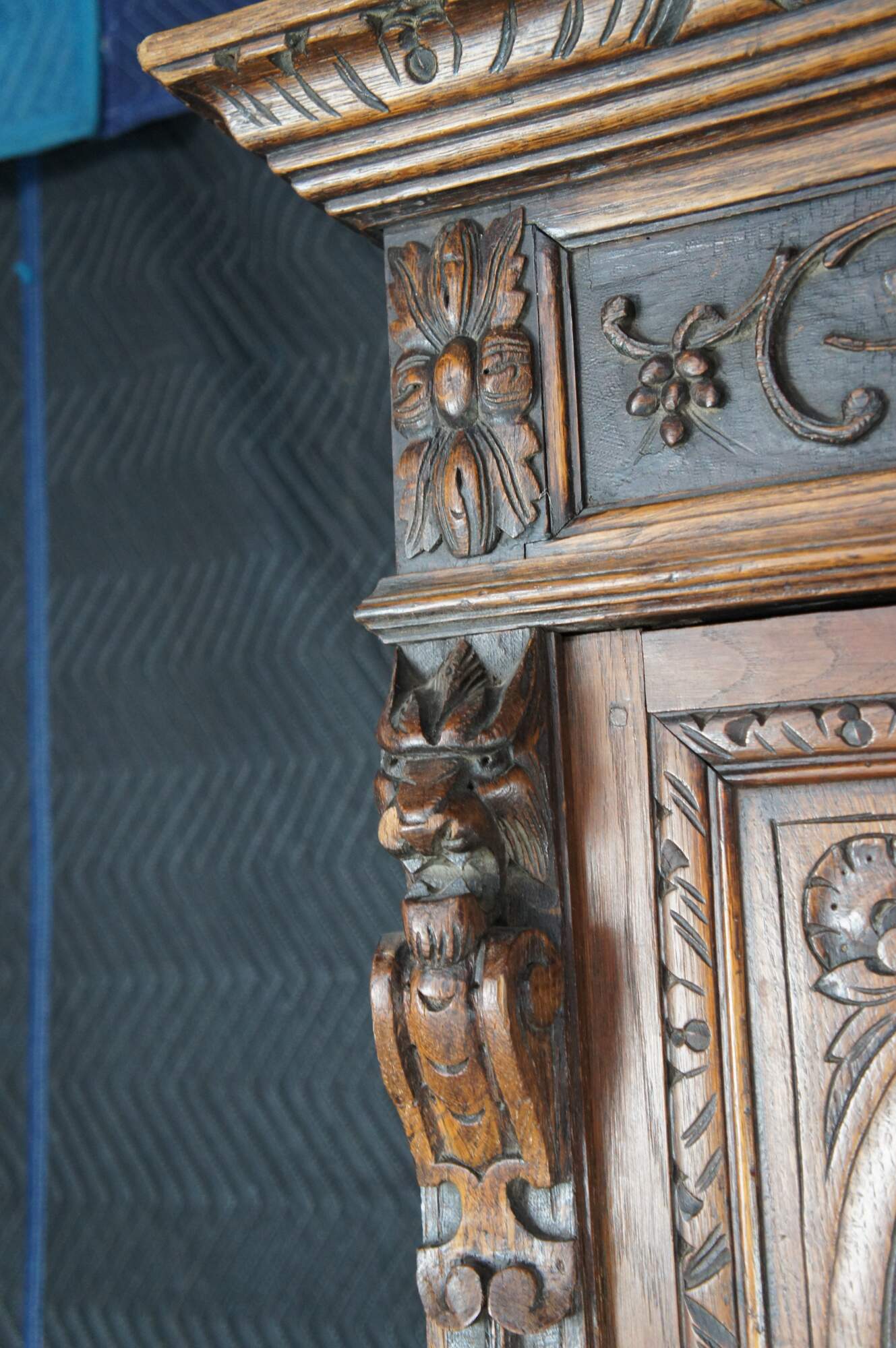 Exceptional Antique 19th Century Renaissance Revival Hunt Cabinet. Hand carved from oak with an upper display portion raised over a figural griffon carved backsplash. Features low relief carved doors with neoclassical motifs showcasing a basket of fruit over a quiver, foliate and leaves. Interior opens to two adjustable shelves. The outer stiles of the hutch are carved with figural spandrels over an acanthus and berry motif. Crown is centered by a prenounced gargoyle motif between a leaf and vine motif set between French medallions.