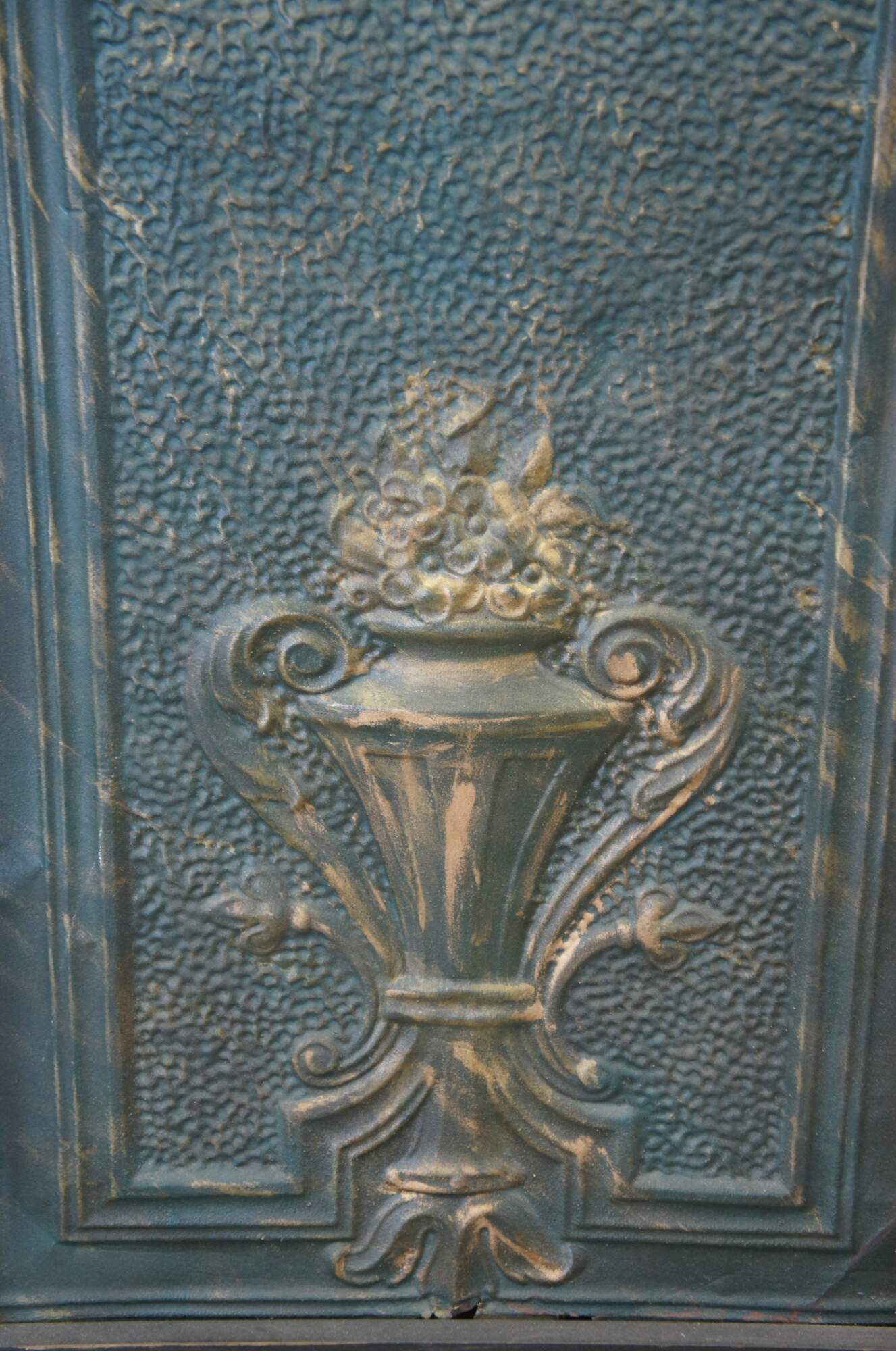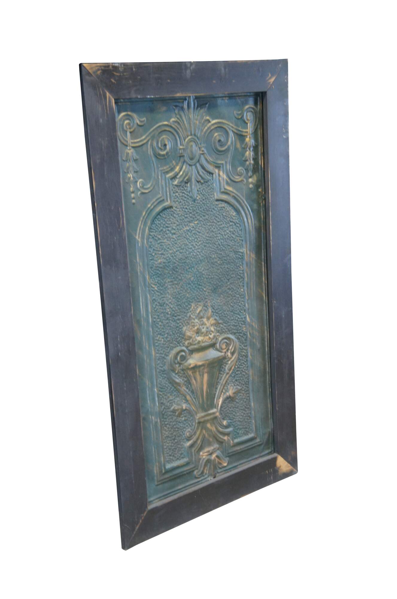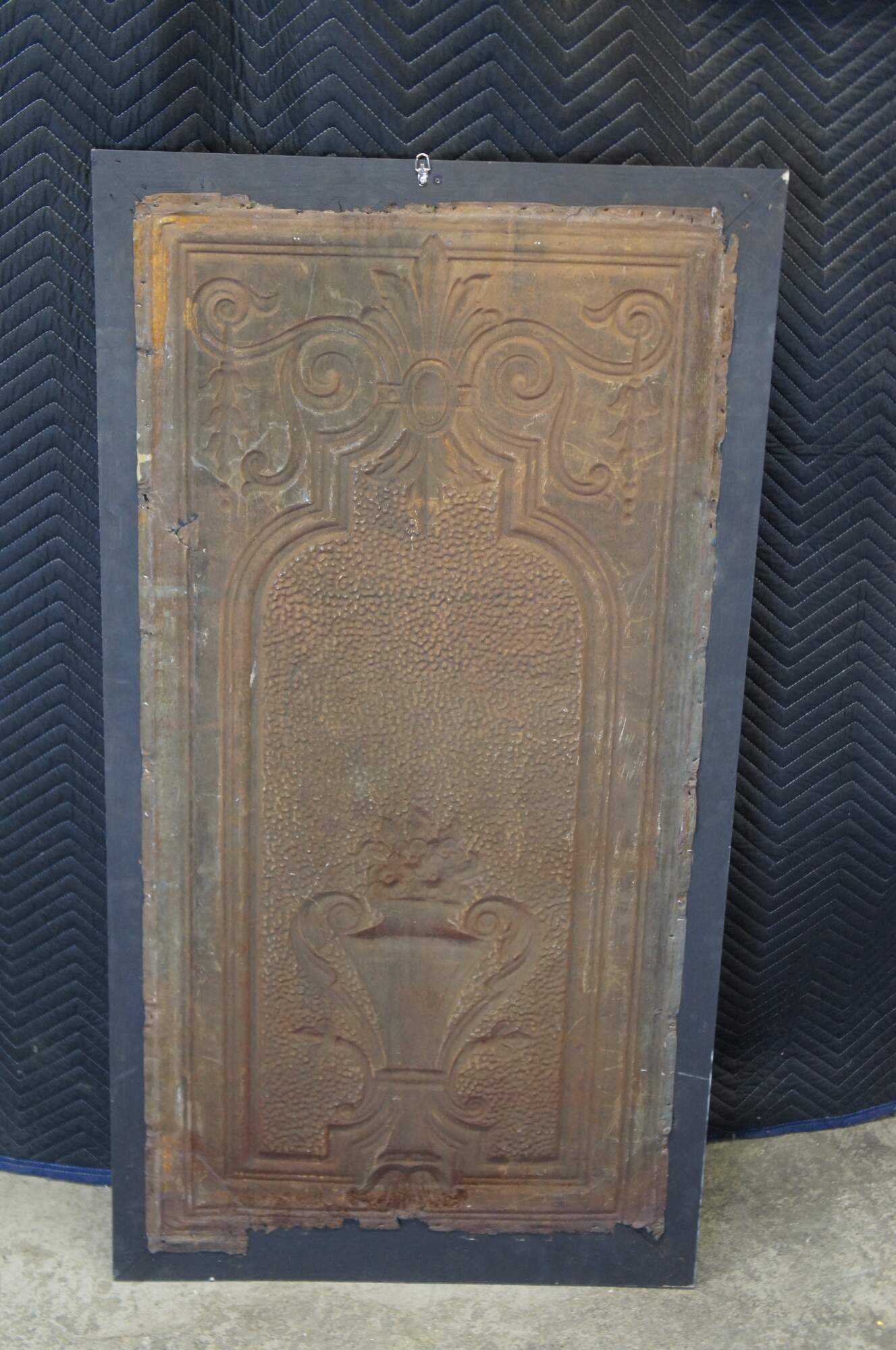 Vintage decorative embossed and hammered tin panel featuring a trophy urn with flowers, fleur de lis and acanthus accents.