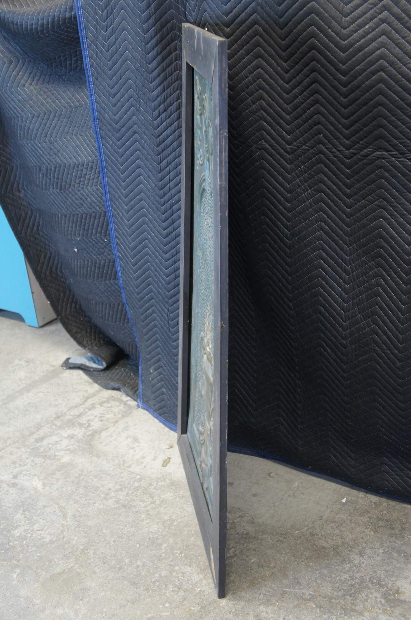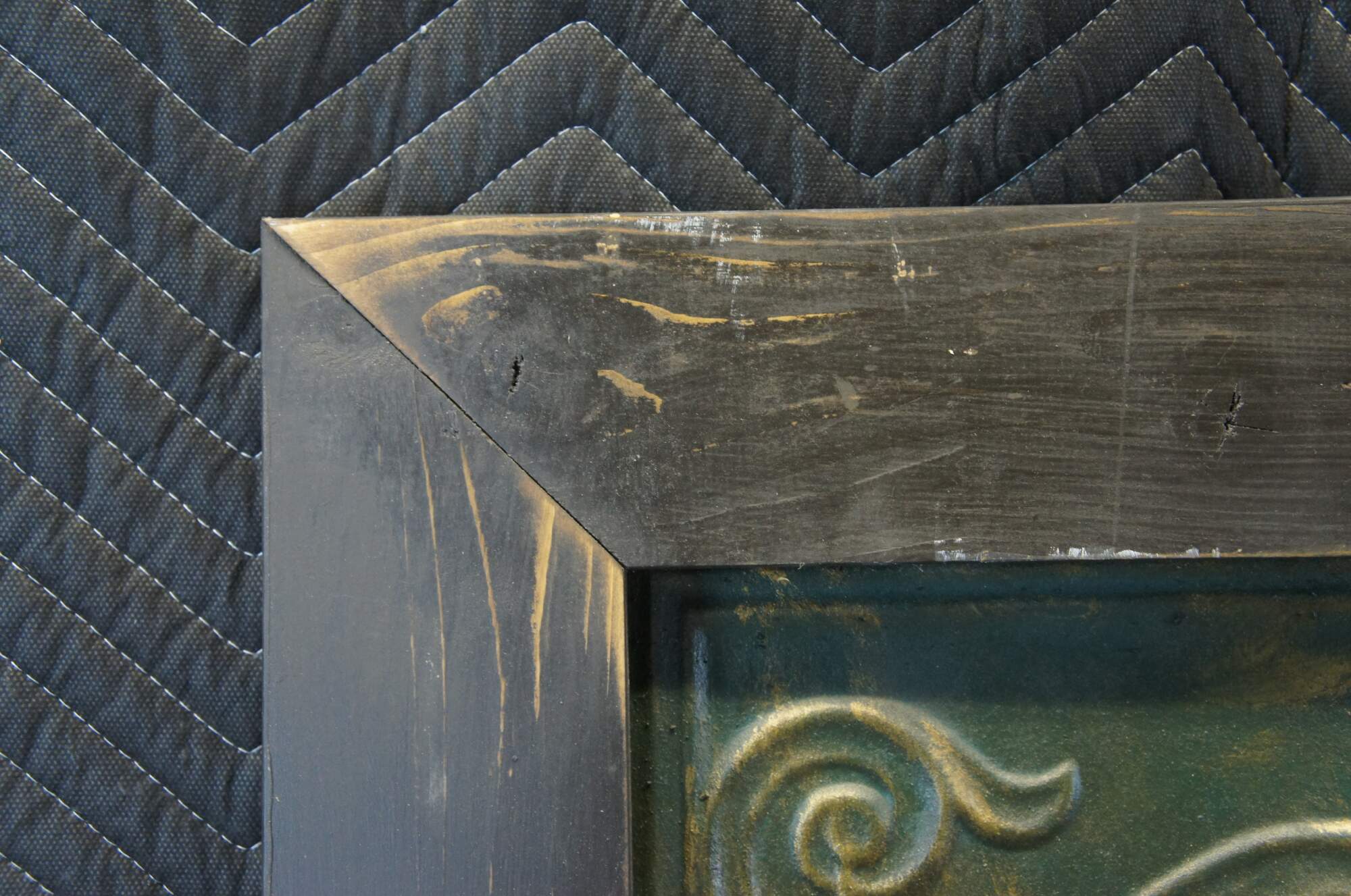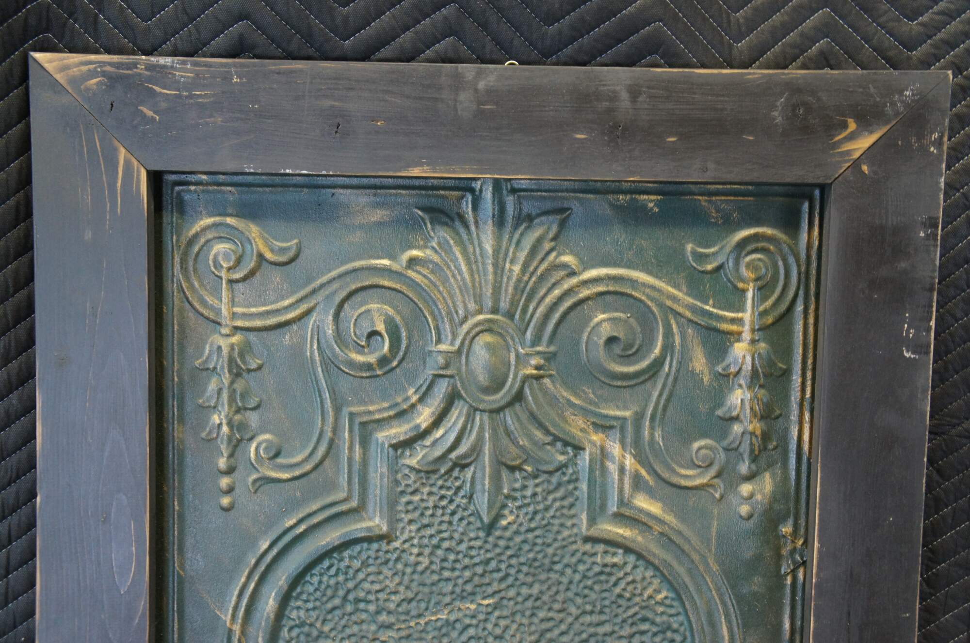 Vintage decorative embossed and hammered tin panel featuring a trophy urn with flowers, fleur de lis and acanthus accents.