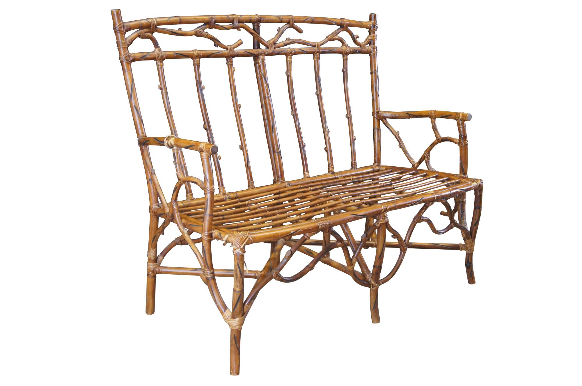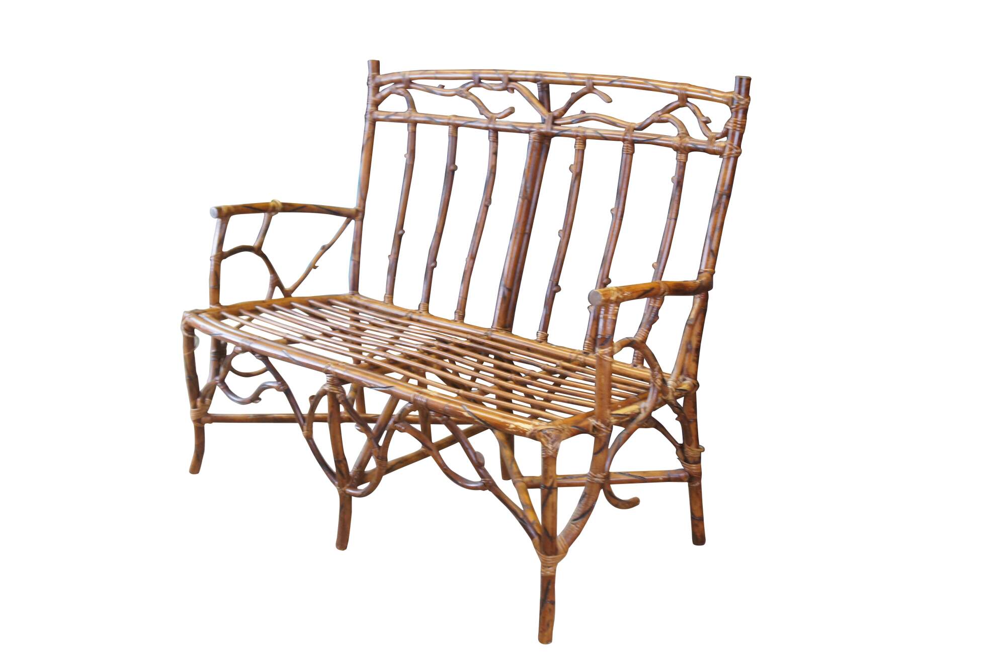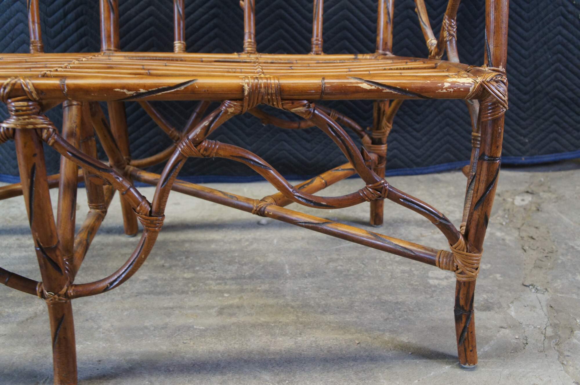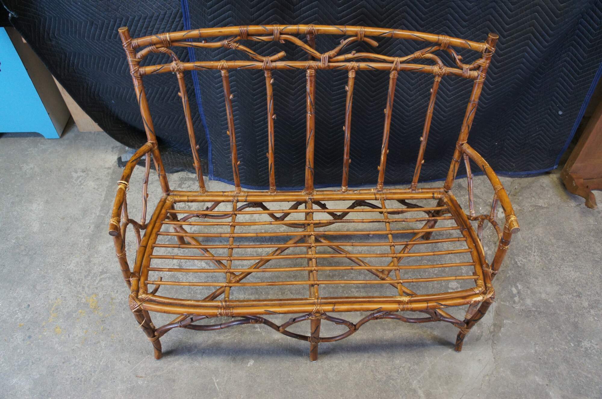 Vintage rustic log cabin / farmhouse / adirondak / tree branch style bench or settee. Made of bamboo and rattan featuring bentwood style and slatted back.