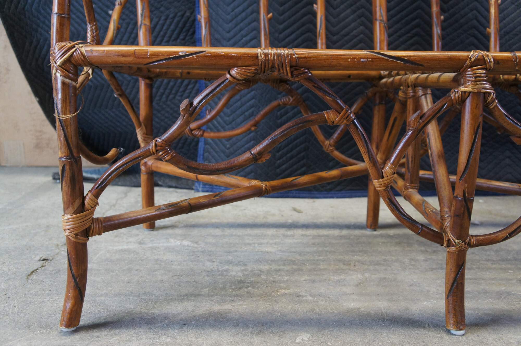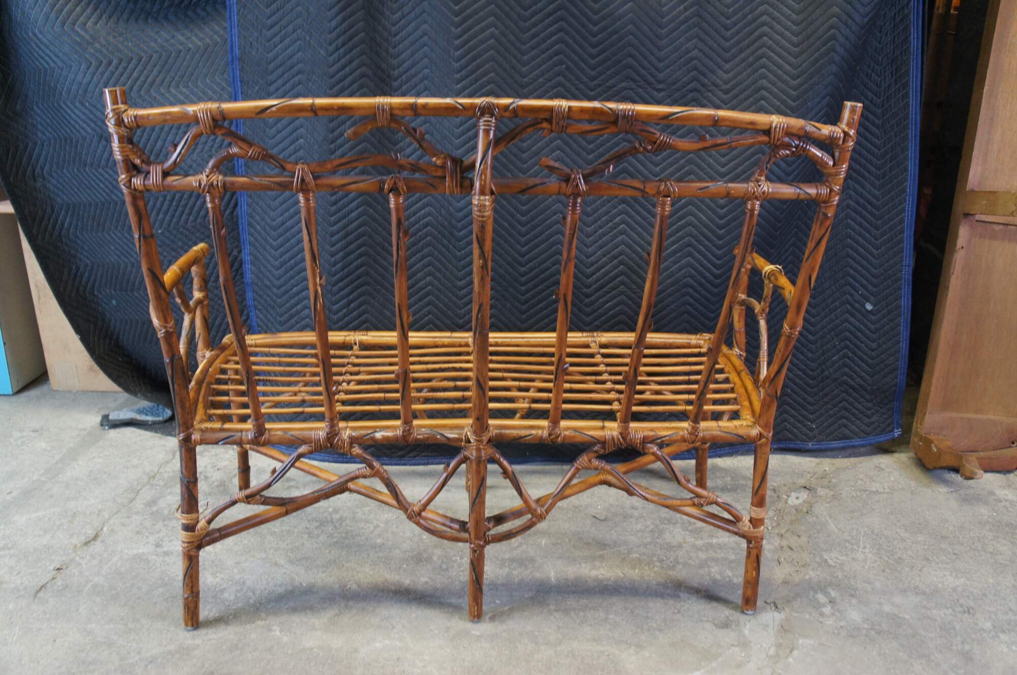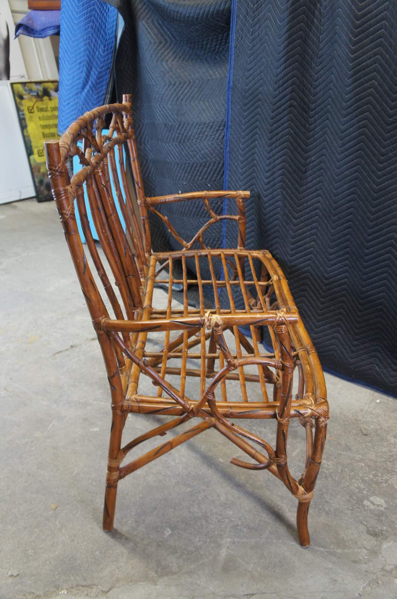 Vintage rustic log cabin / farmhouse / adirondak / tree branch style bench or settee. Made of bamboo and rattan featuring bentwood style and slatted back.