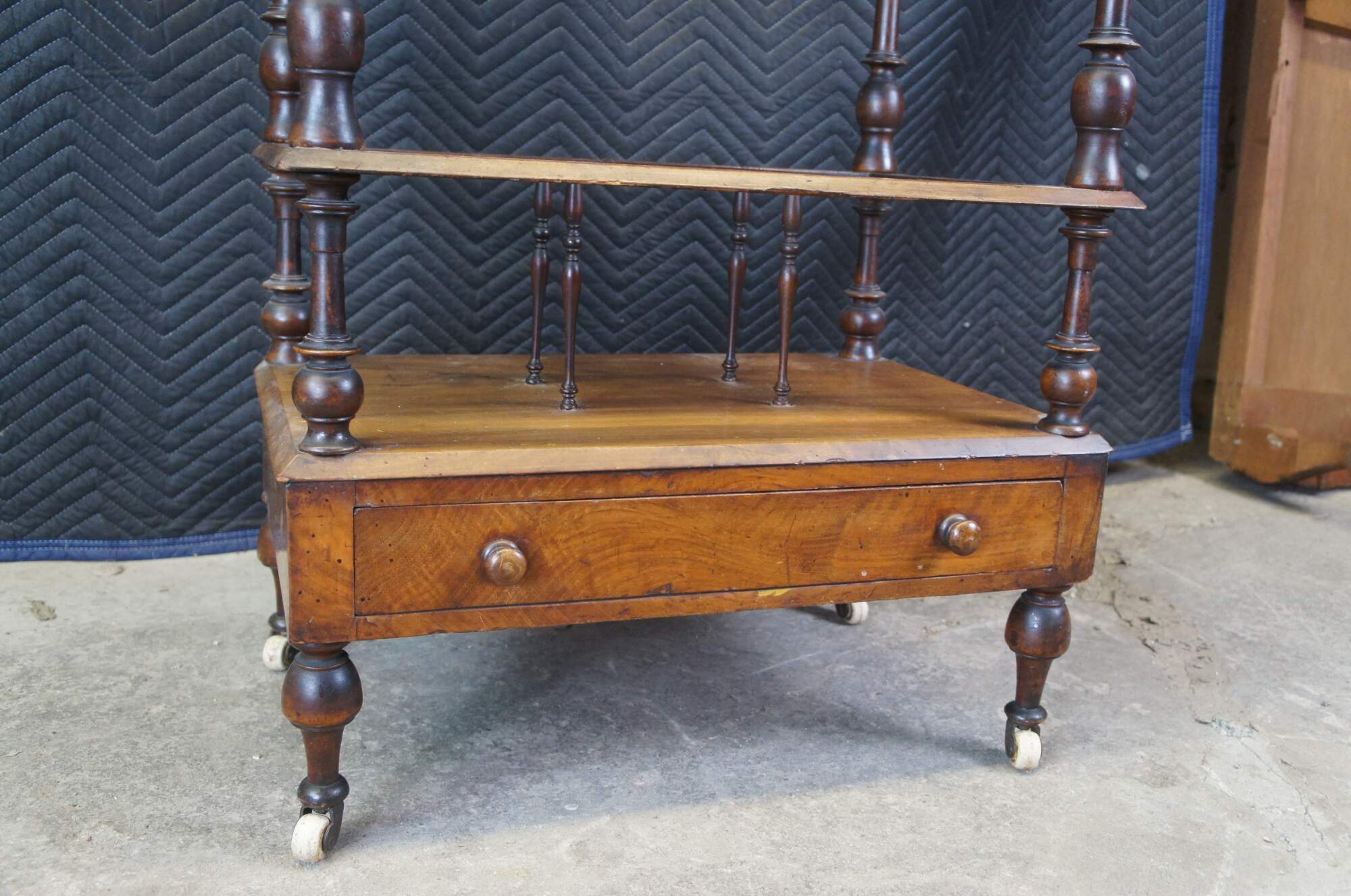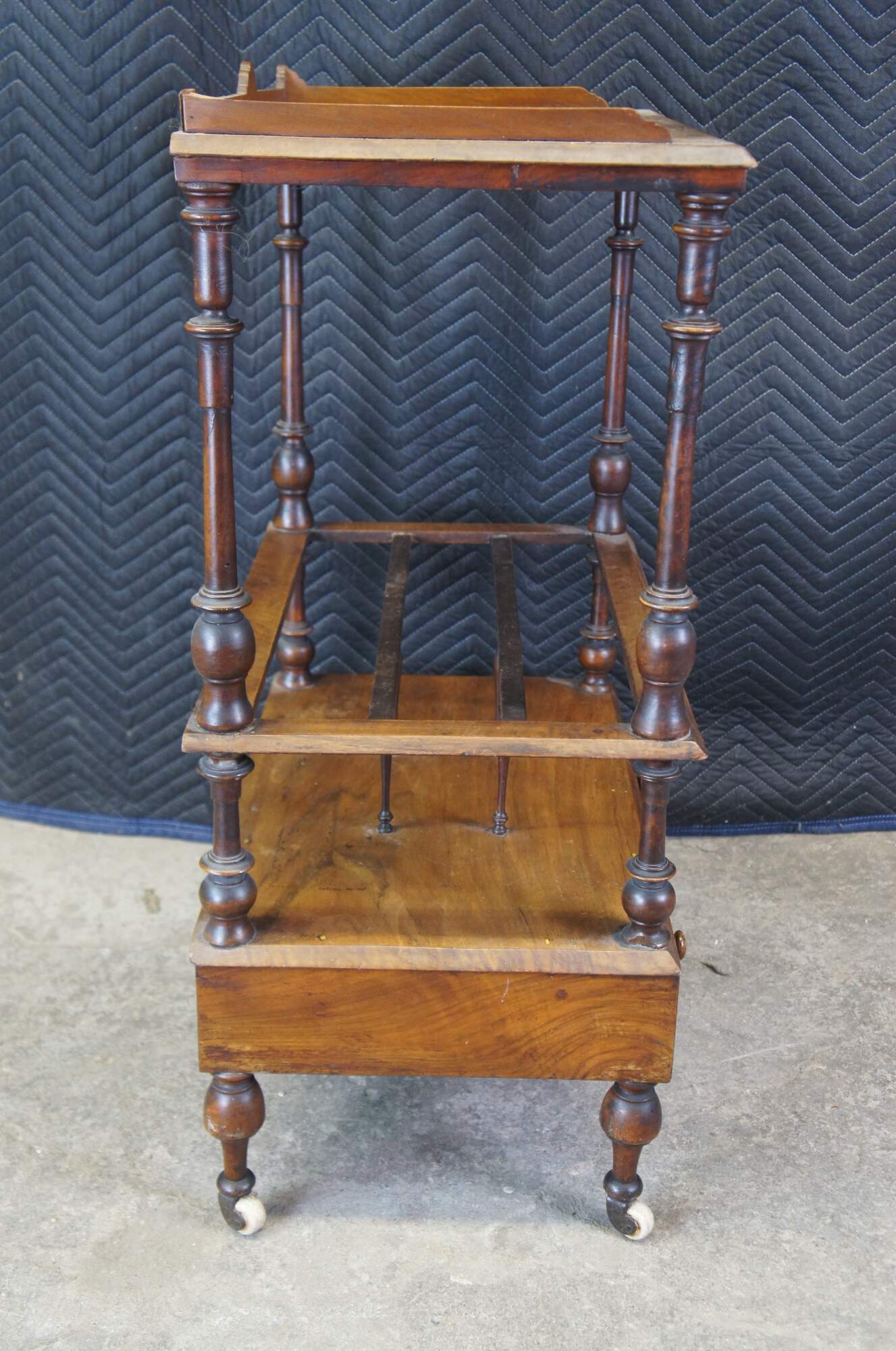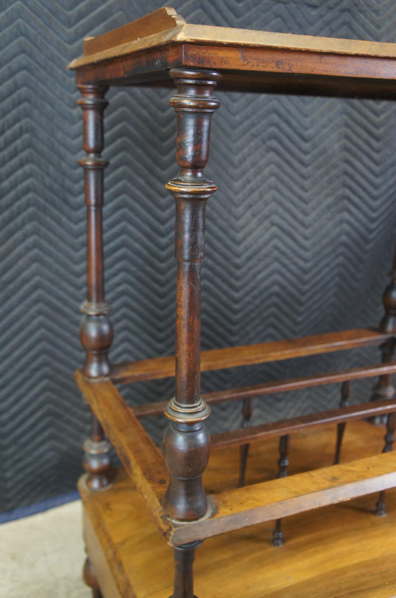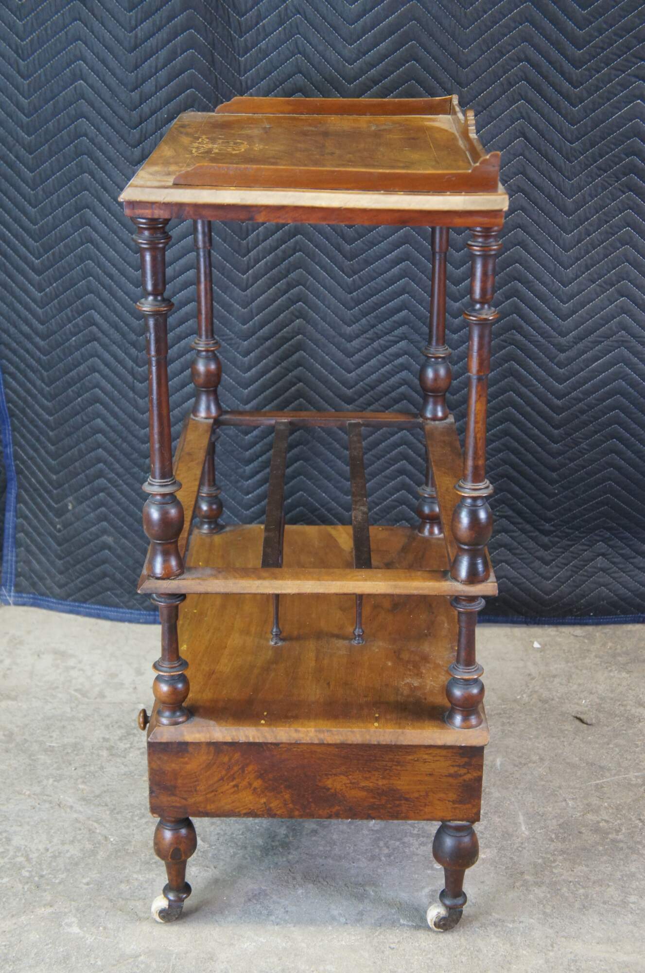 Antique Victorian walnut Canterbury rack / cart. Made of walnut featuring fruitwood inlay and gallery, supported on finely turned columns, the middle section having three divisions which are divided with turned spindles, with a nice moulded edge rail running around the edge, having a single bottom with turned wood knob handles, supported on turned feet terminating on porcelain castors.