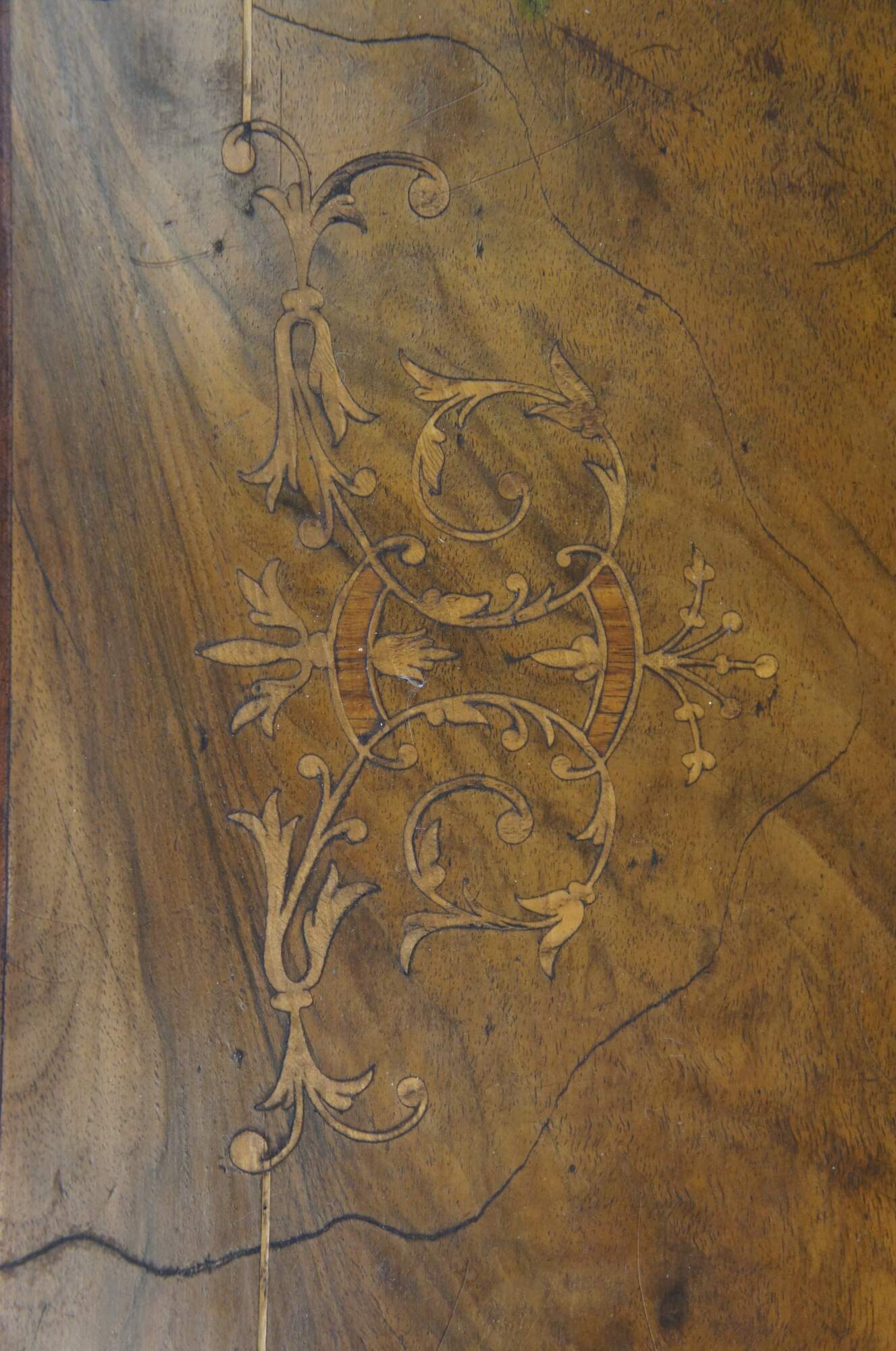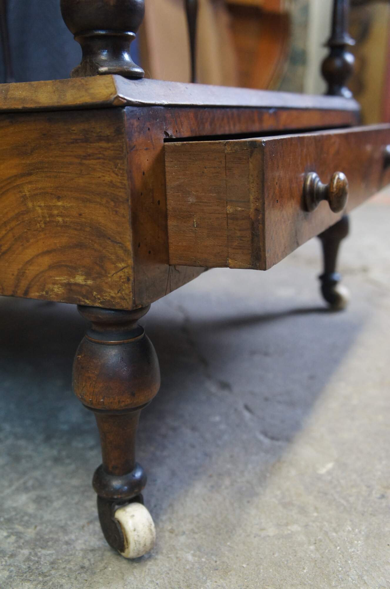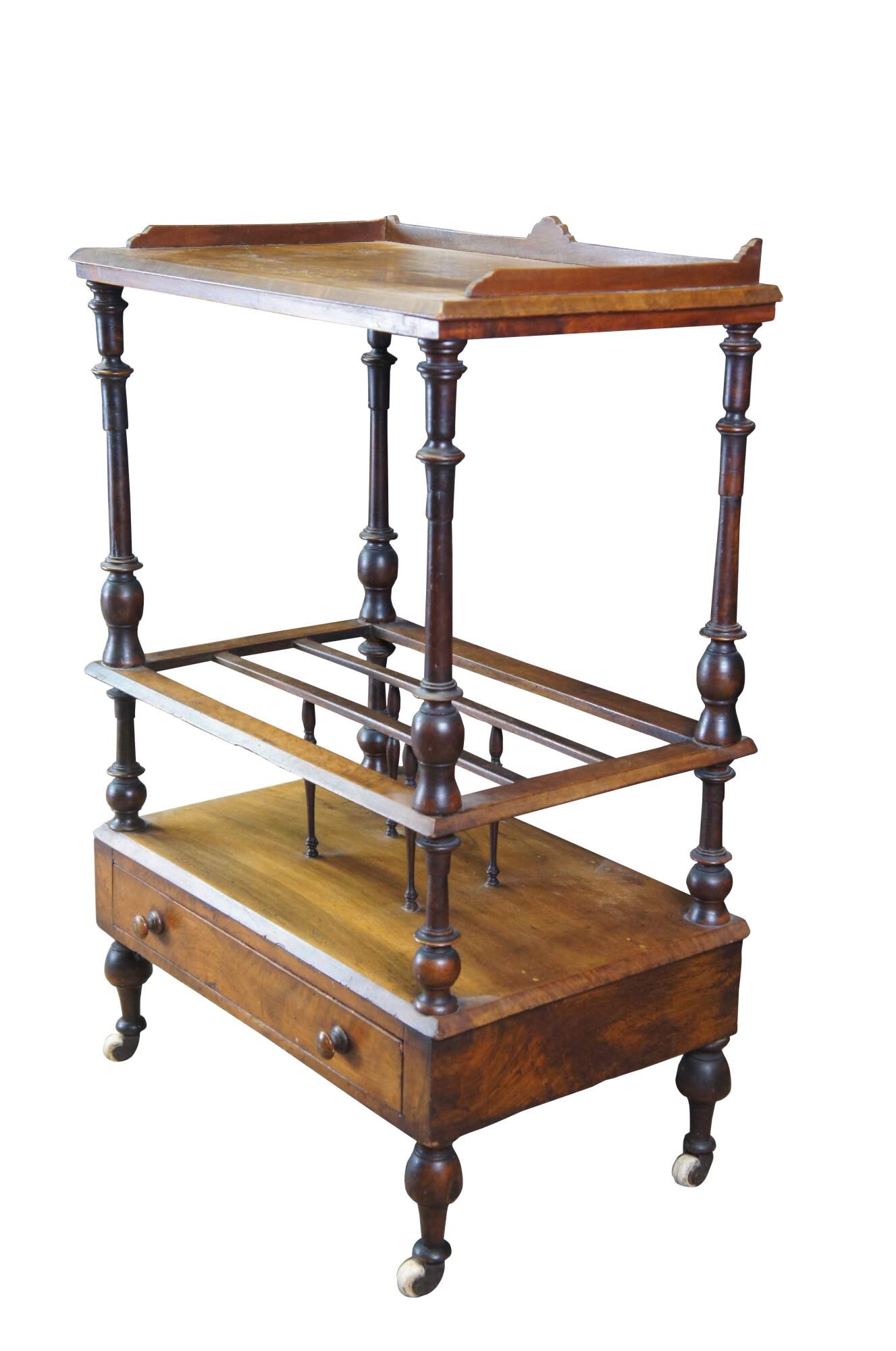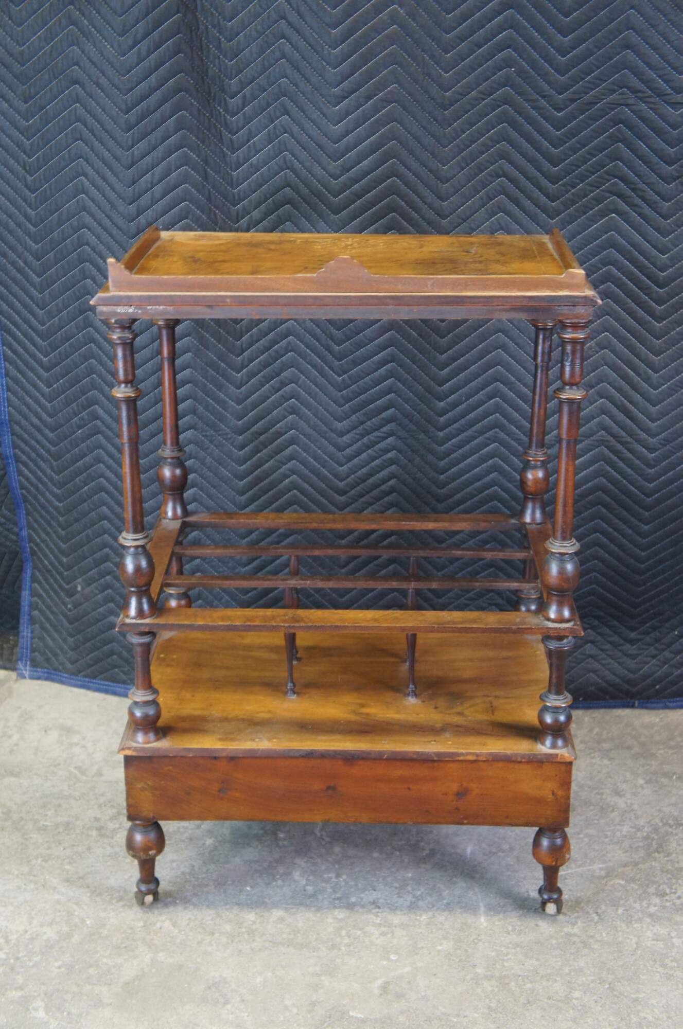 Antique Victorian walnut Canterbury rack / cart. Made of walnut featuring fruitwood inlay and gallery, supported on finely turned columns, the middle section having three divisions which are divided with turned spindles, with a nice moulded edge rail running around the edge, having a single bottom with turned wood knob handles, supported on turned feet terminating on porcelain castors.