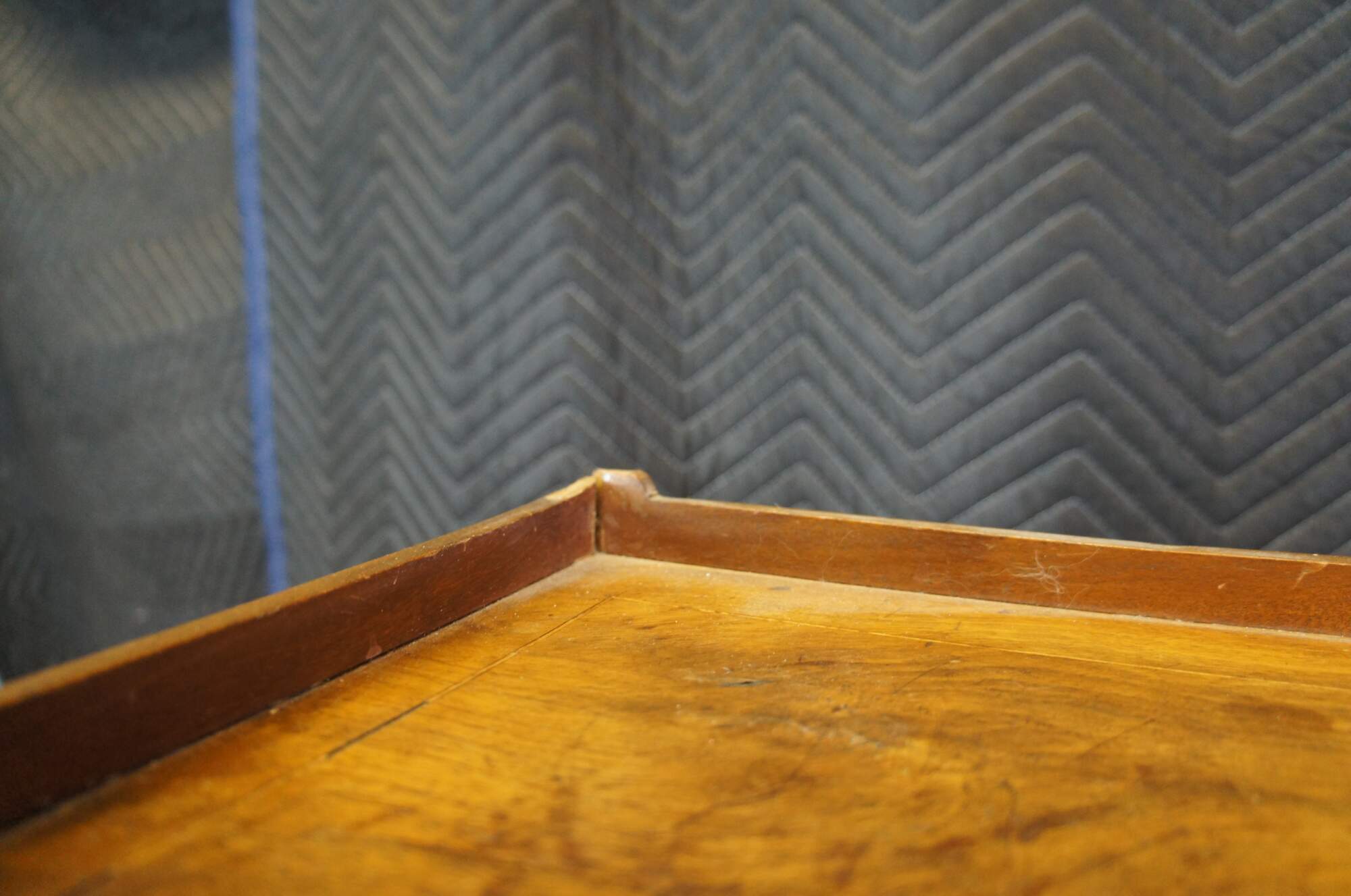 Fair antique condition, wear and distressing commensurate with age and use, finish loss, marking, wear, missing back left gallery corner accent, ring on surface.