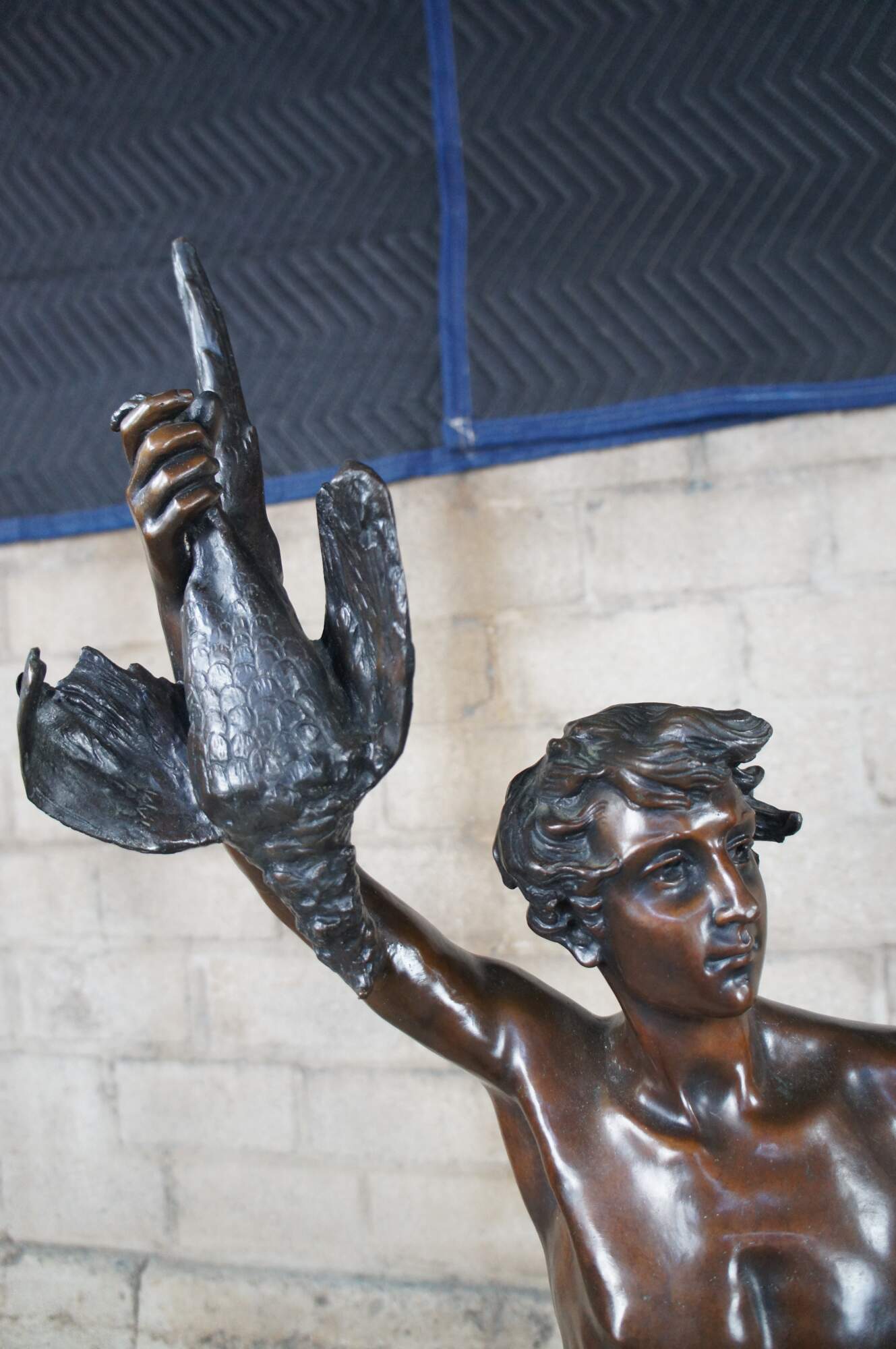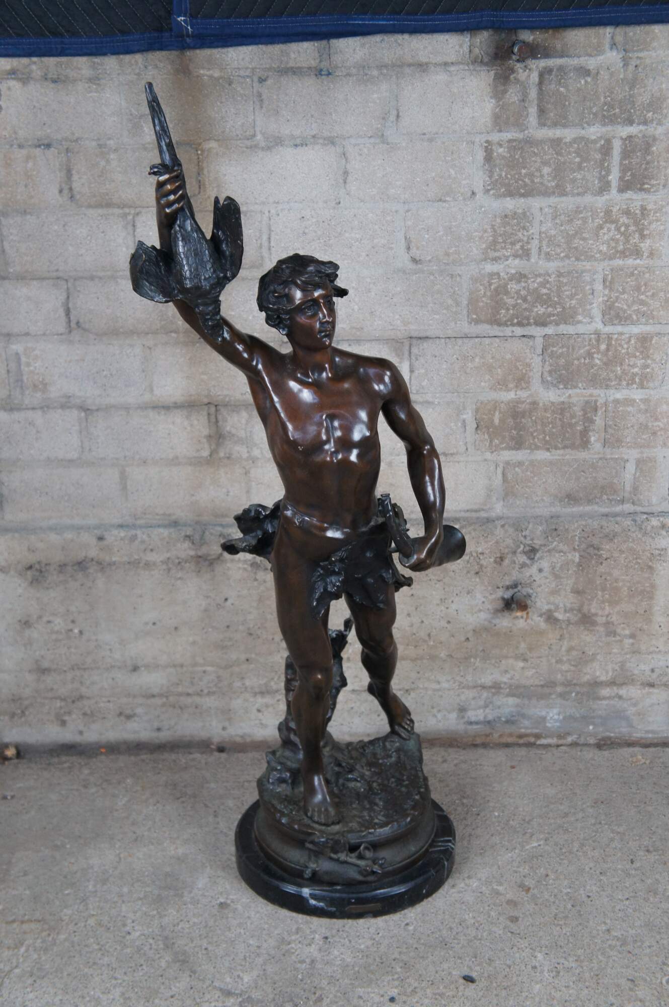 A remarkable French Bronze sculpture of Acteon by Adrein Etienne Gaudez. The statue is sculpted in lifelike detail, featuring Acteon with a bird in his outstretched arm, standing on one leg with a French horn in his other arm. Includes a neat Cartouche label surrounded by a bat and horn. The bronze is signed along the top of the base and rests on a marble plinth.