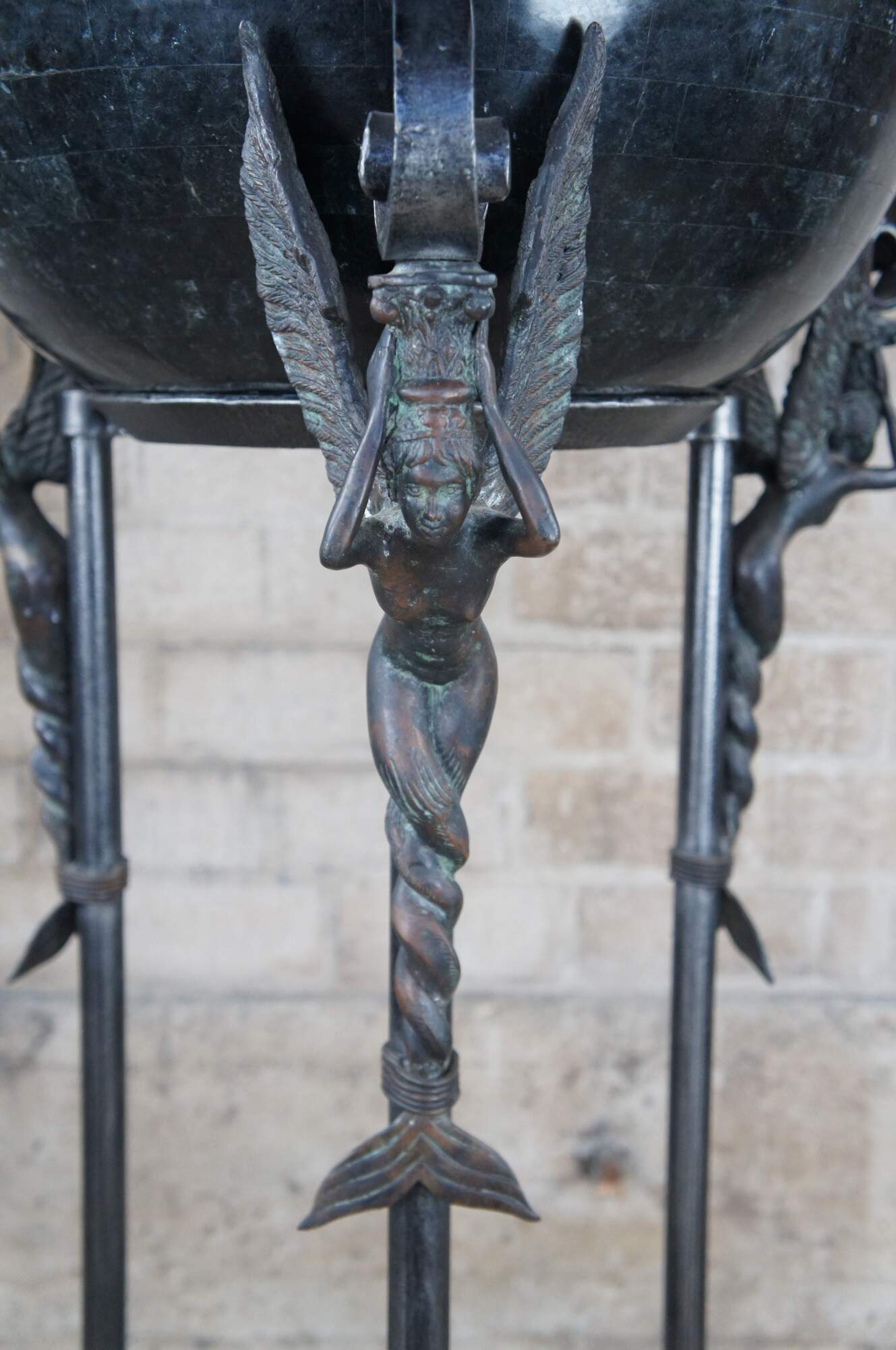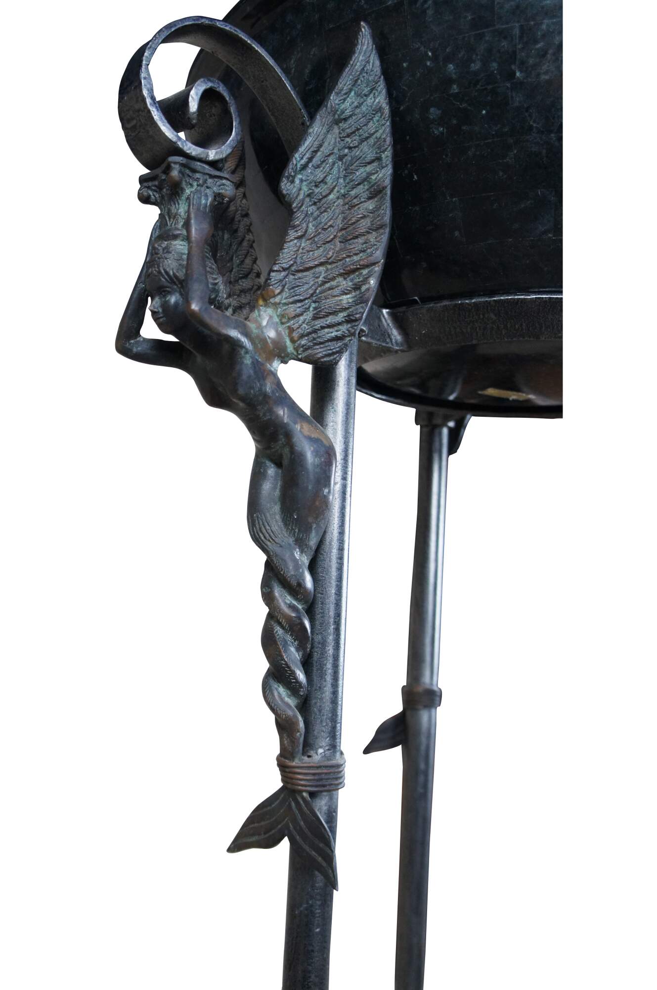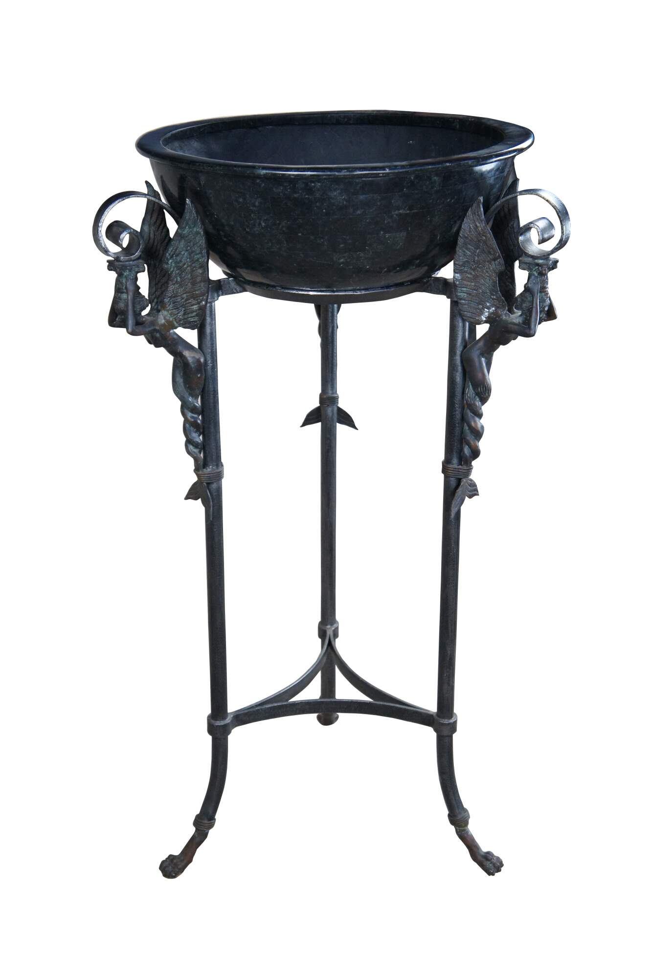 An impressive cauldron or planter by Maitland-Smith, circa 1990s. Made from iron and bronze in French Empire styling. Features a tessellated marble plater or bowl over a figured scrolled iron and bronze tripod base. The stand features figural winged maidens or mermaids and paw feet. A glass top could be added to turn into a fun bar pub table. Marked along underside of bow.