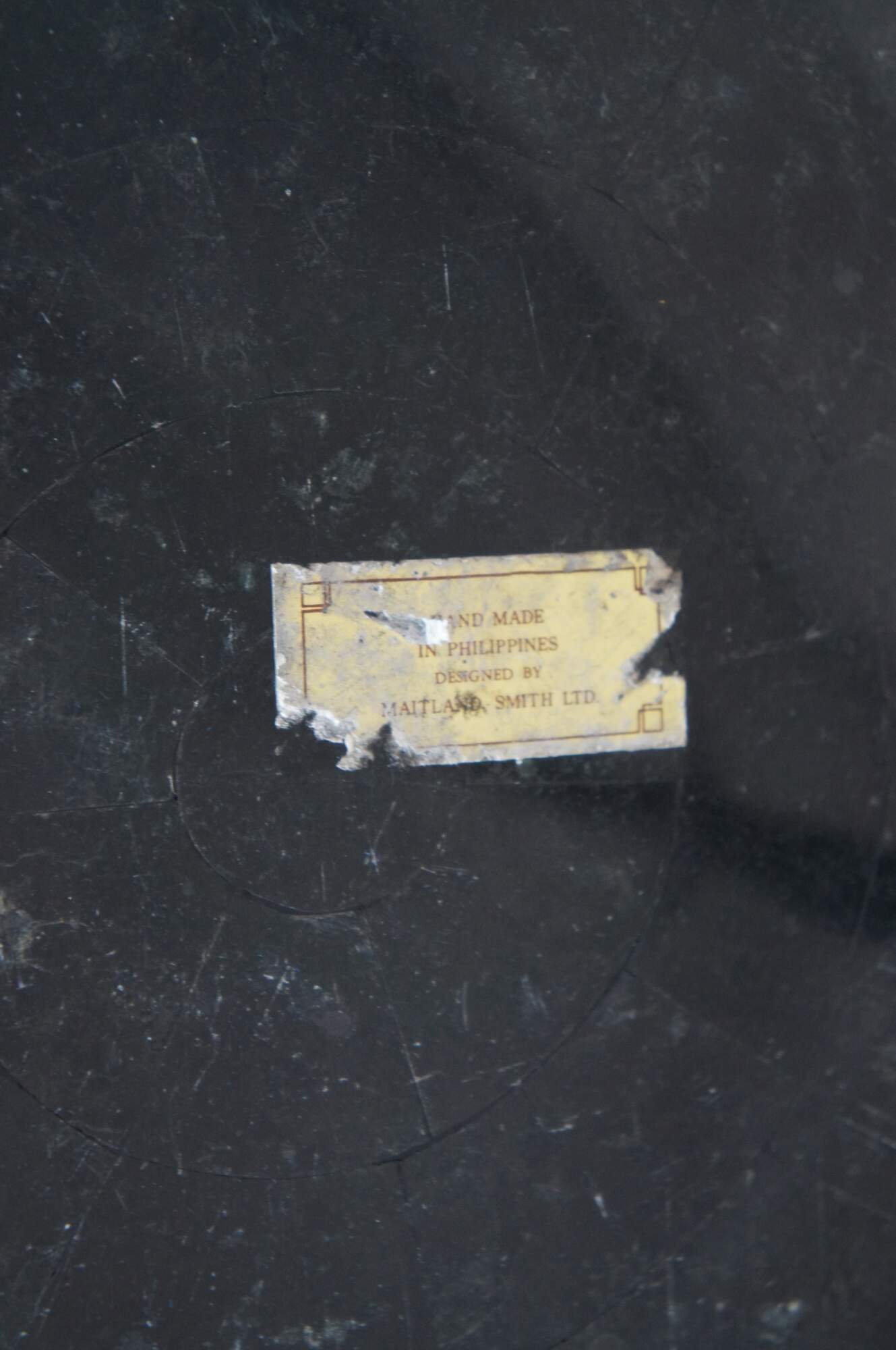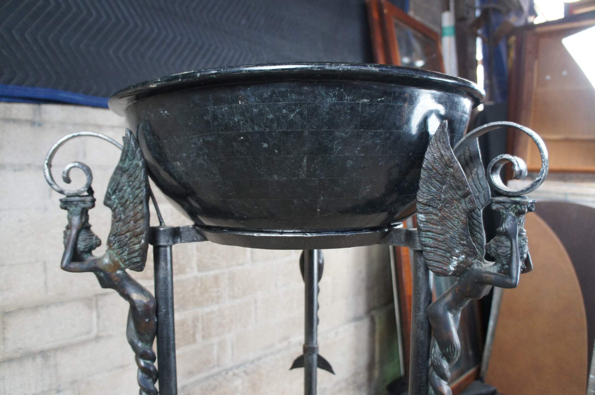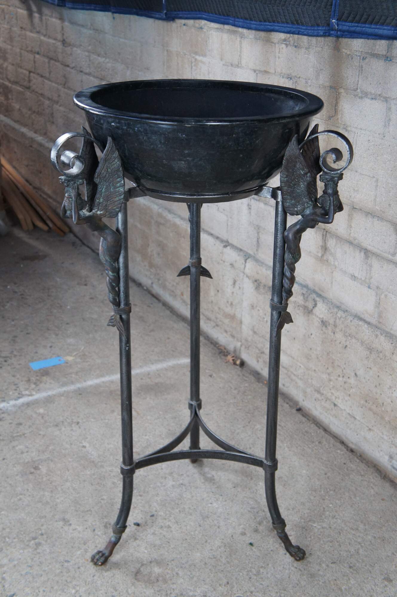 An impressive cauldron or planter by Maitland-Smith, circa 1990s. Made from iron and bronze in French Empire styling. Features a tessellated marble plater or bowl over a figured scrolled iron and bronze tripod base. The stand features figural winged maidens or mermaids and paw feet. A glass top could be added to turn into a fun bar pub table. Marked along underside of bow.