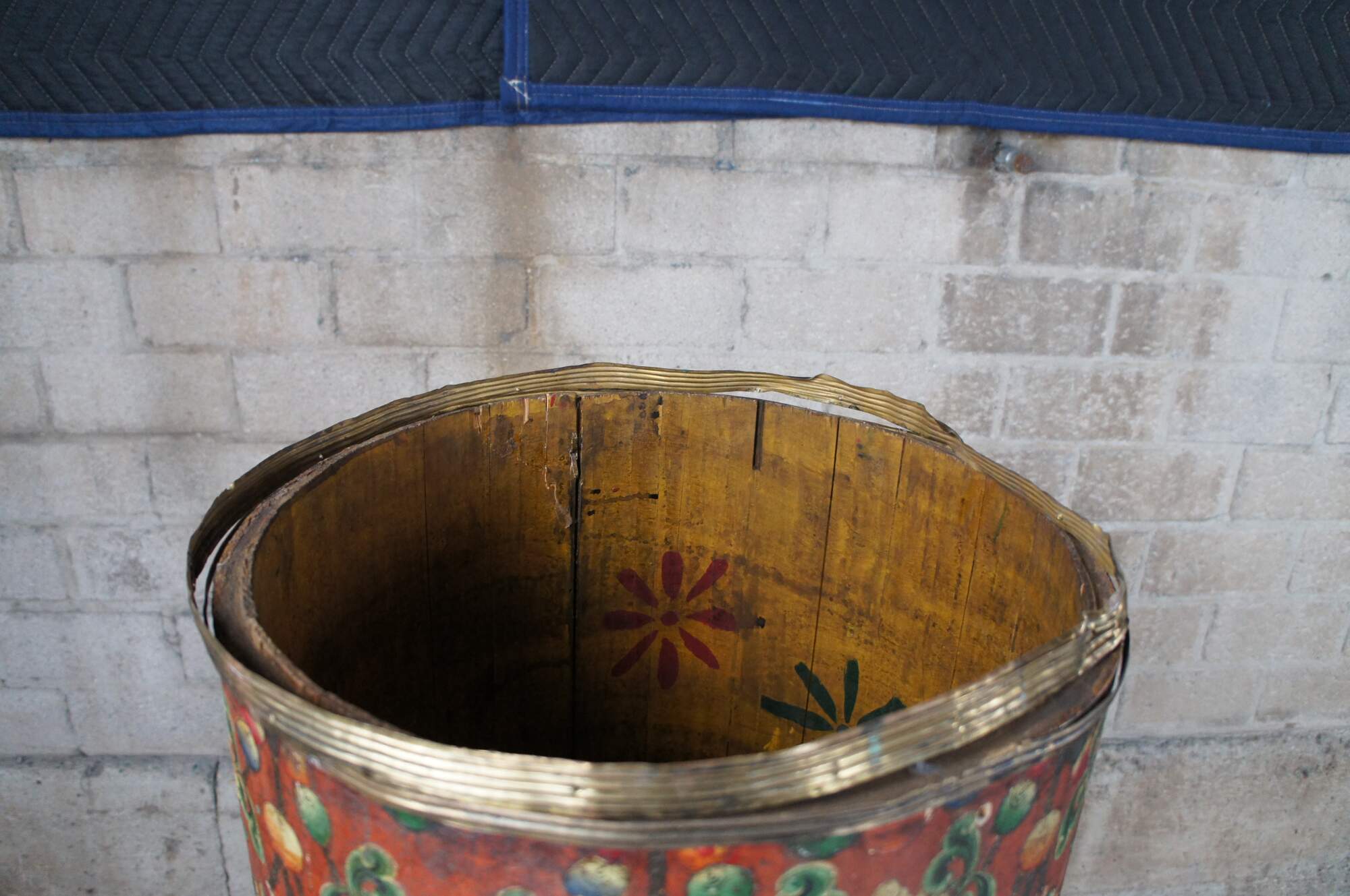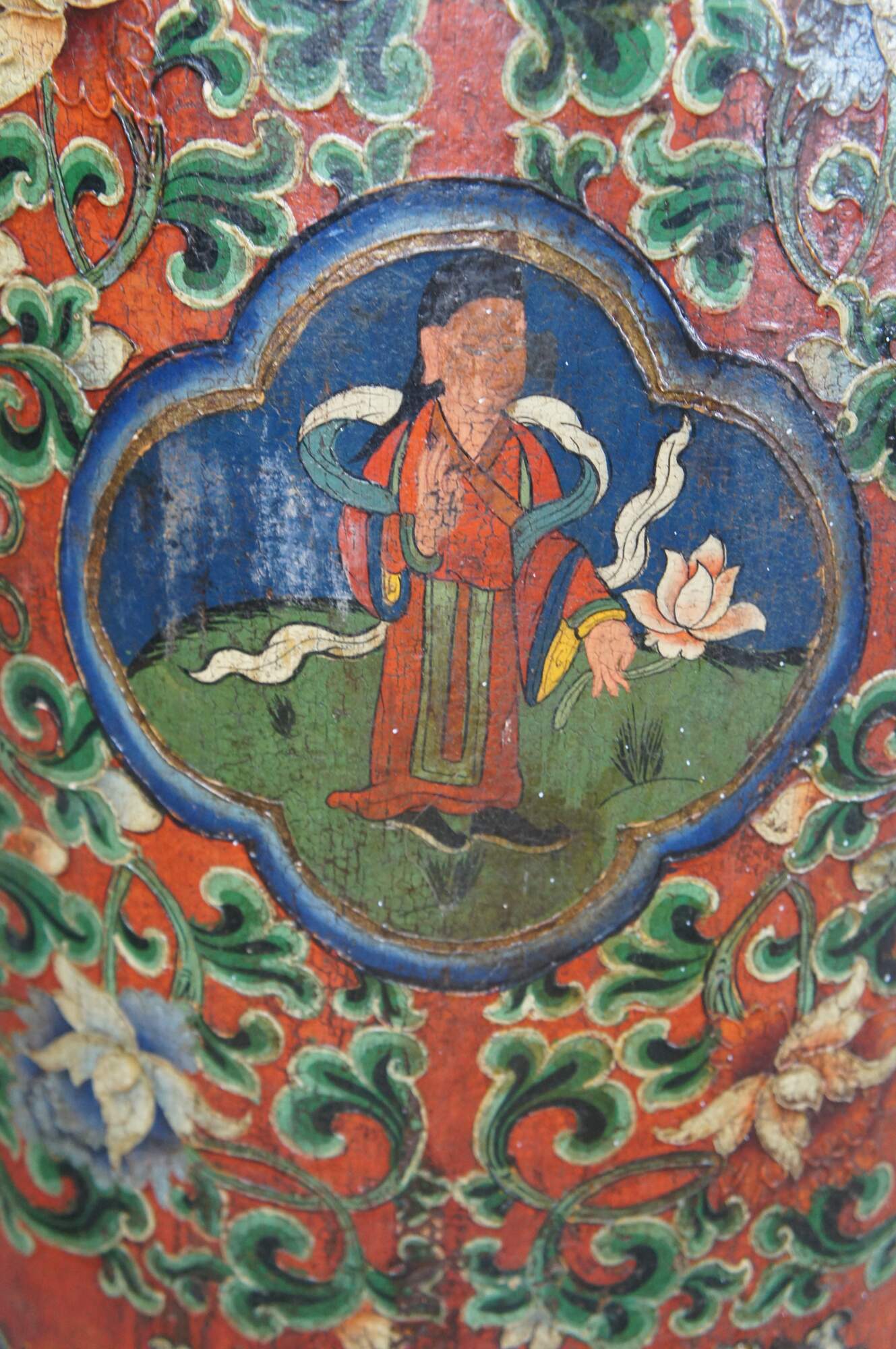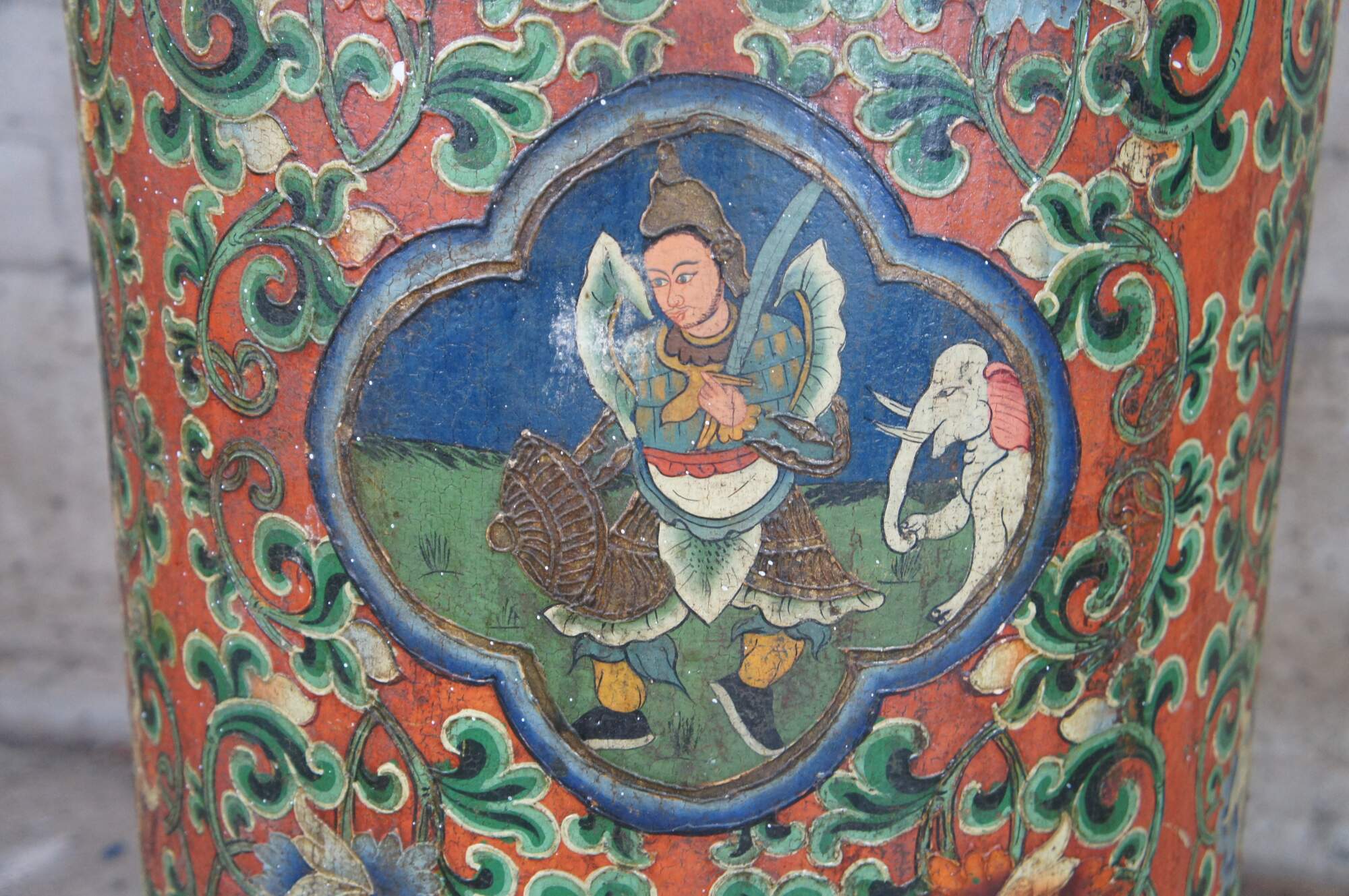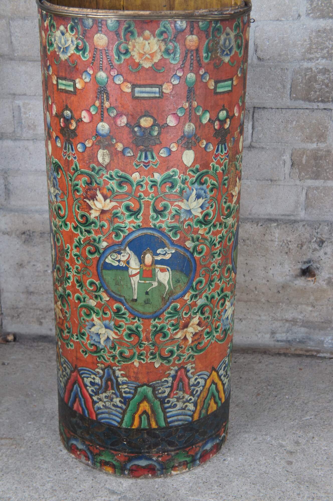 20th Century Tibetan hand painted cylindrical box, barrel, bin or umbrella stand. Features a vibrant polychrome pattern featuring foliate and beaded designs. Mountains and clouds can be seen at the base as well as a different figure at every quarter turn of the vessel. Originally used as a box with latch and lid. Without the top it will make a great cane or umbrella stand. Circa first half 20th century