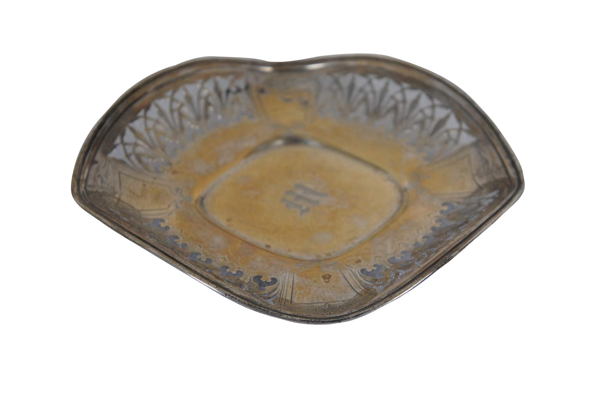 Late 19th to early 20th century sterling silver serving tray / dish, item number 1713, by James E. Blake & Company. Square serpentine shape with rounded corners and sides ruffled upward. Pierced leaf motif with etched foliate shields at the corners and engraved initial M at the center.