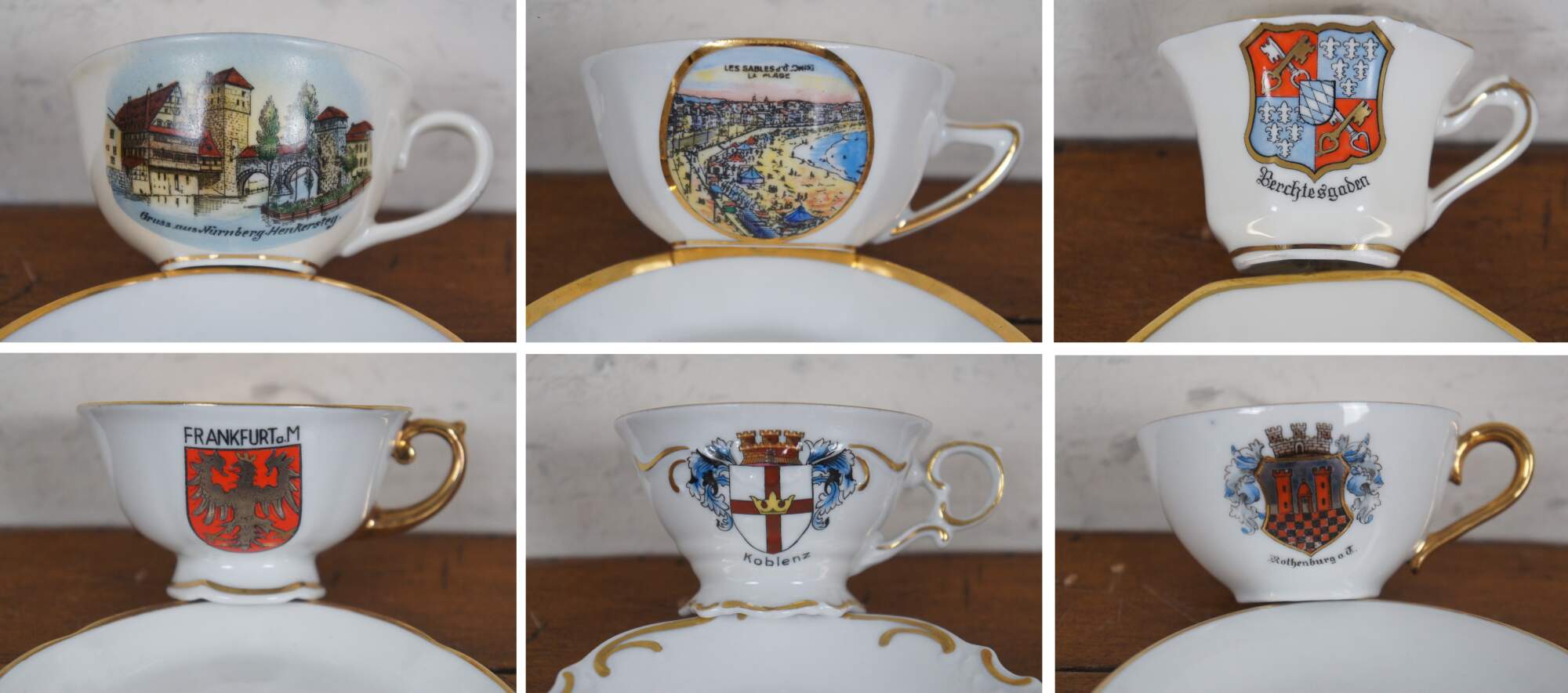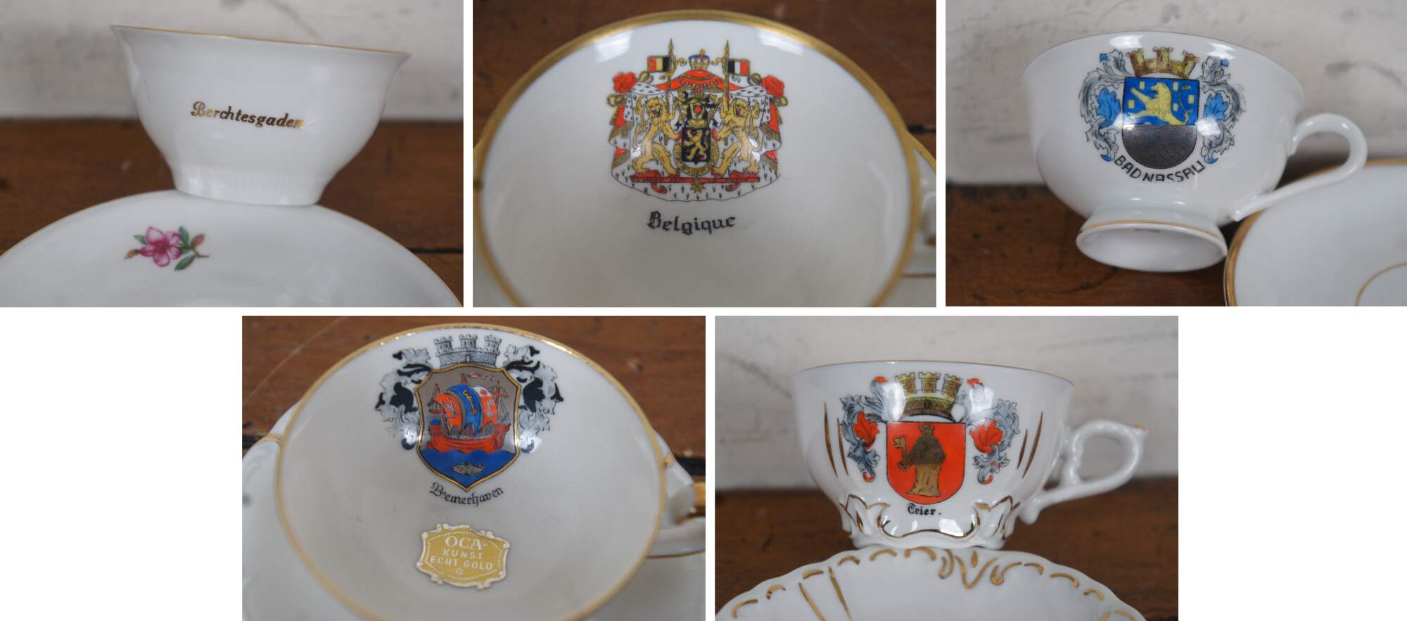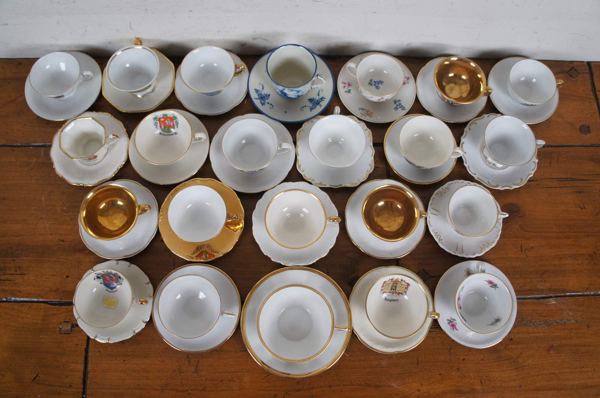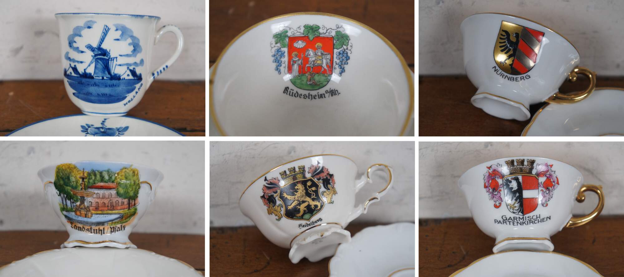Lot of 23 20th century porcelain teacups and saucers - souvenirs representing Holland, Belgium, Luxembourg, and an array of German cities. Manufacturers include: Johann Haviland, Gerold & Co, RW, Alka, Porcelaine de France, Koenigszelt, Langenthal, PMR, Hoehr, and Waldershof.