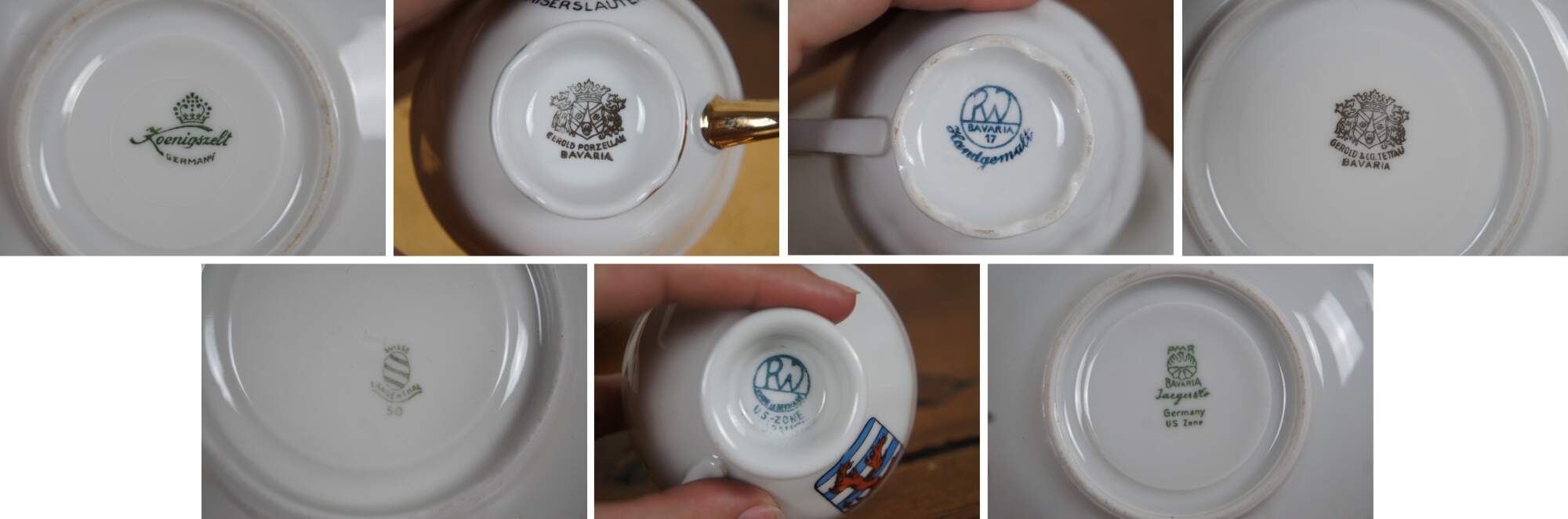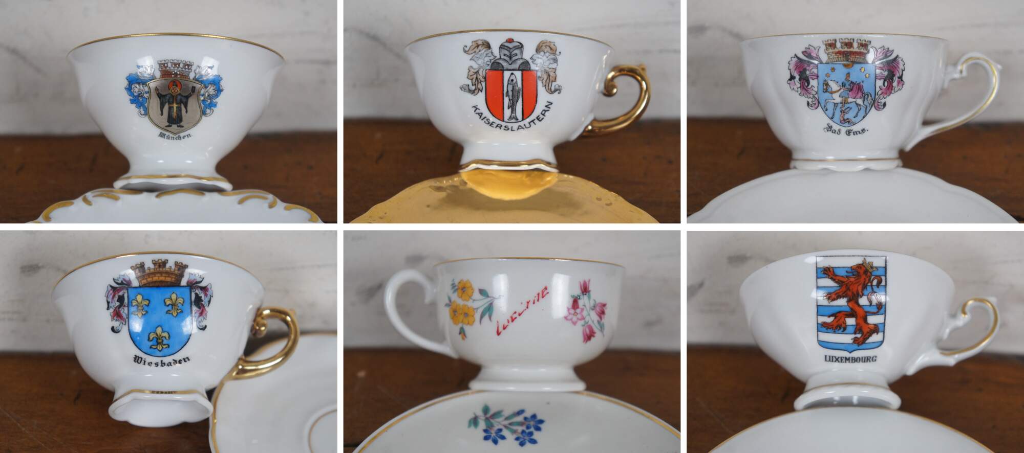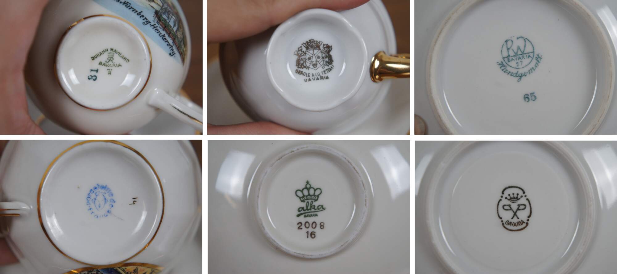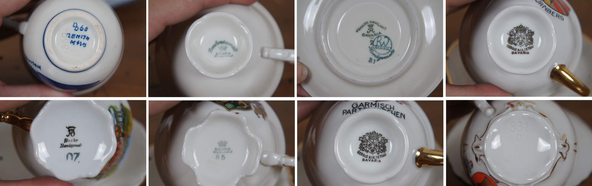 Lot of 23 20th century porcelain teacups and saucers - souvenirs representing Holland, Belgium, Luxembourg, and an array of German cities. Manufacturers include: Johann Haviland, Gerold & Co, RW, Alka, Porcelaine de France, Koenigszelt, Langenthal, PMR, Hoehr, and Waldershof.