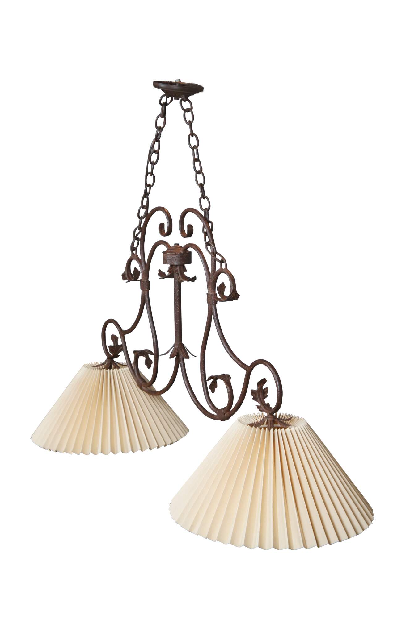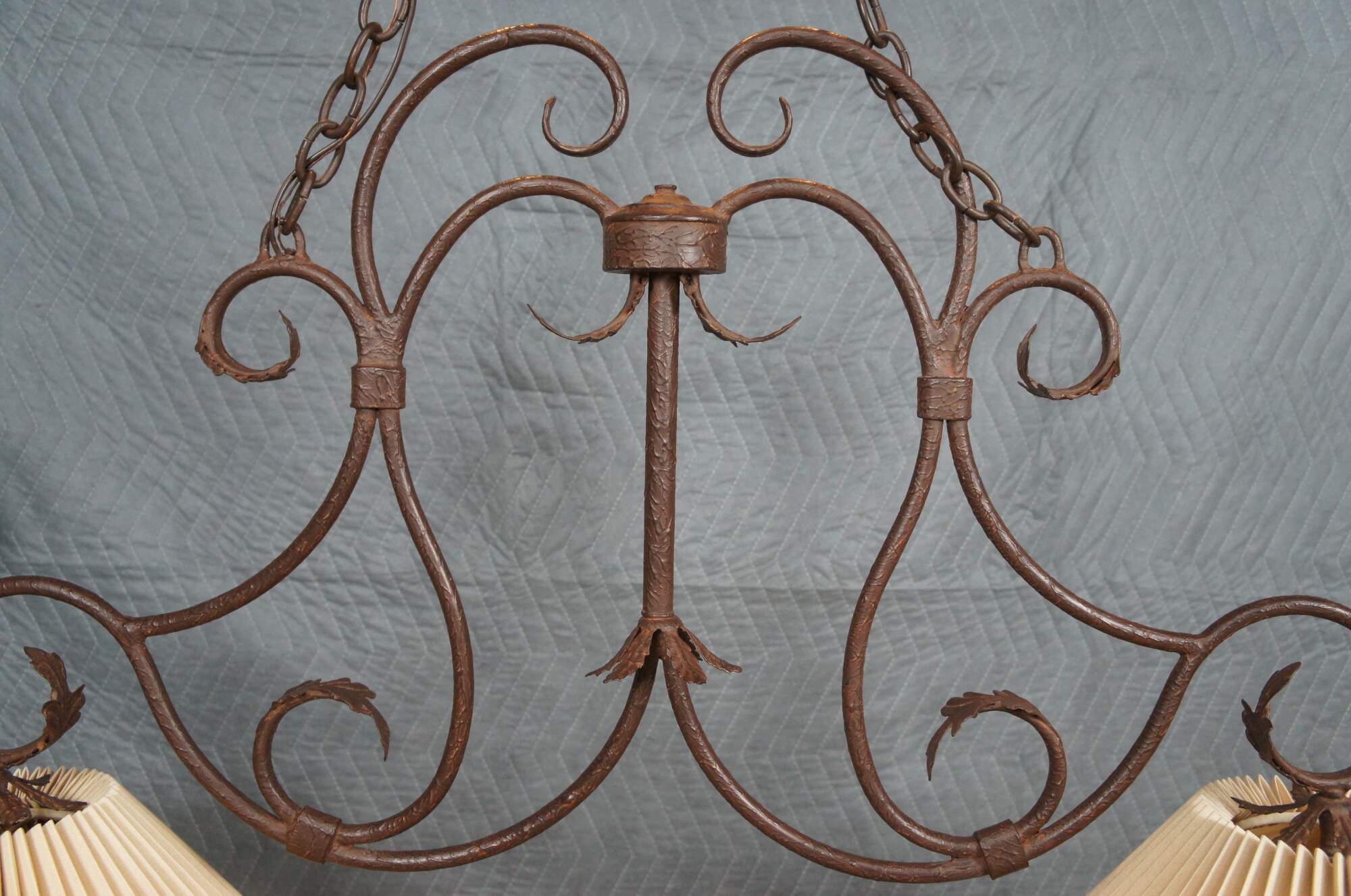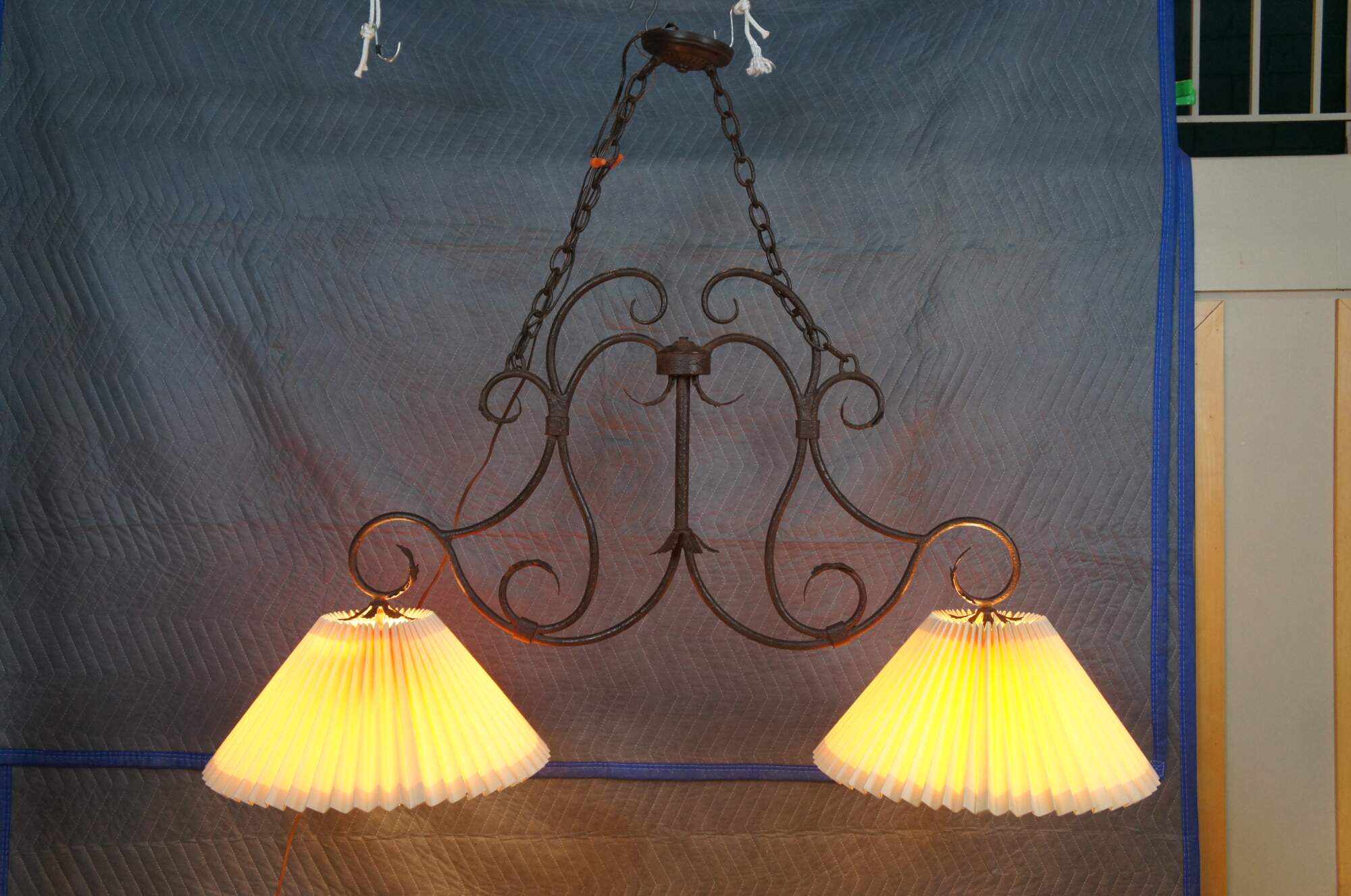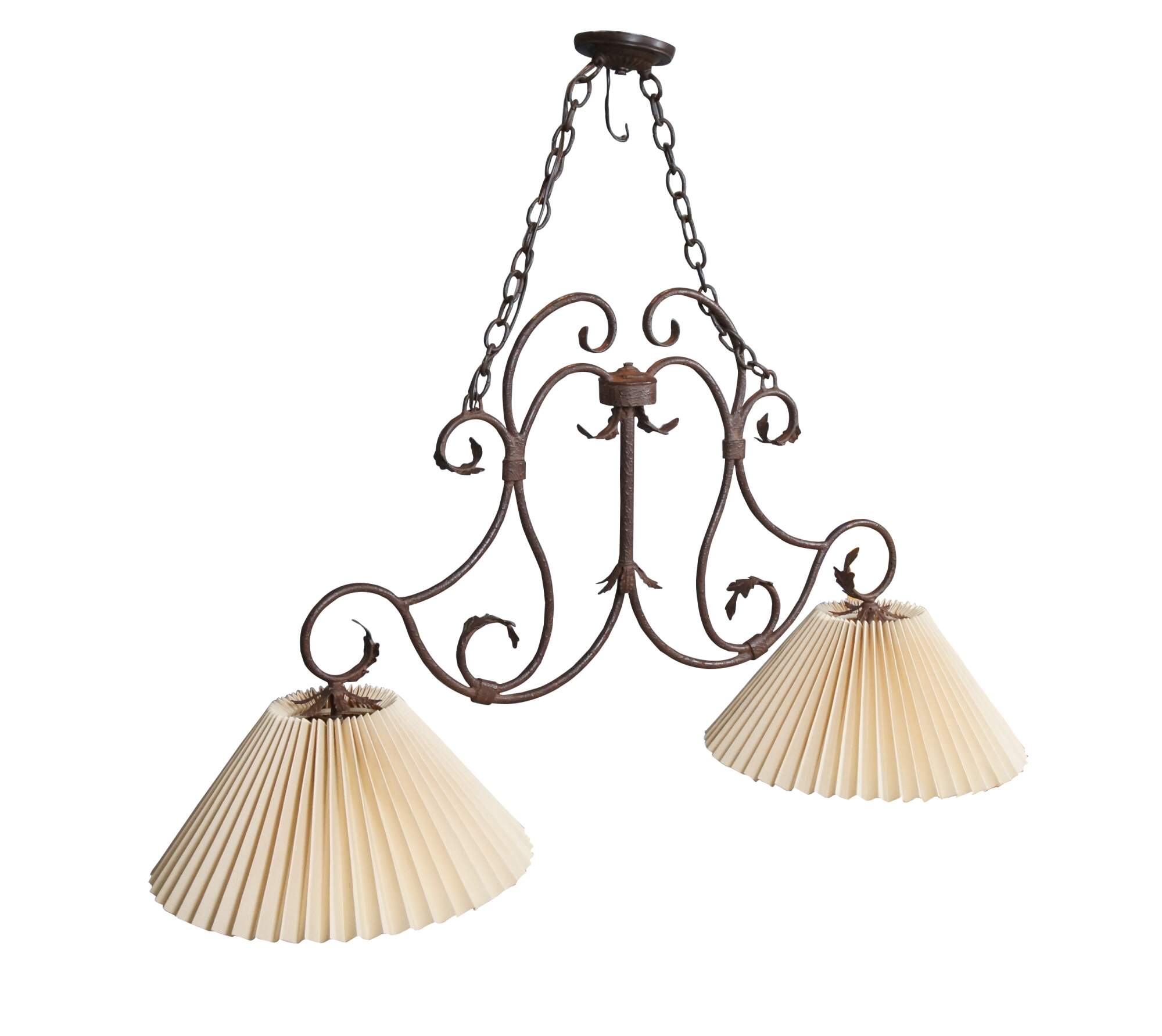 Late 20th century wrought metal 2 arm island / pool / pendant chandelier by Dana Creath Designs. A slender design of swirling bars tipped at the ends with acanthus leaves and suspending a pair of lights. Rough bronze finish. Includes pleated fabric shades with plastic covers. Hard wired.
