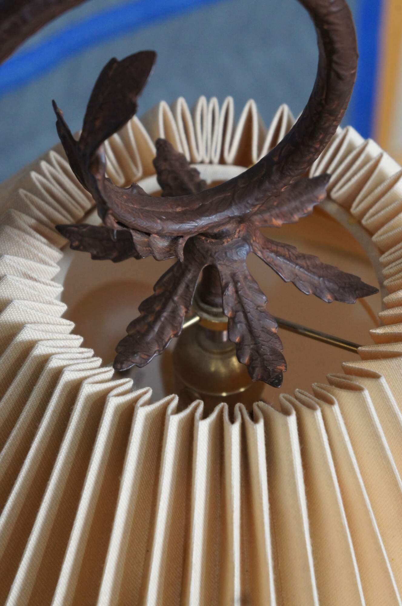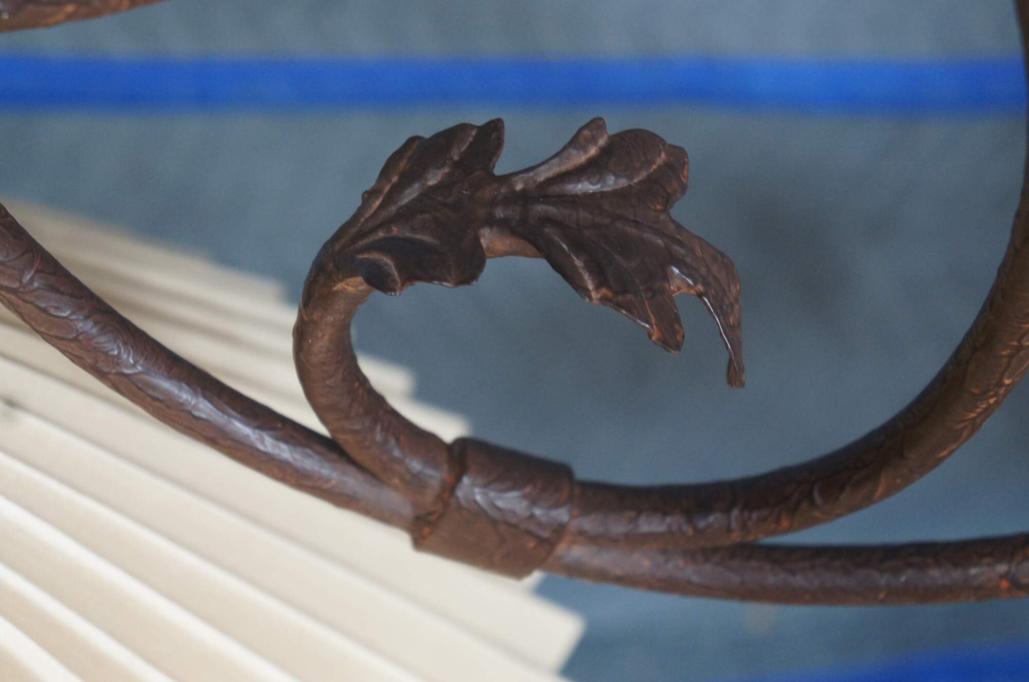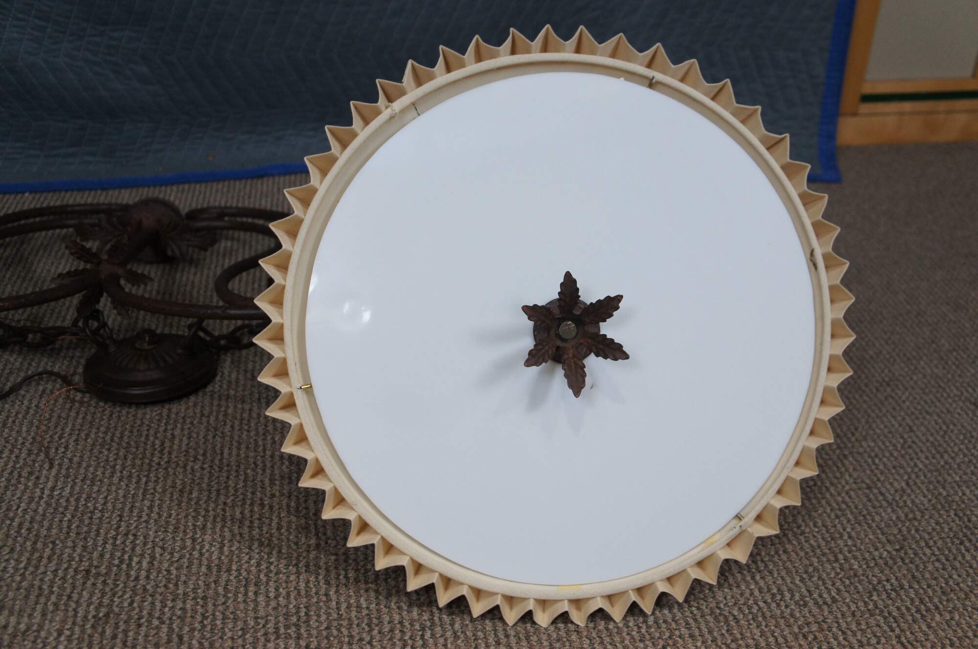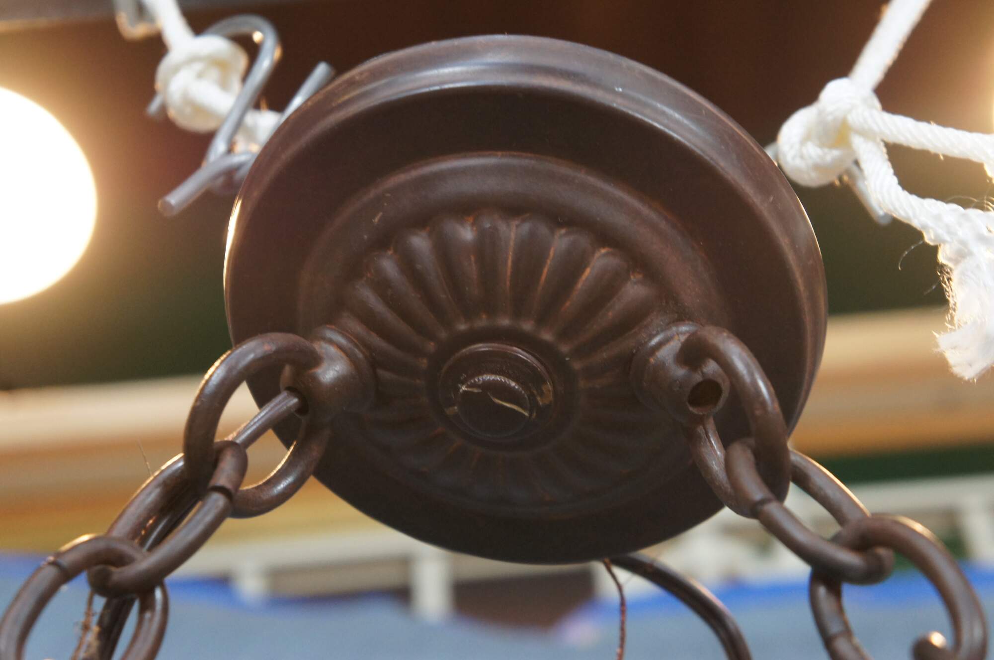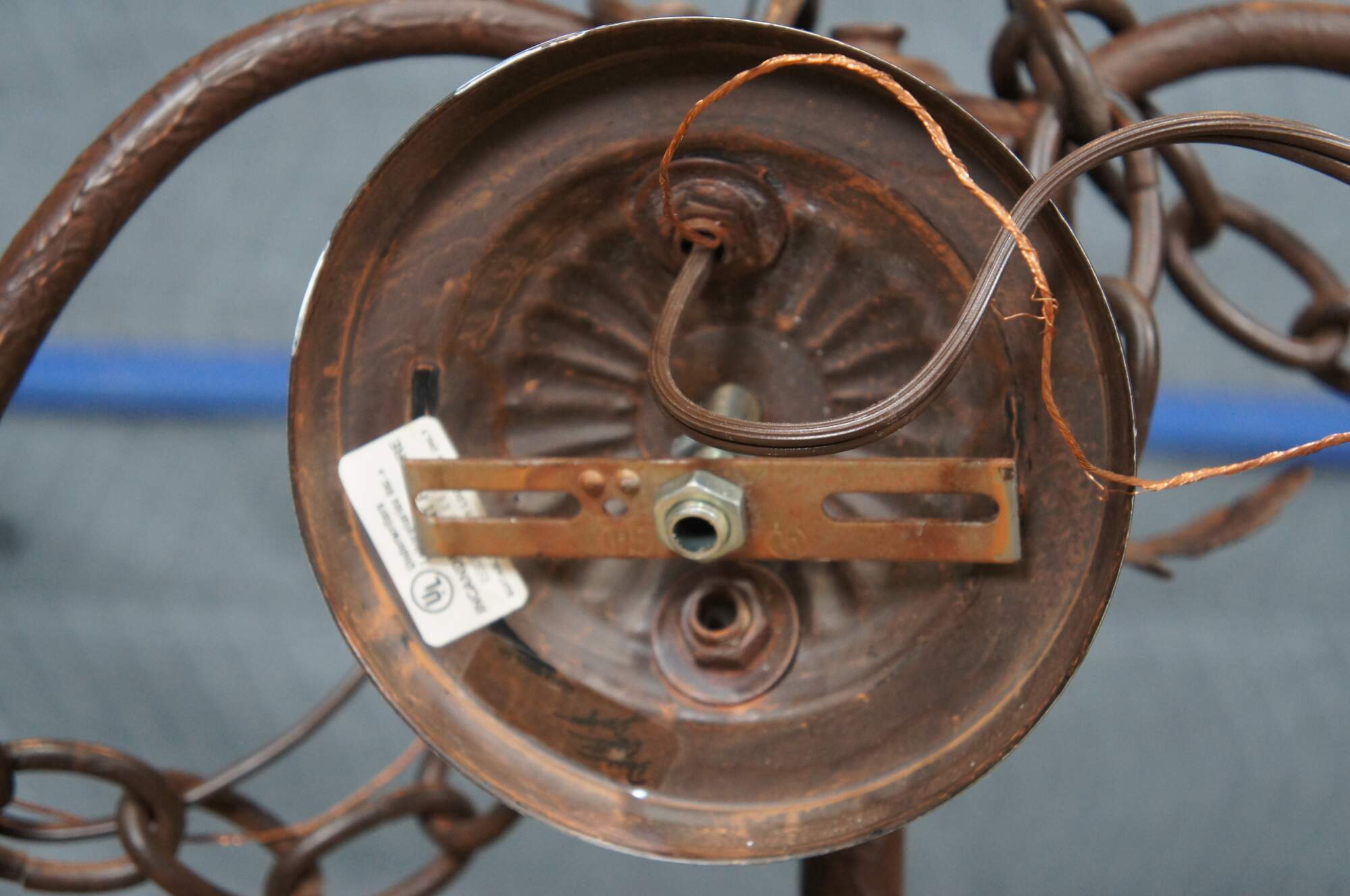 Late 20th century wrought metal 2 arm island / pool / pendant chandelier by Dana Creath Designs. A slender design of swirling bars tipped at the ends with acanthus leaves and suspending a pair of lights. Rough bronze finish. Includes pleated fabric shades with plastic covers. Hard wired.