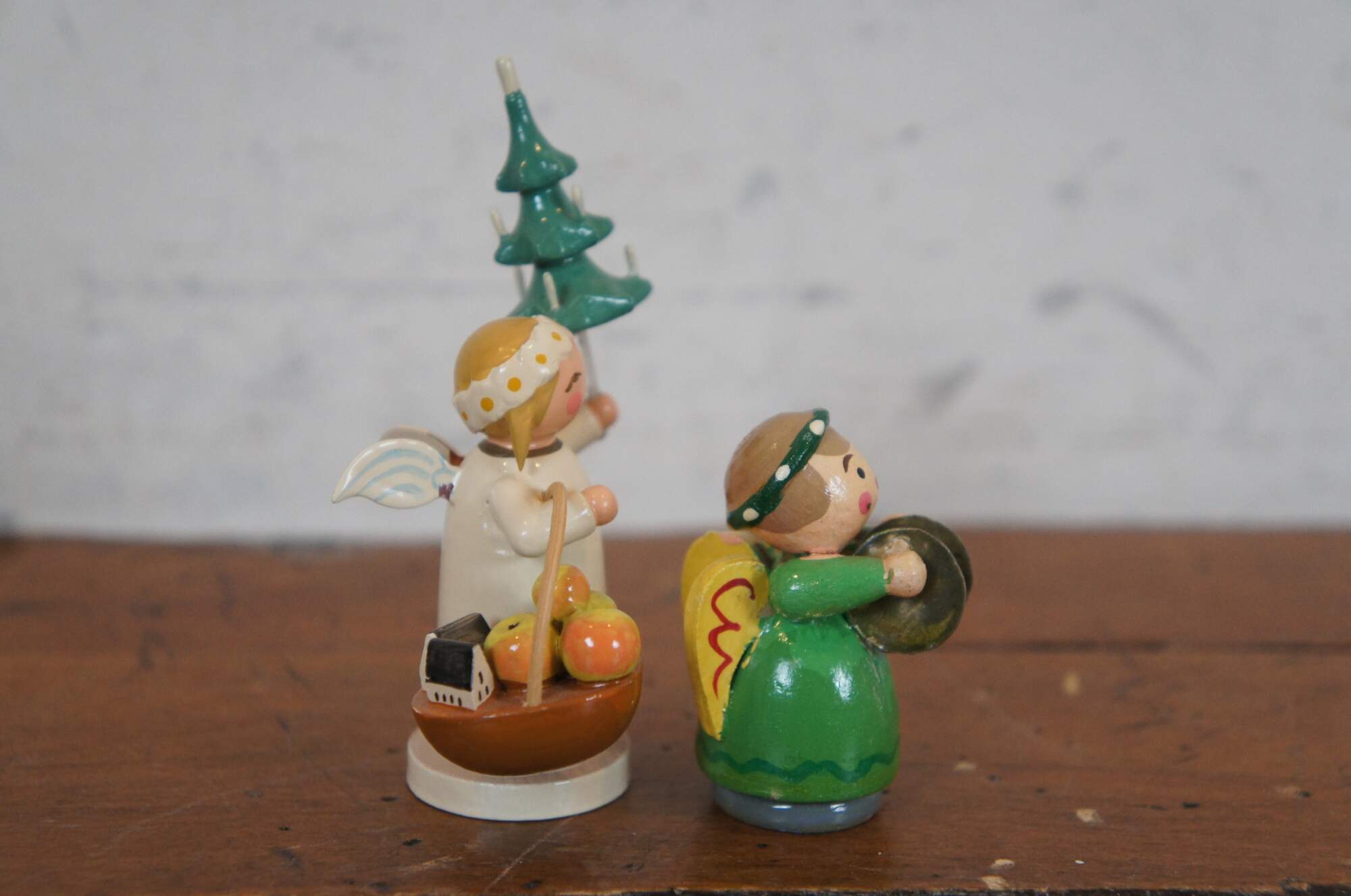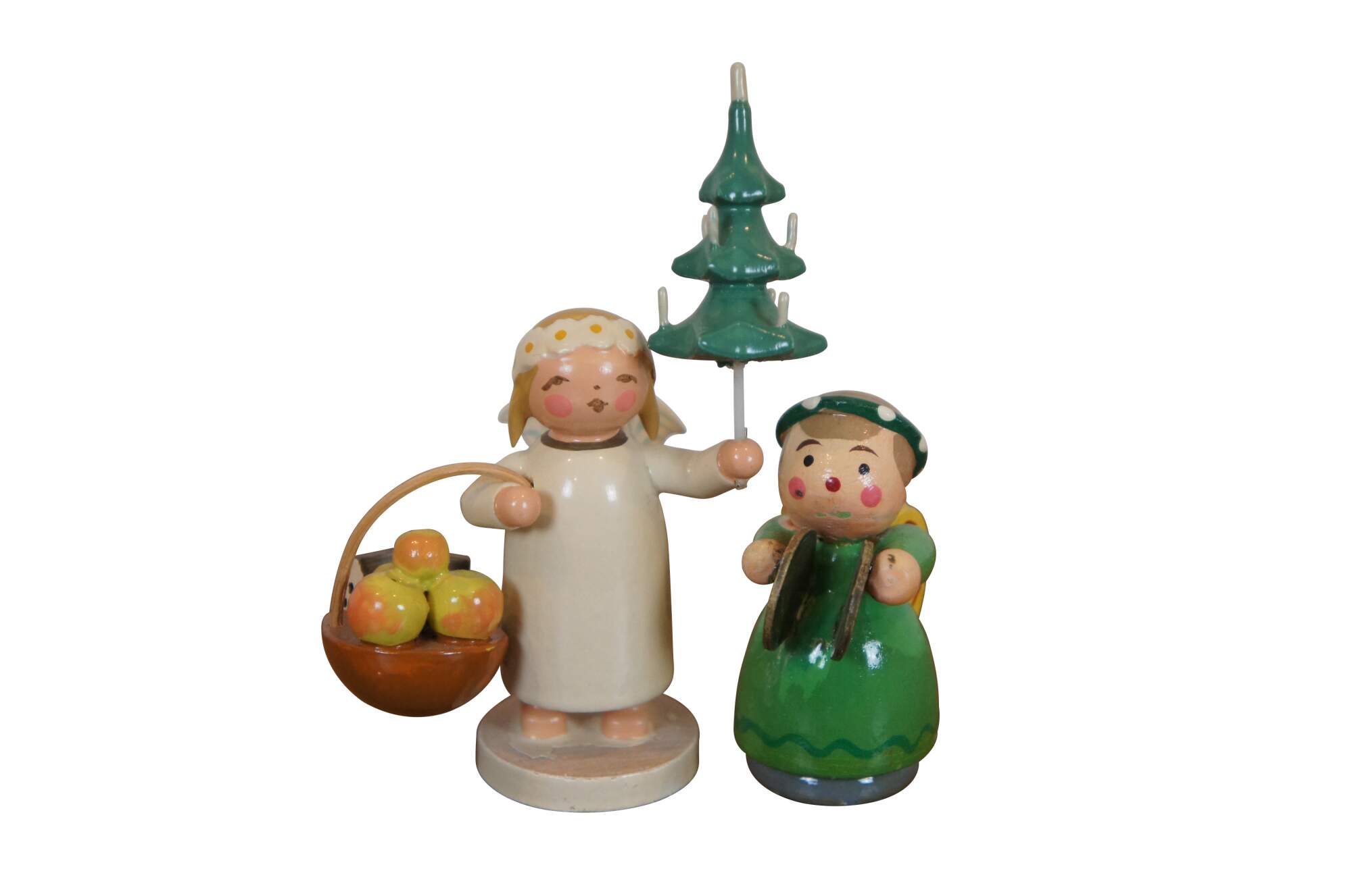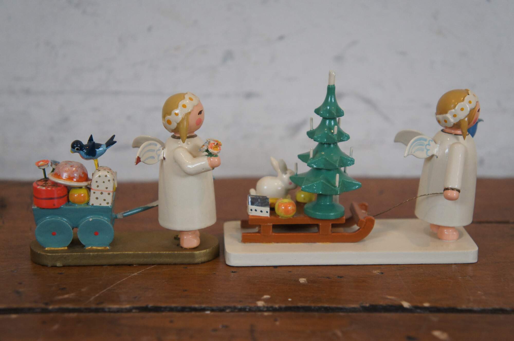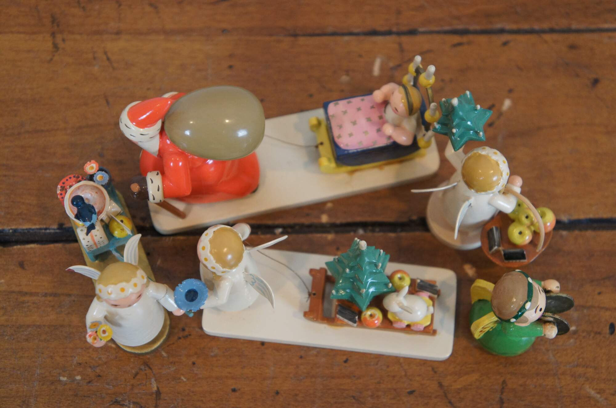 Set of 5 hand crafted wooden Christmas figurines by Wendt and Kuhn under the Expertic label. Set includes: Santa Claus with a child in a candelit sled, Marguerite angel with wagon of gifts, Marguerite angel with sled and tree, Marguerite angel with tree and basket of apples, and one additional Erzgebirge angel in green with cymbals and yellow wings. Made in East Germany.