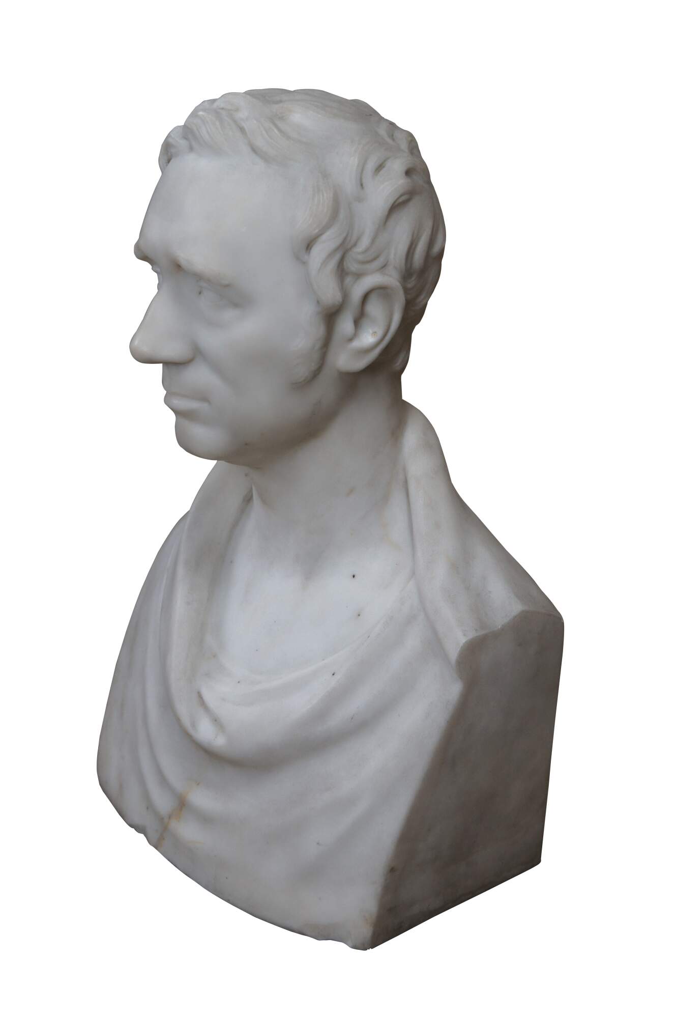 Antique marble bust of a young Isaac Newton with cropped shoulders. A stately sculpture for display in your library, office or living space.