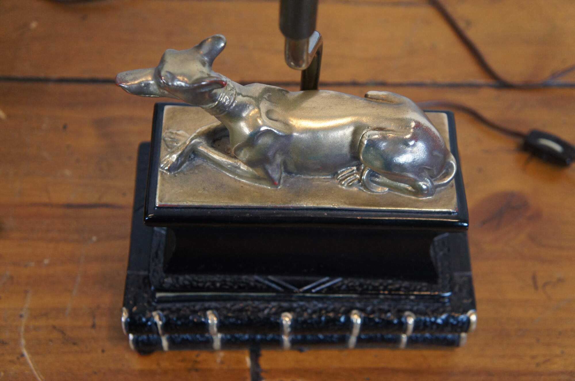 Vintage 1973 Chapman Mannufacturing Company table lamps. Composite material showing dogs (whippets) reclining on a plinth, perched on a small stack of books, finished in black and gold. Includes spear shaped finials and black paper shades with foiled interior.