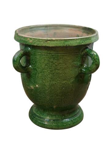 Antique French green glazed Terracotta earthenware garden planters. Wide trophy urn shape with drain hole, footed base and four lobed handles. Handmade in France