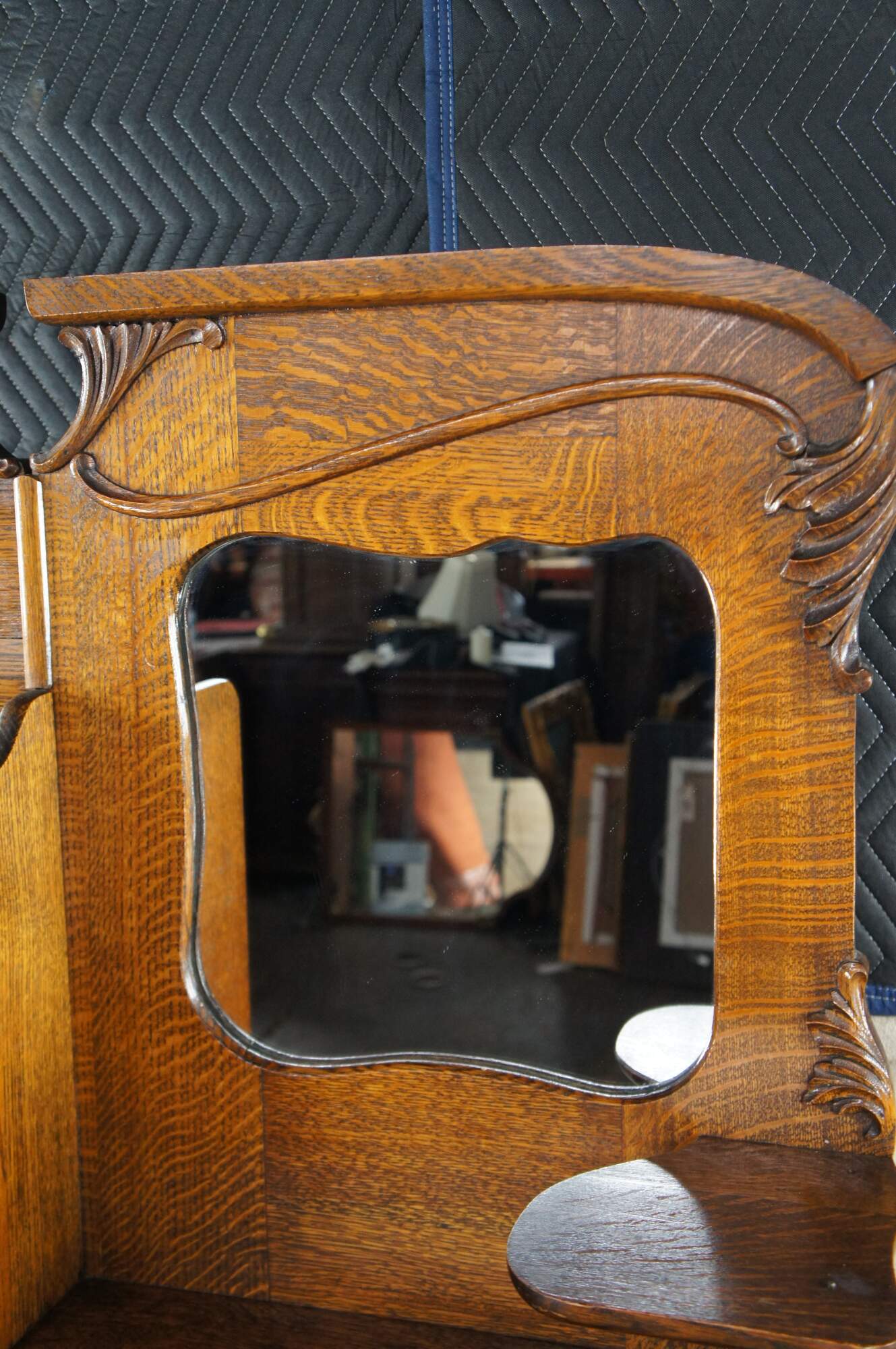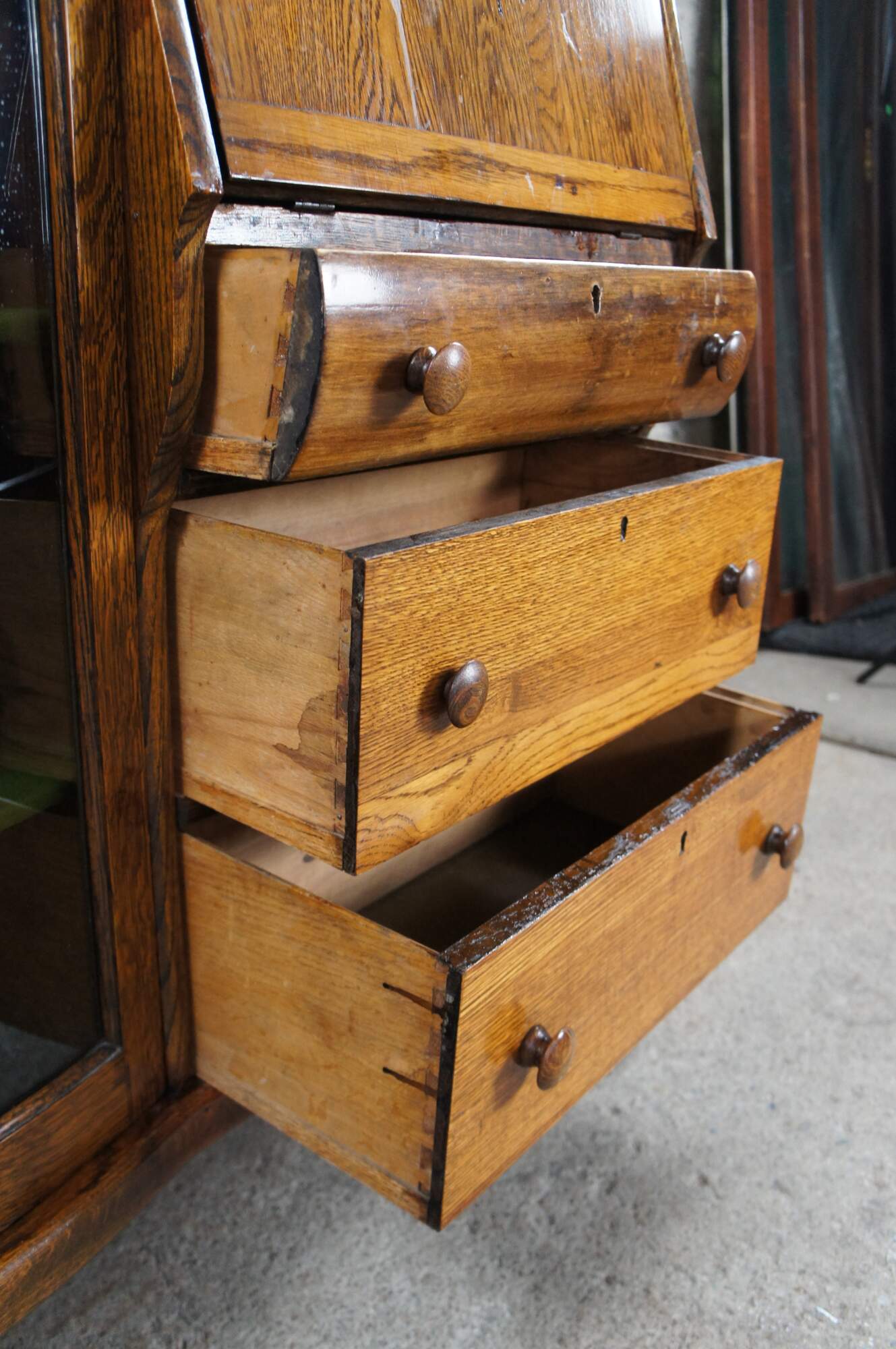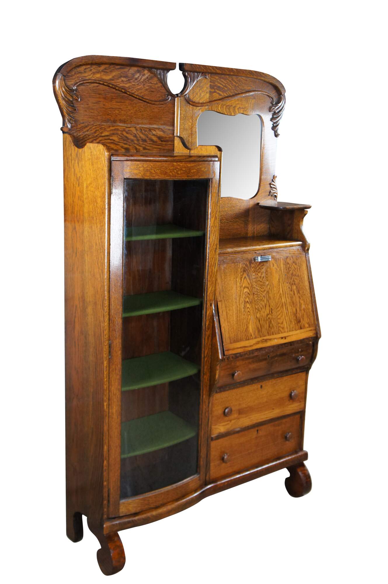 Antique Victorian Lima Tea Company side by side / secretary desk / bookcase / display case. Made of quartersawn oak featuring Art Nouveau styling with open pediment and carved acanthus accents over a curved glass front curio cabinet next to a drop front secretary that opens to writing surface with multiple cubbies and a drawer. Flanking the secretary there is a vanity mirror and shelves, as well as lower drawers with turned knobs, which are all supported by scrolled feet.