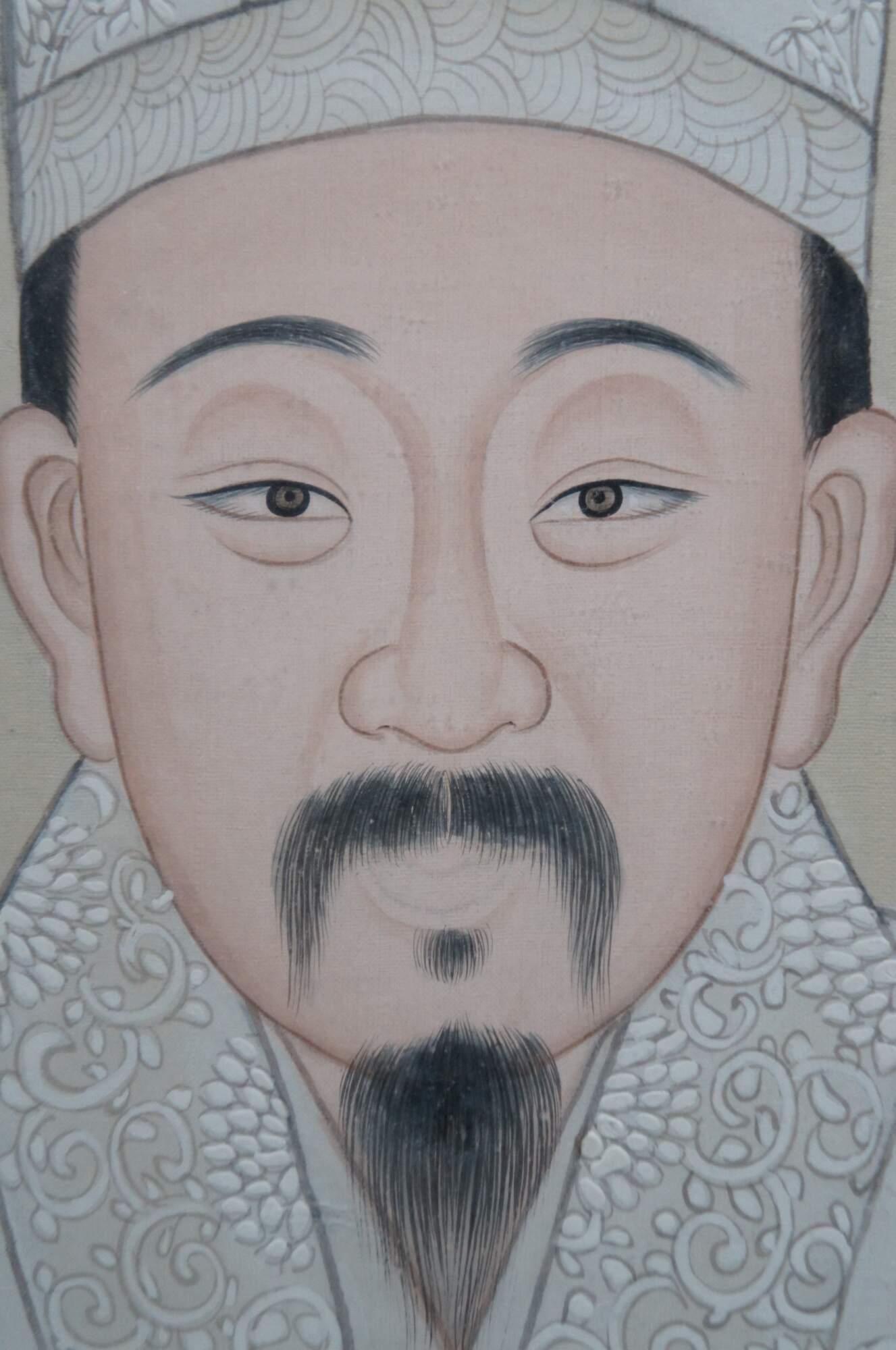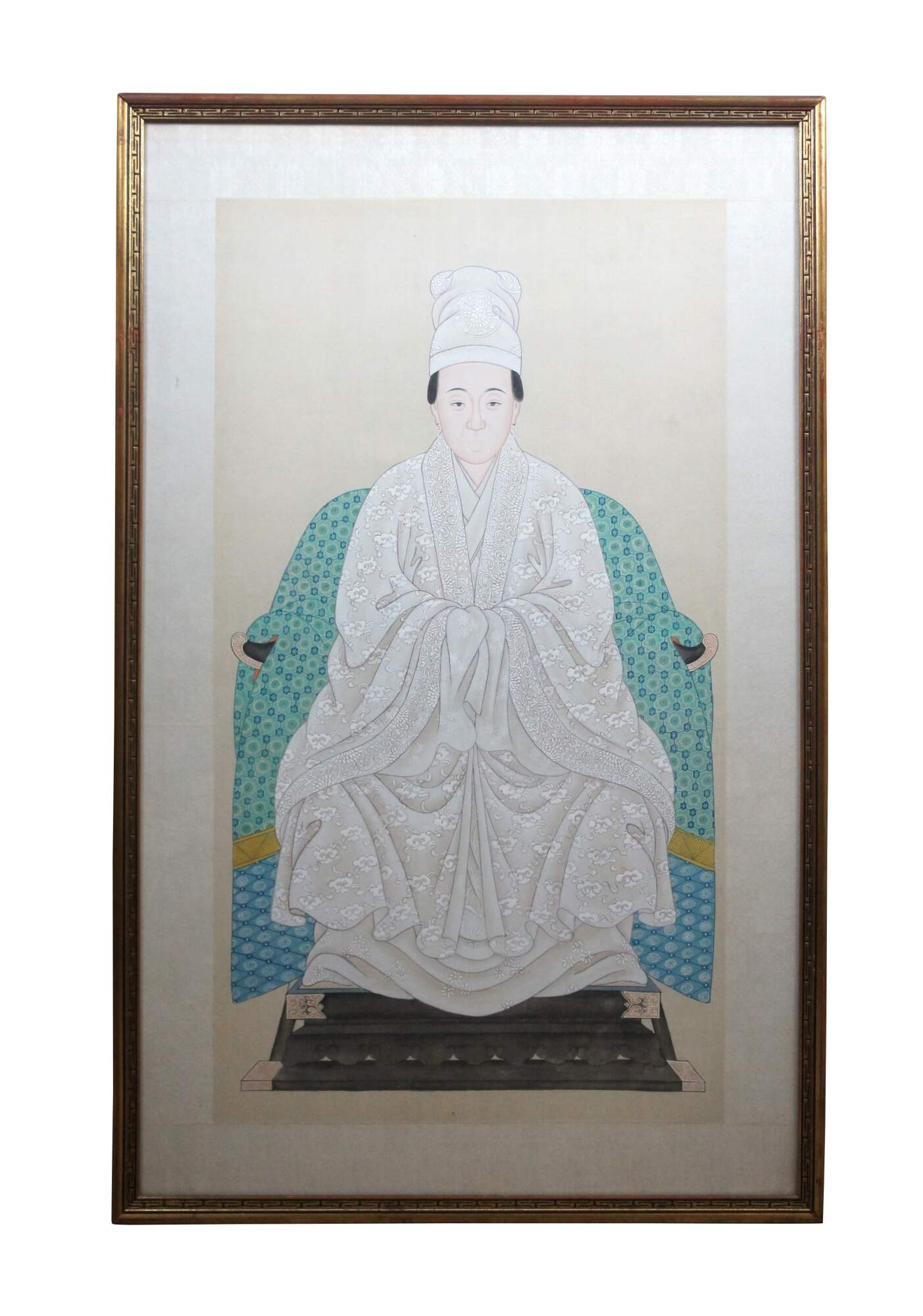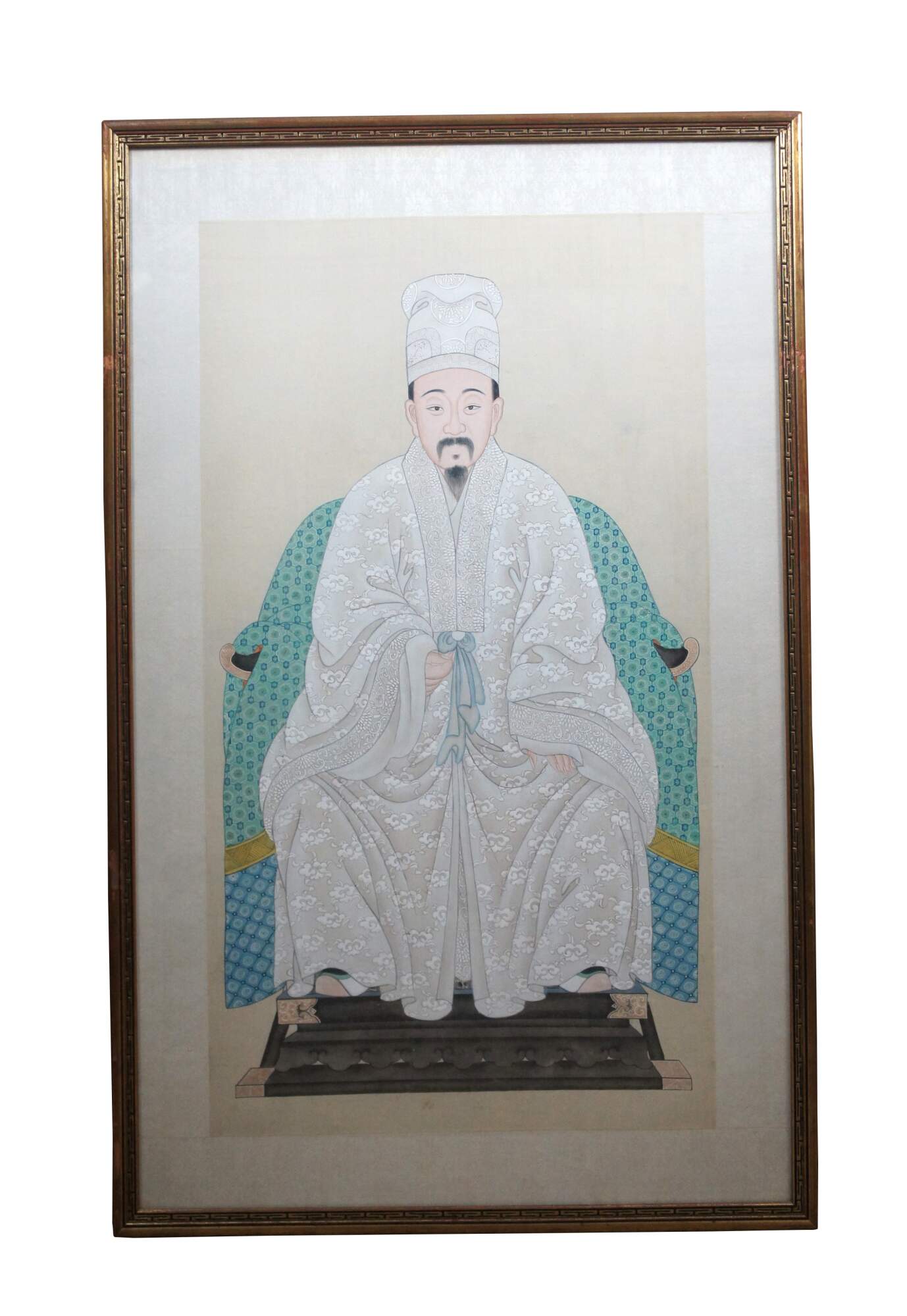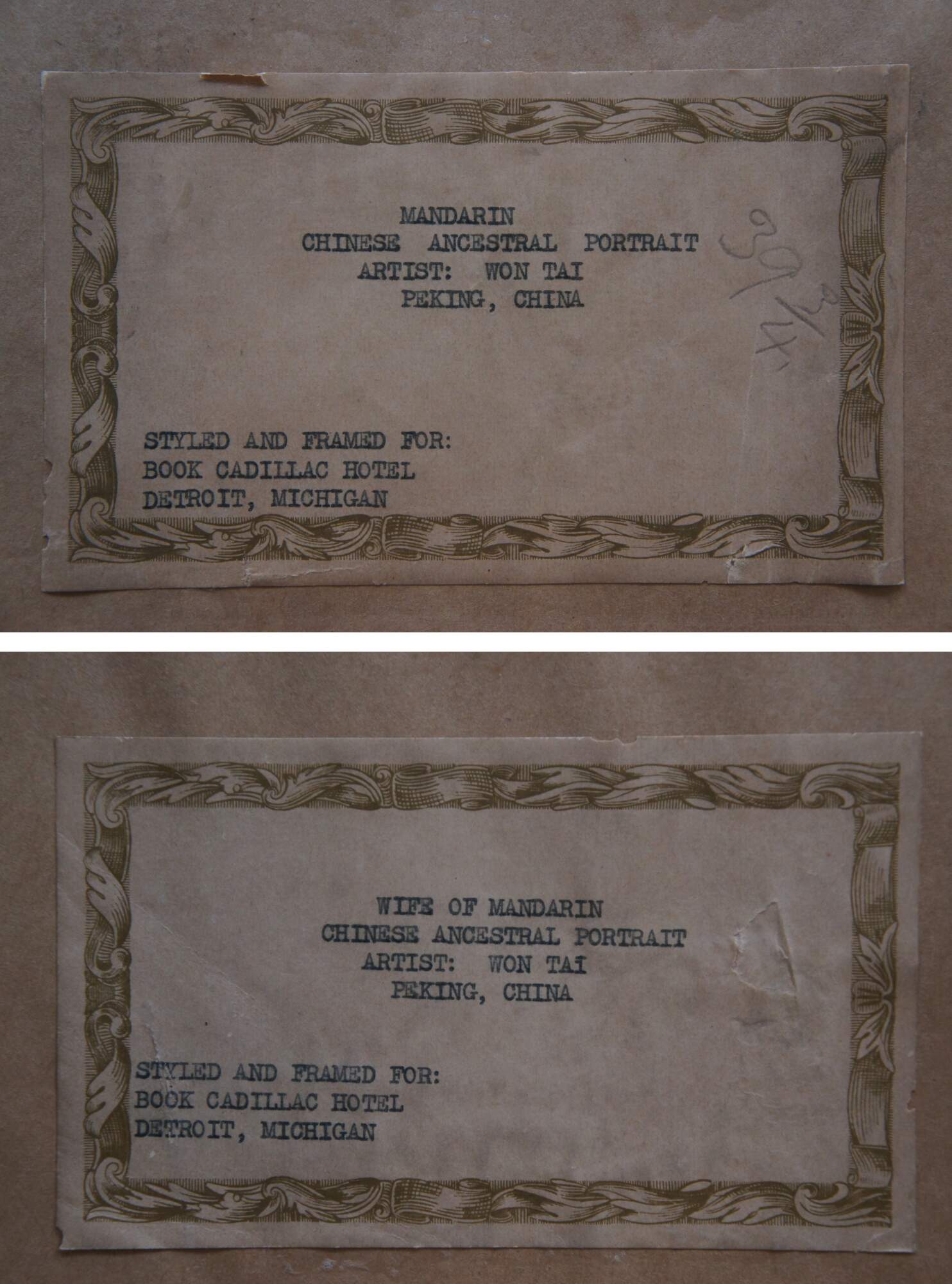 Vintage Chinese chinoisesrie ancestral portraits by artist Won Tai of Peking, China. Shows a pair of male and female figures seated on throne chairs draped in turquoise silks, dressed in matching white robes and head dresses. Titled "Mandarin" and "Wife of Mandarin.". Styled and framed for the Book Cadillac Hotel of Detroit, MI. Giltwood frame with geometric carved detail; white silk mat.