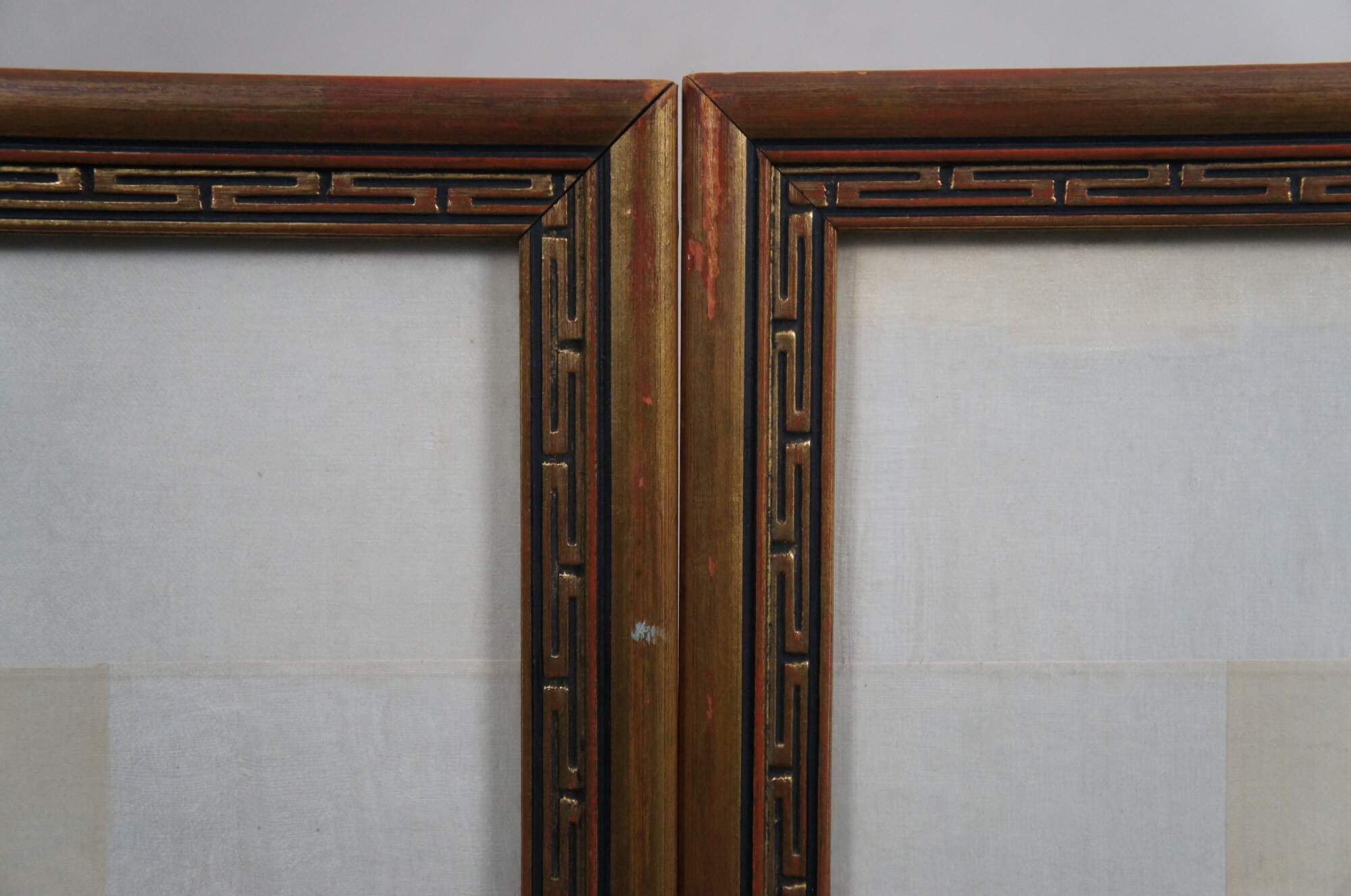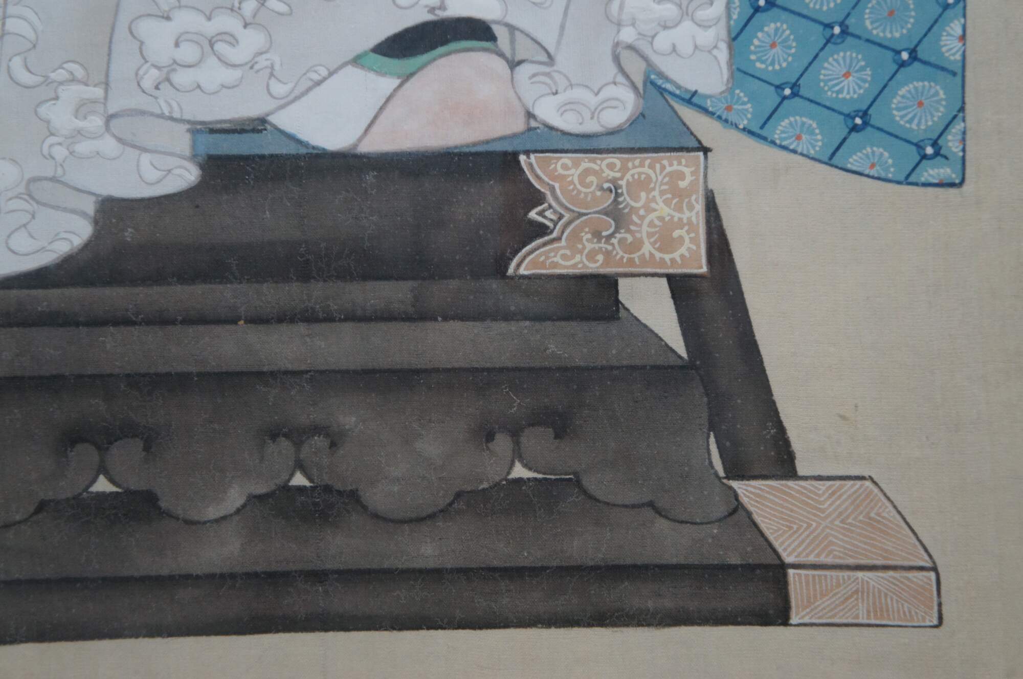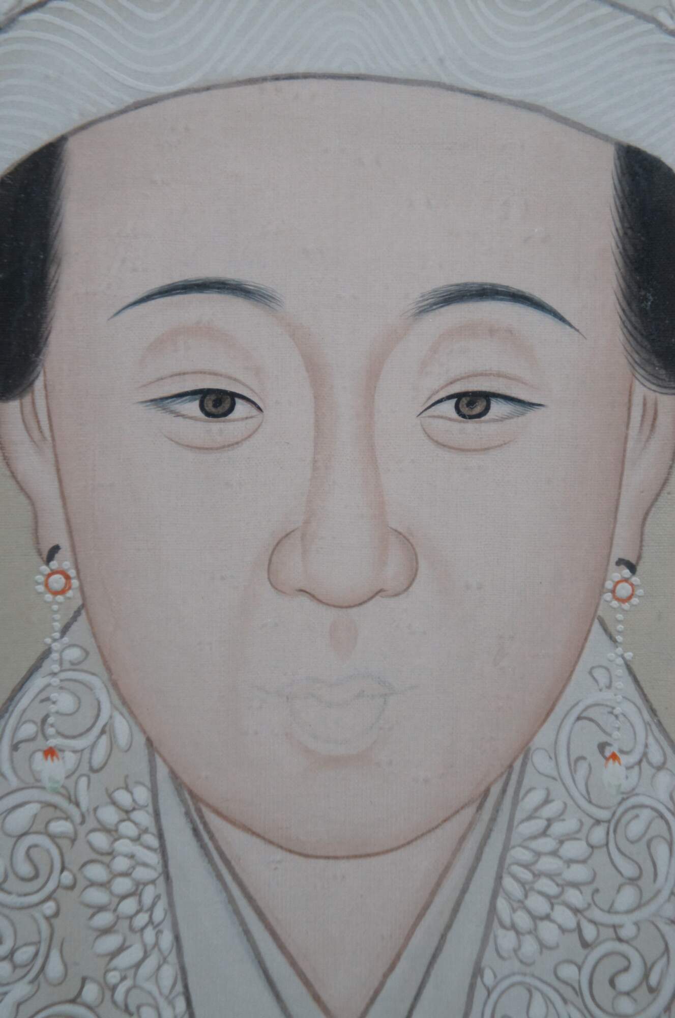 Vintage Chinese chinoisesrie ancestral portraits by artist Won Tai of Peking, China. Shows a pair of male and female figures seated on throne chairs draped in turquoise silks, dressed in matching white robes and head dresses. Titled "Mandarin" and "Wife of Mandarin.". Styled and framed for the Book Cadillac Hotel of Detroit, MI. Giltwood frame with geometric carved detail; white silk mat.