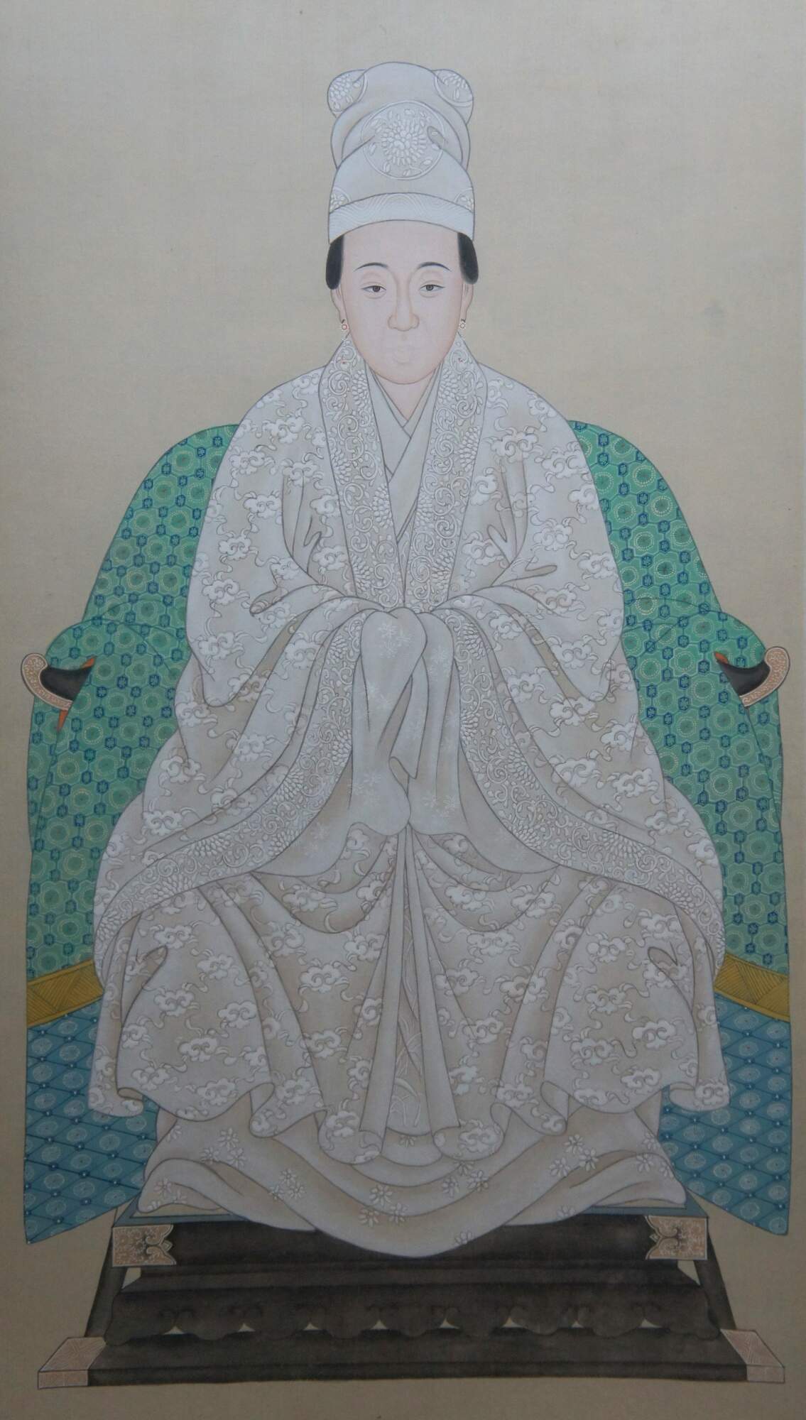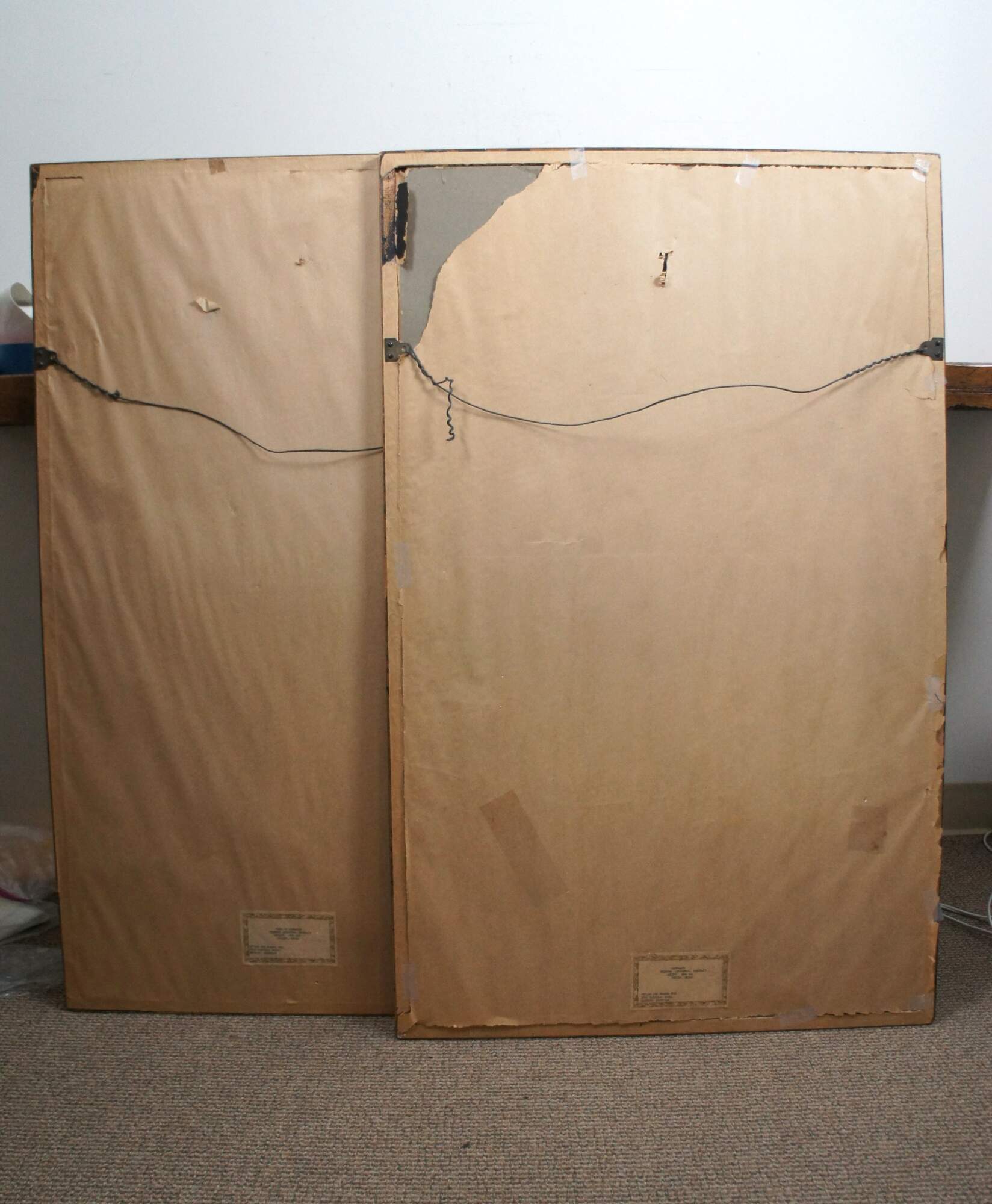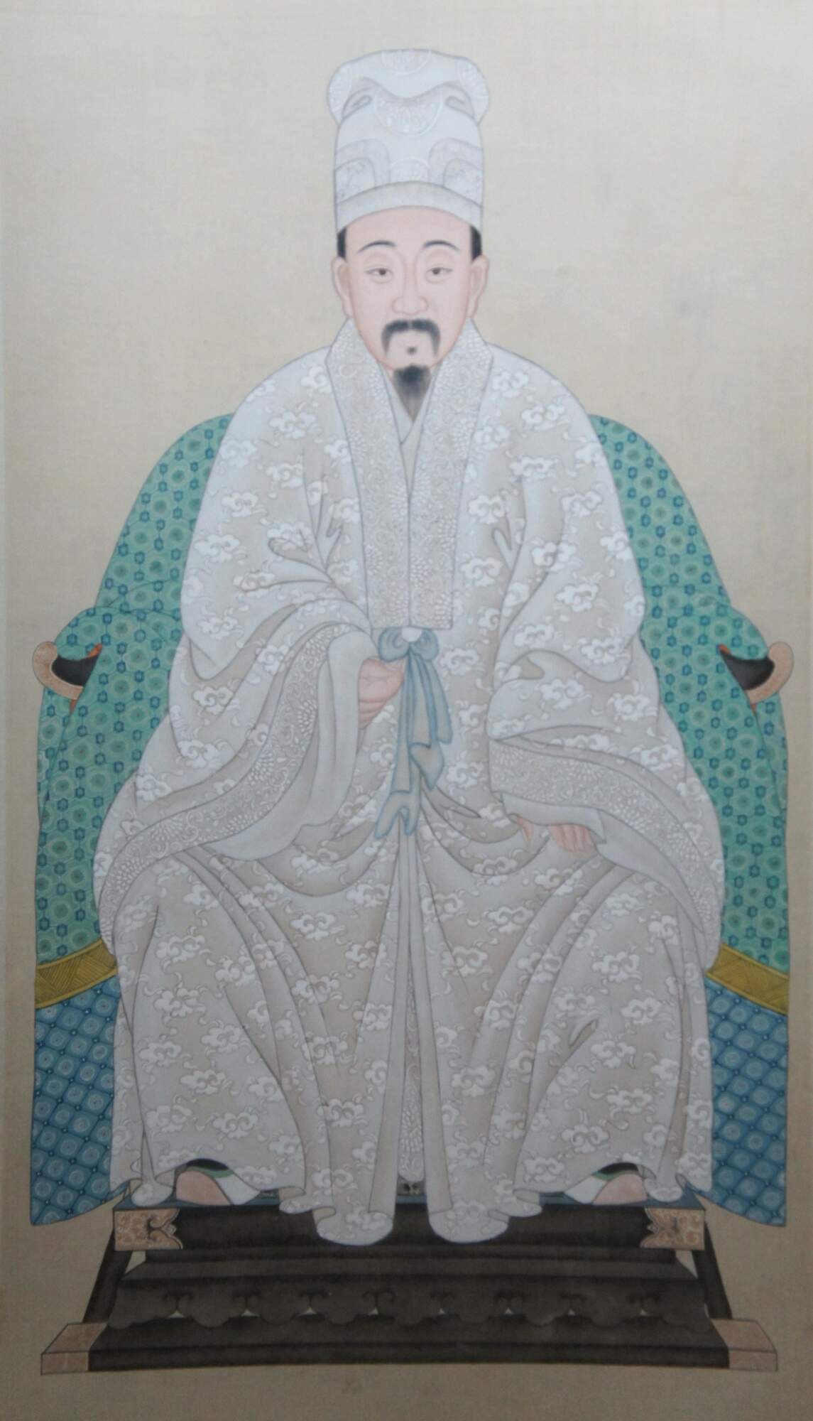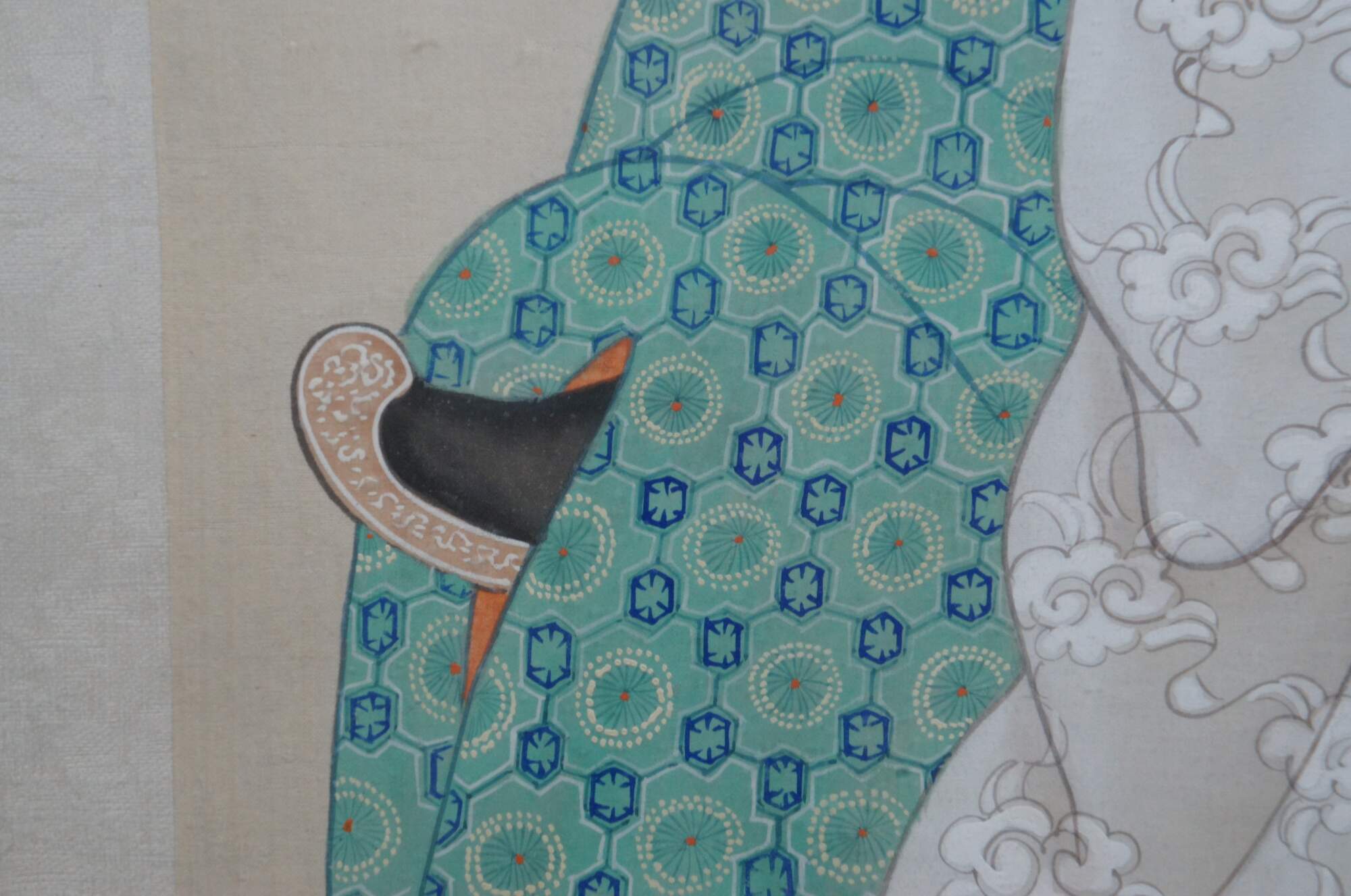 Vintage Chinese chinoisesrie ancestral portraits by artist Won Tai of Peking, China. Shows a pair of male and female figures seated on throne chairs draped in turquoise silks, dressed in matching white robes and head dresses. Titled "Mandarin" and "Wife of Mandarin.". Styled and framed for the Book Cadillac Hotel of Detroit, MI. Giltwood frame with geometric carved detail; white silk mat.