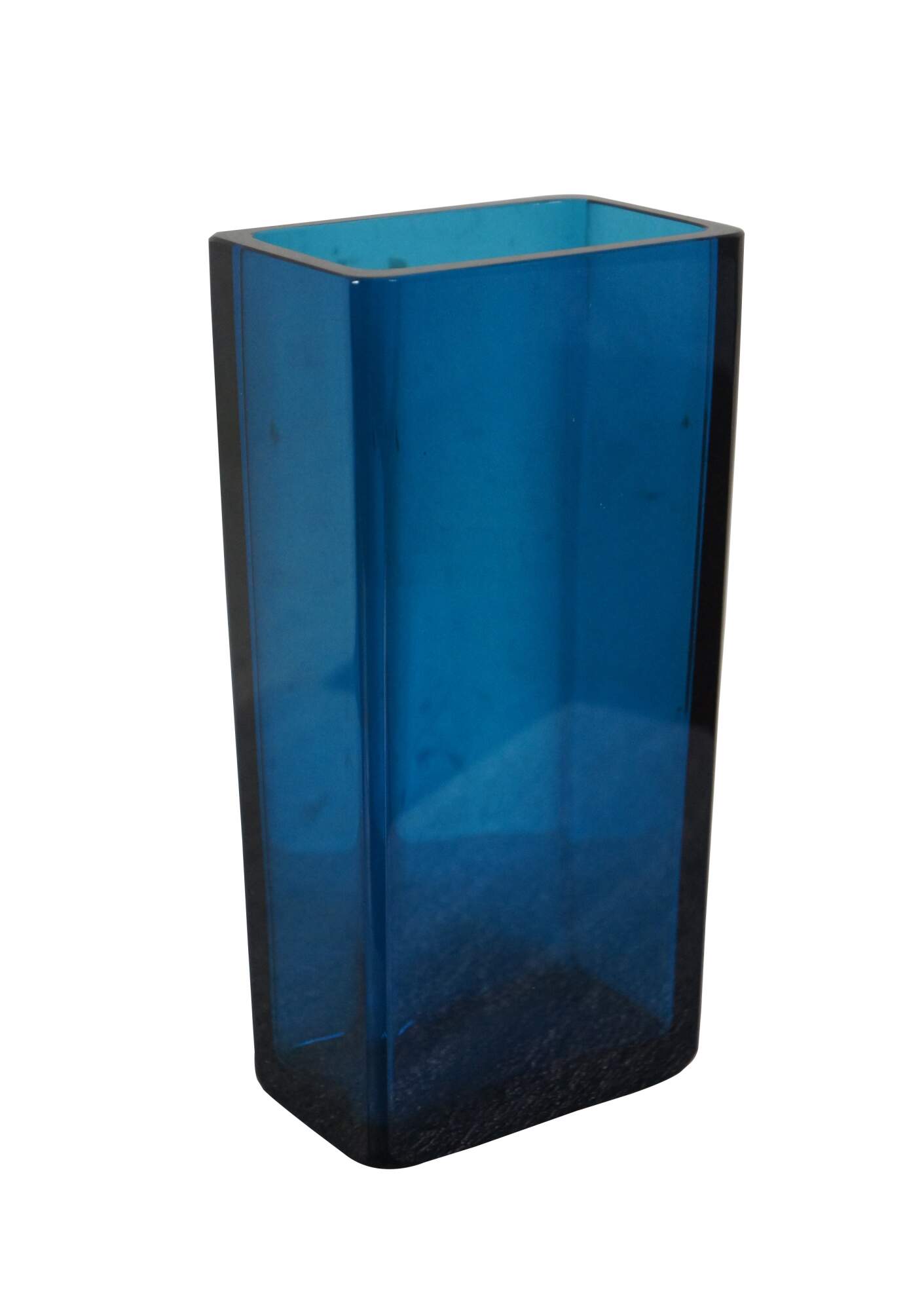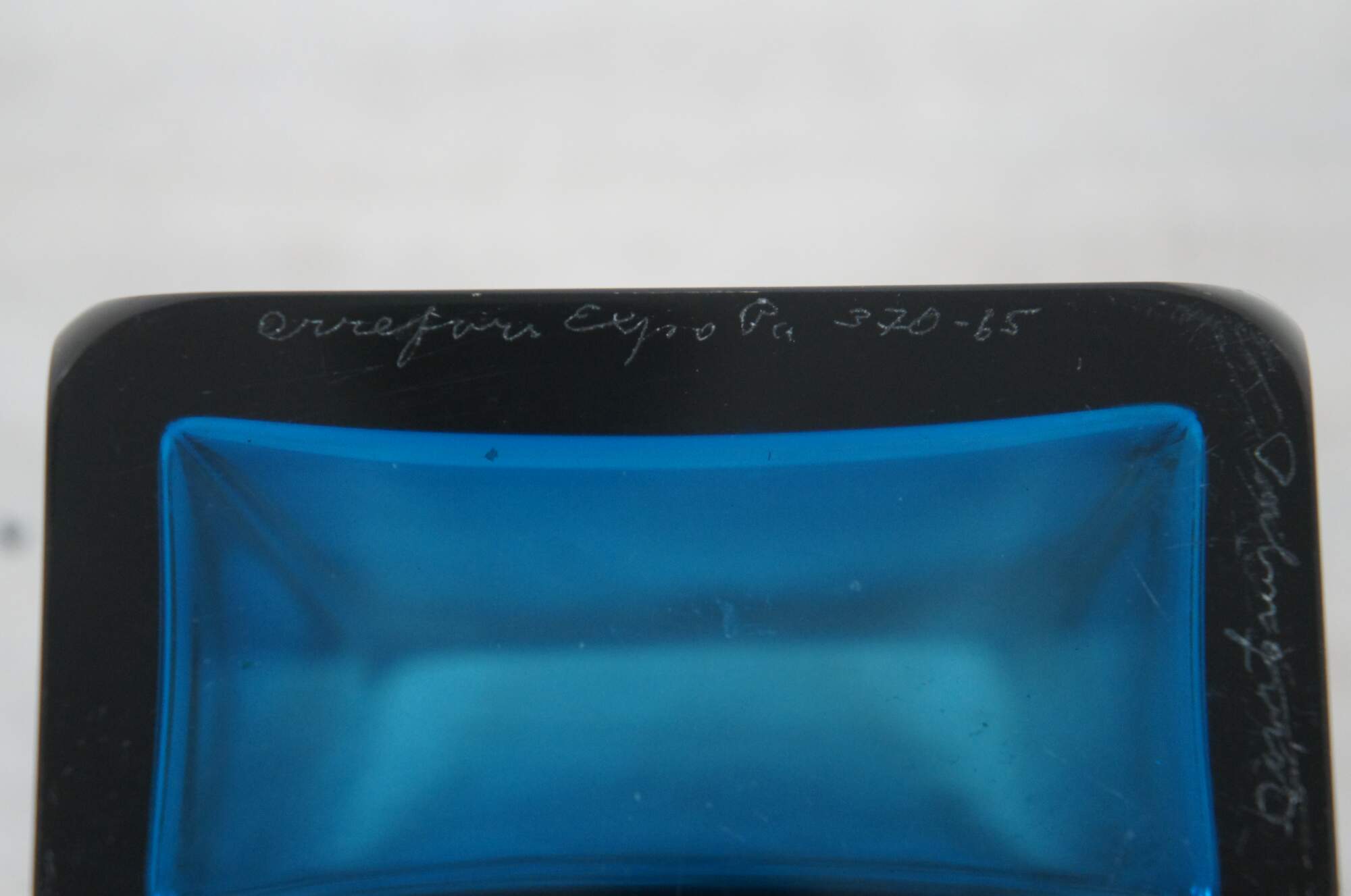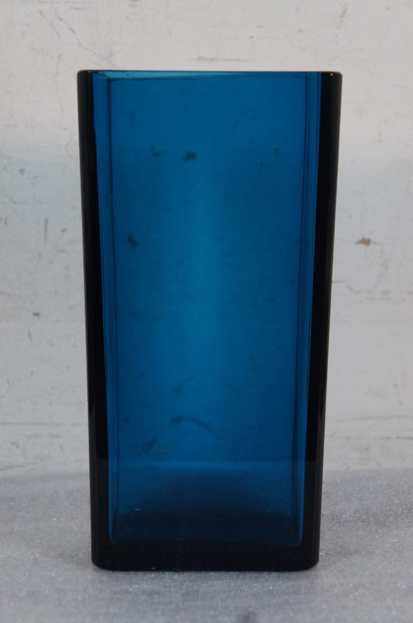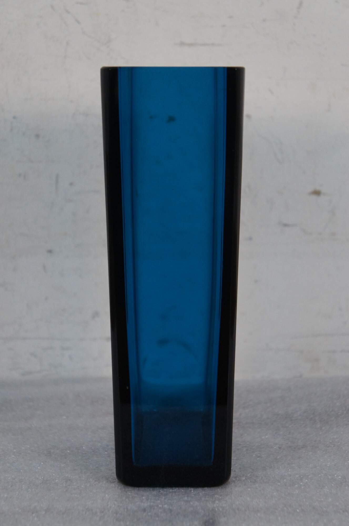 Rare mid century Sven Palmqvist for Orrefors Swedish cobalt blue rectangular glass bud vase or flower urn. Marked Orrefors Expo Pa 370-65 and signed Palmqvist on base. Circa 1965.