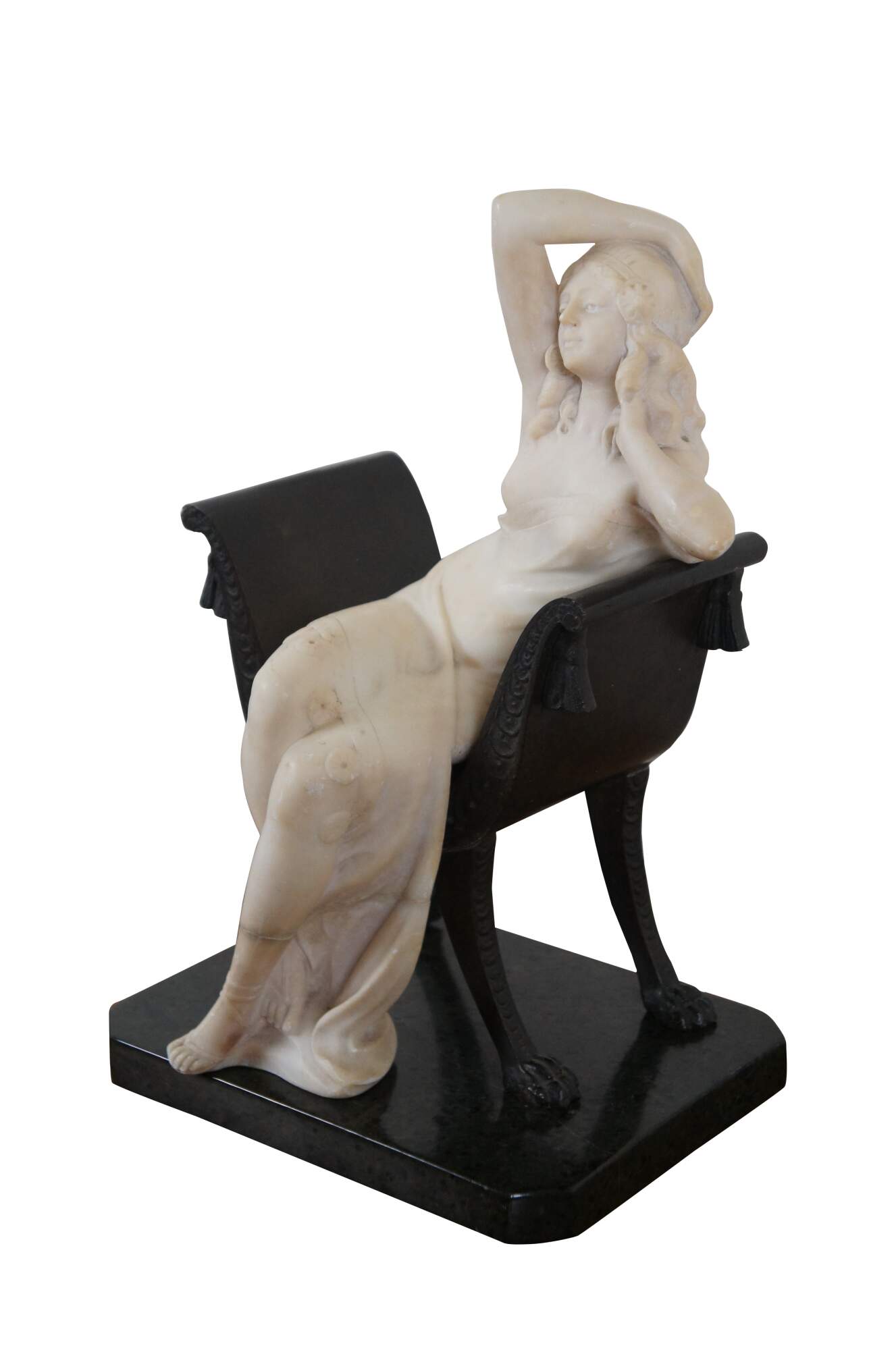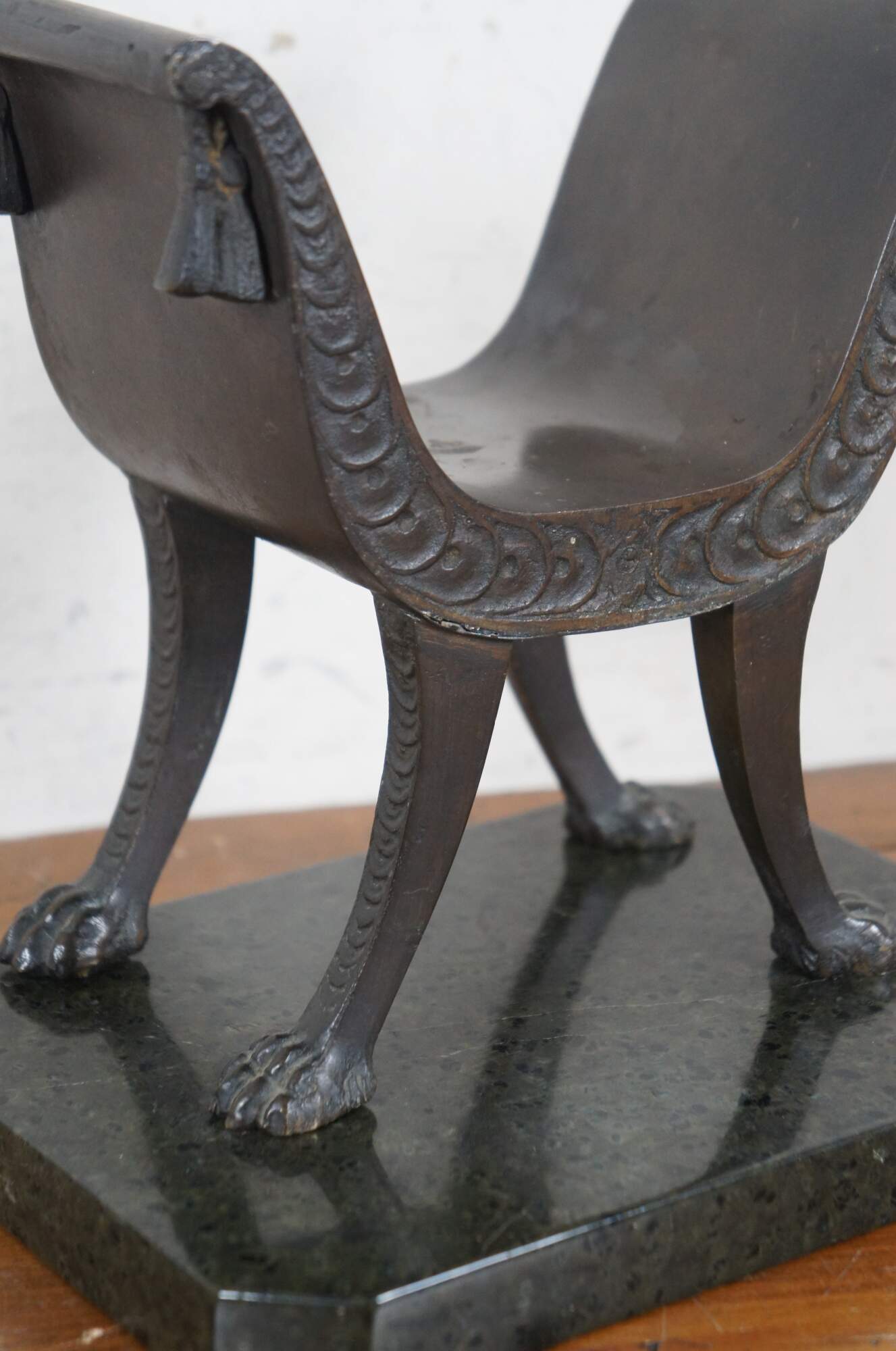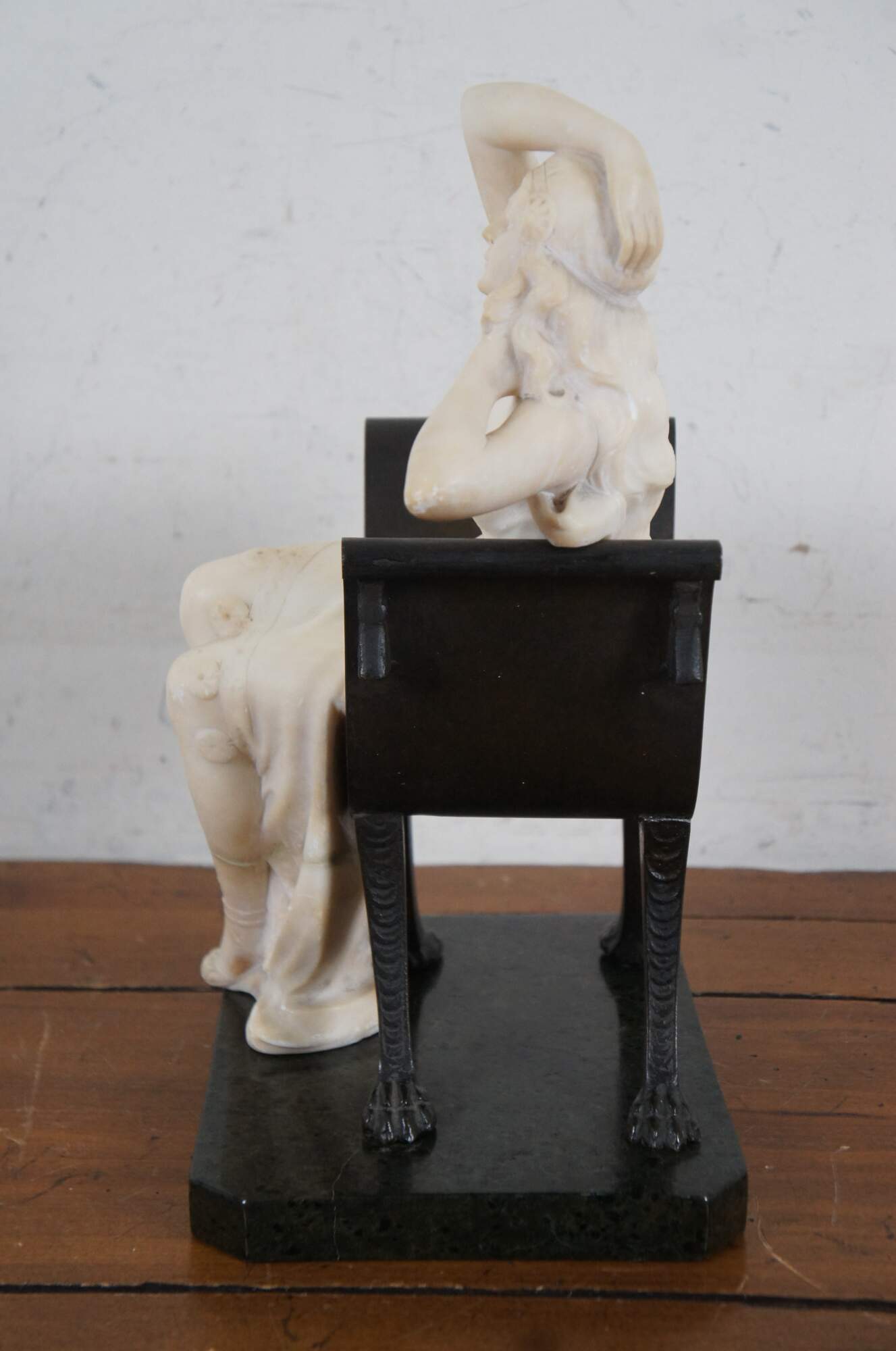 Late 19th - early 20th century carved marble sculpture in the shape of a Neoclassical woman seated in a bronze Savonarola style chair, mounted on a slab of green and black marble. Surface of plith marked Italy. After Antonio Frilli and Emilio Fiaschi.