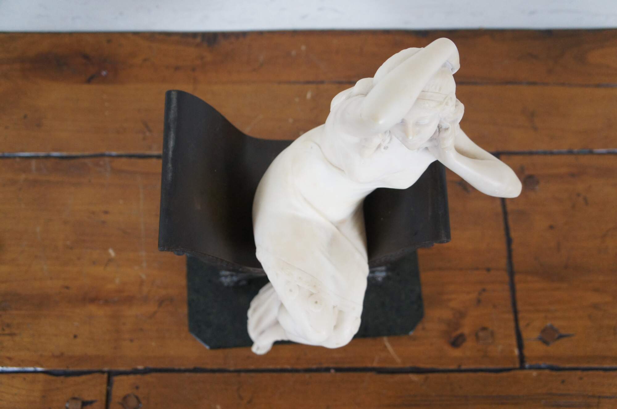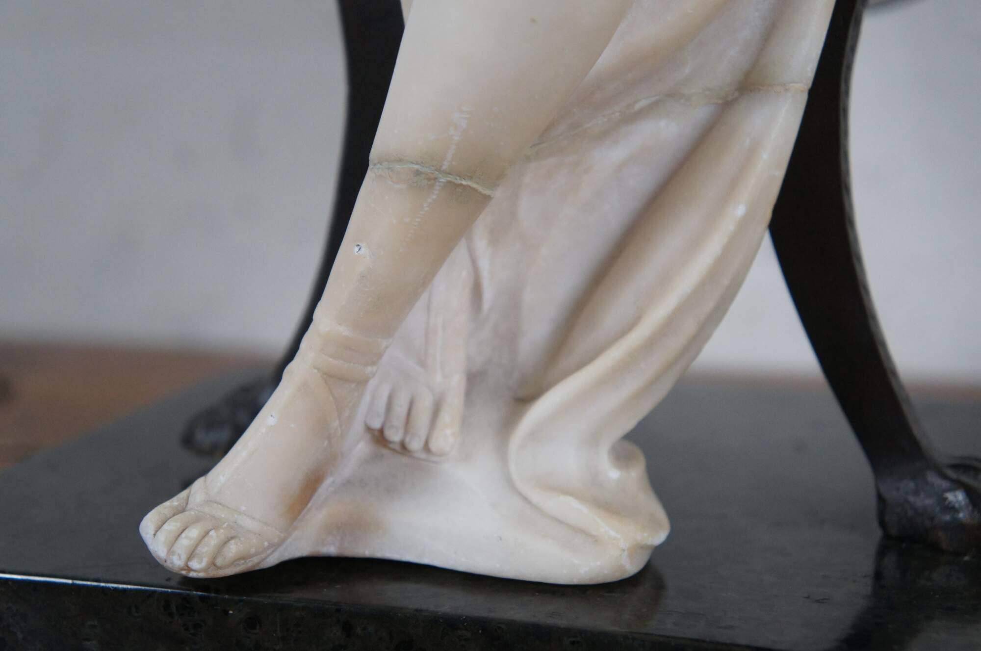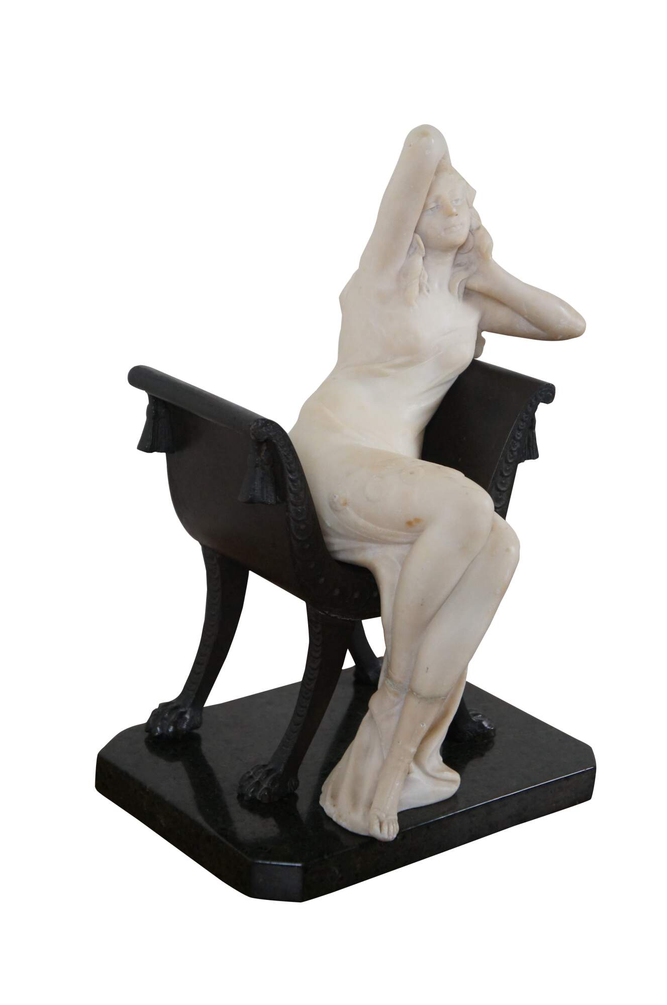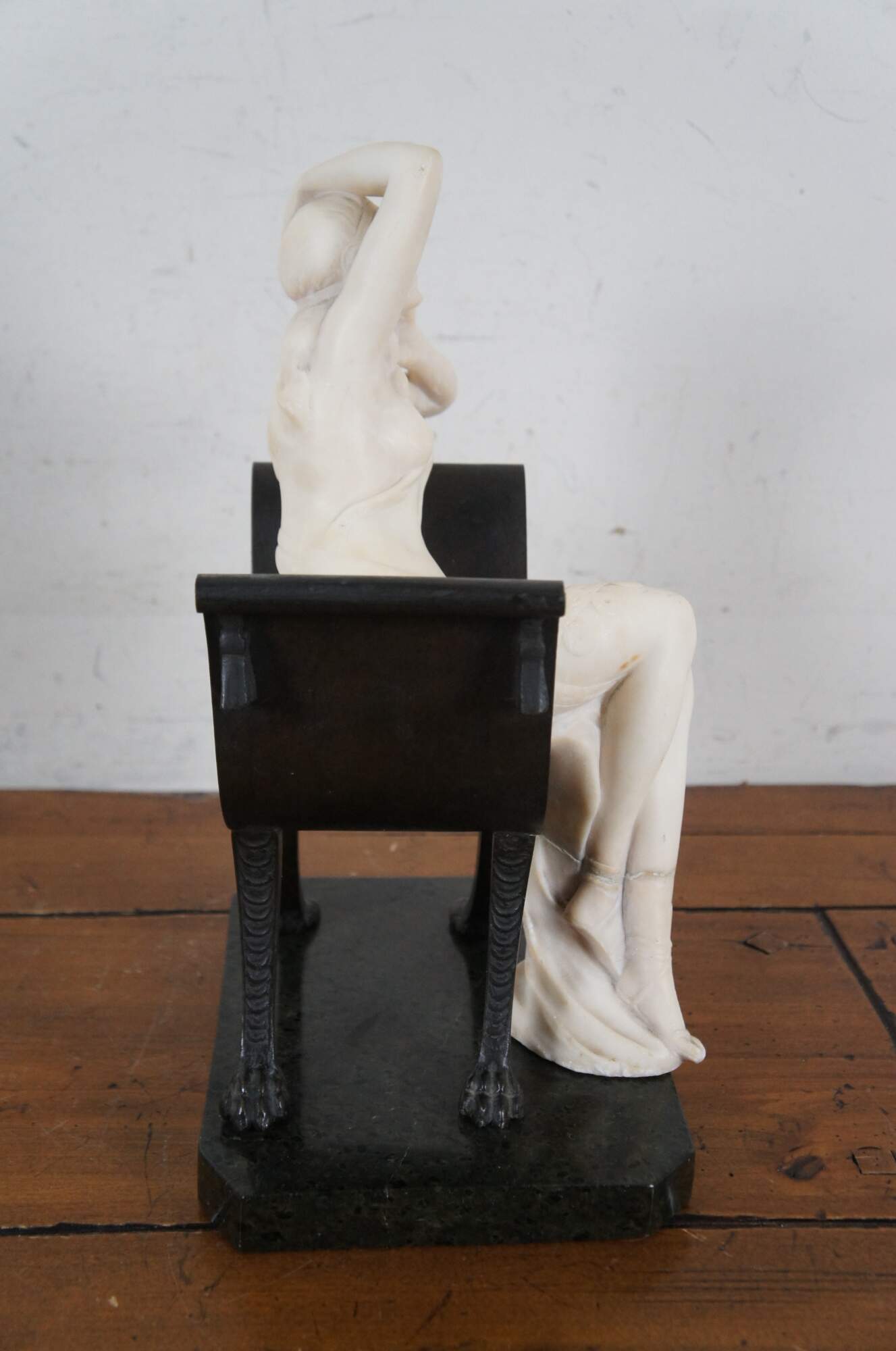 Late 19th - early 20th century carved marble sculpture in the shape of a Neoclassical woman seated in a bronze Savonarola style chair, mounted on a slab of green and black marble. Surface of plith marked Italy. After Antonio Frilli and Emilio Fiaschi.