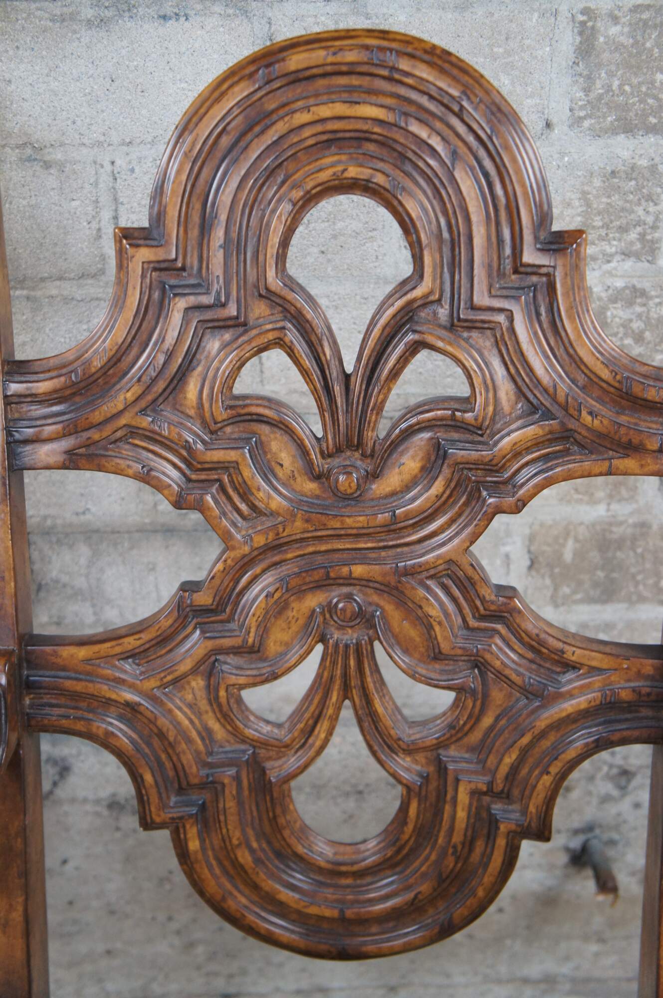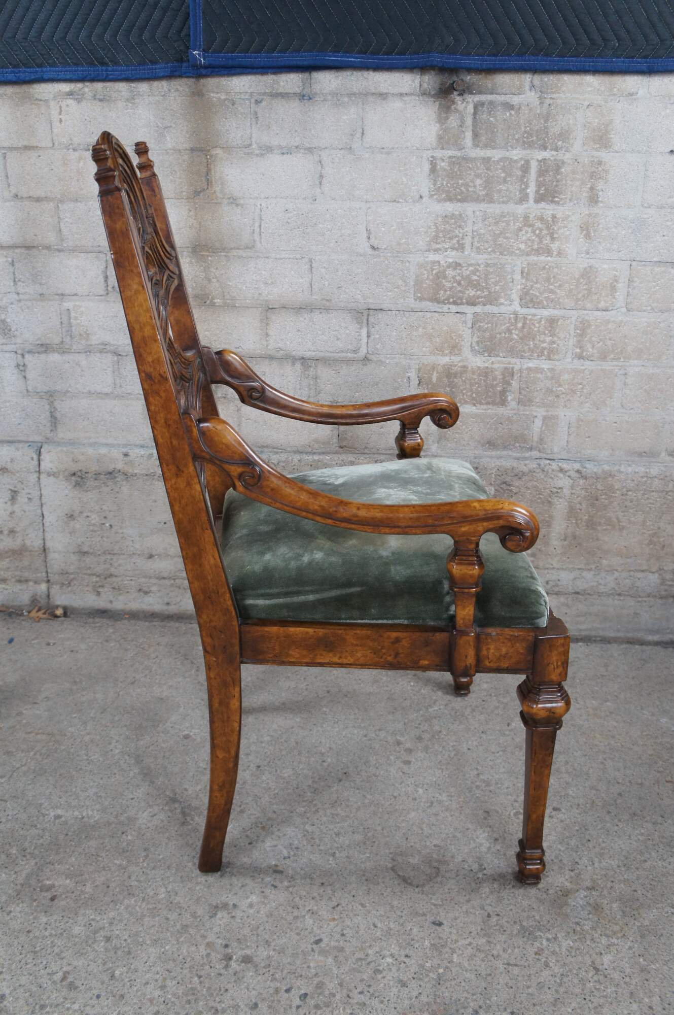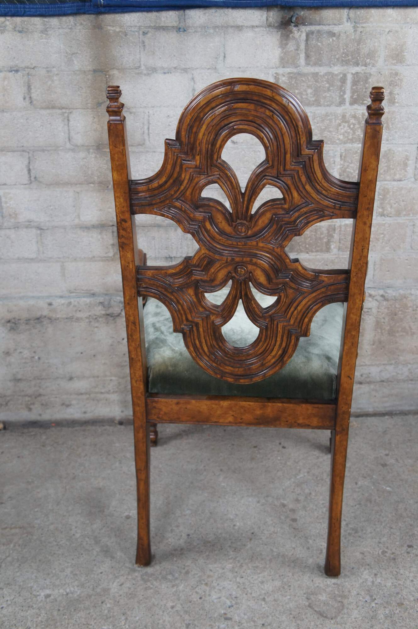 A charming late 20th century arm chair by Theodore Alexander. Features a mahogany framed with interlaced and pierced back over green velvet seat and square tapered legs. Great for use as an occasional piece or office furnishing.