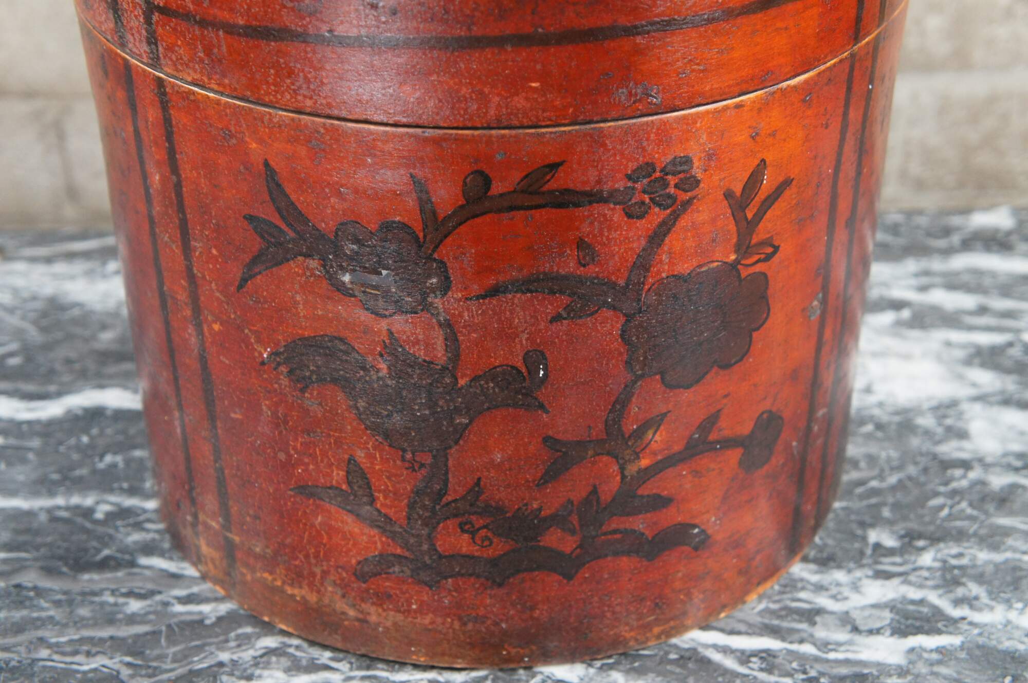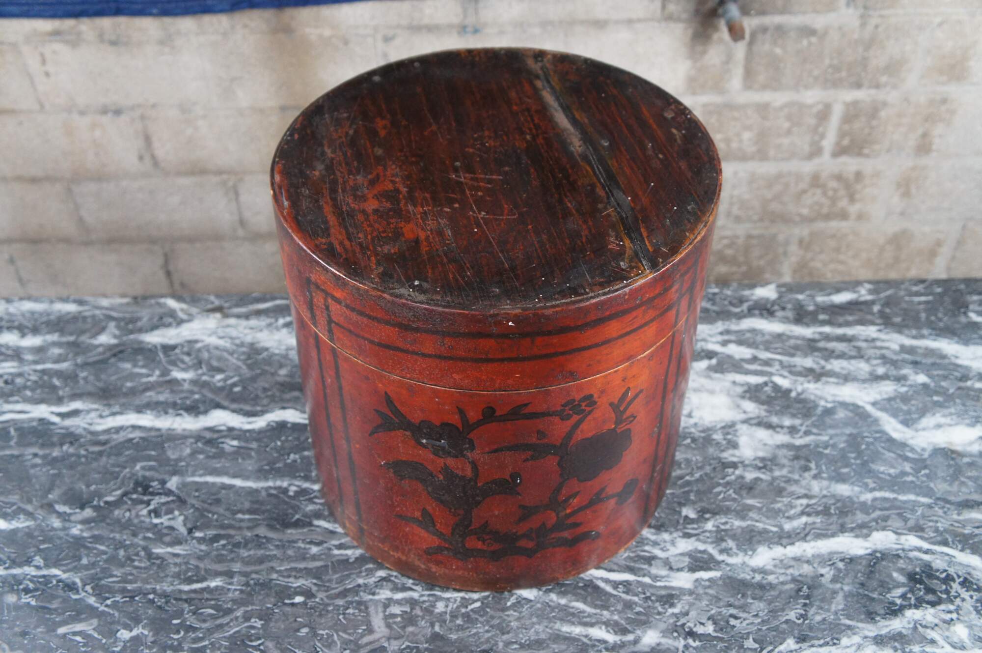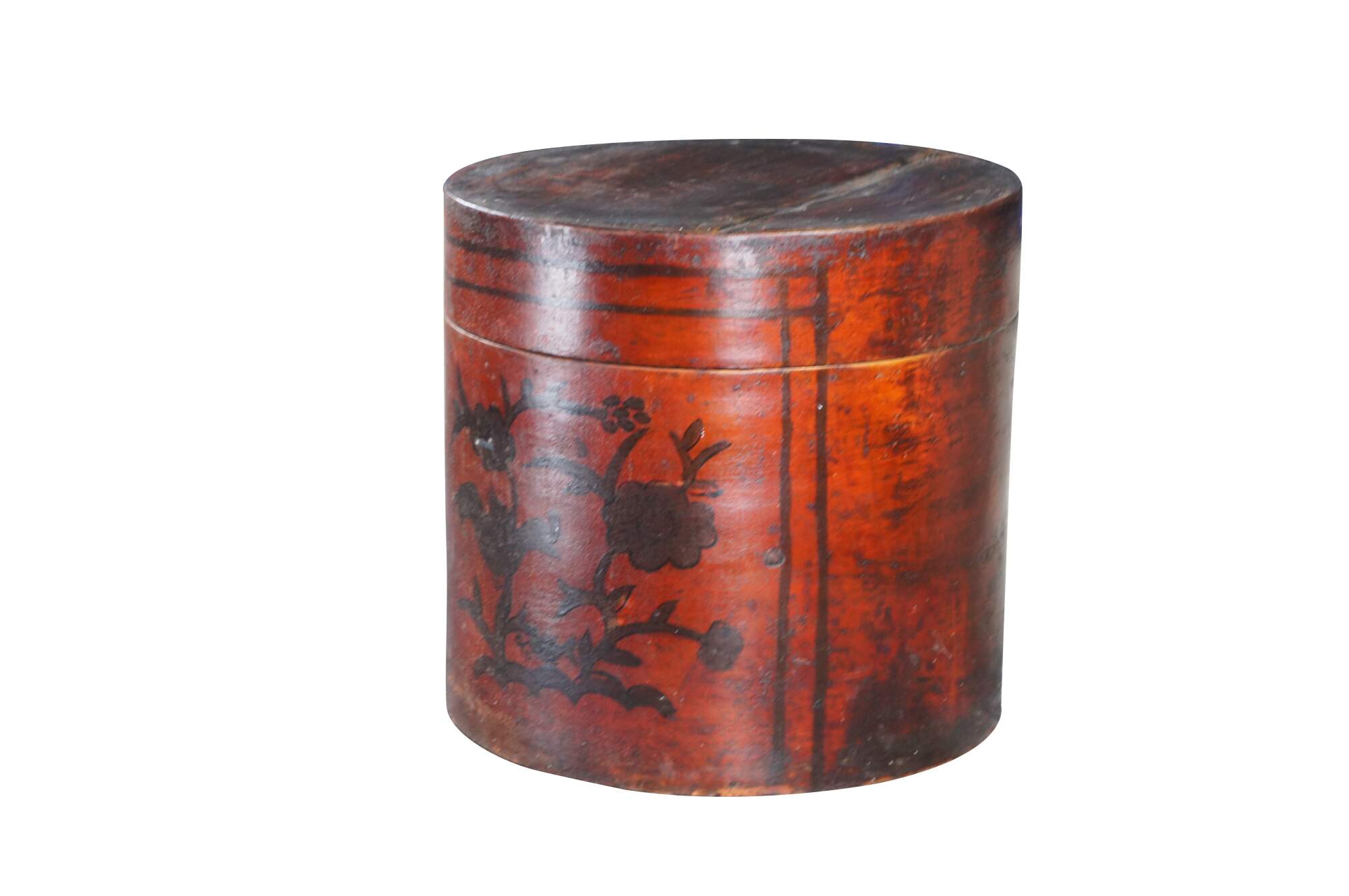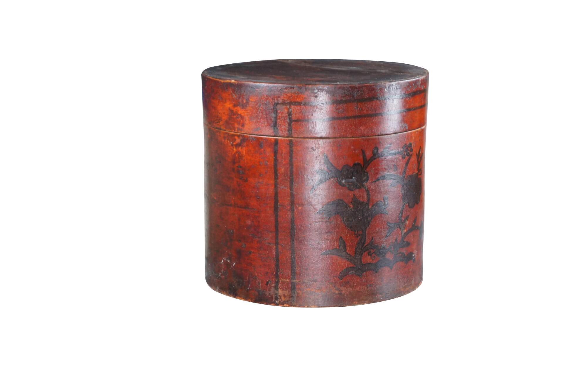 Antique Chinese Shanxi Red Lacquer Poplar Hat / Tea Box. Features a floral decorated design over red lacquer finish.