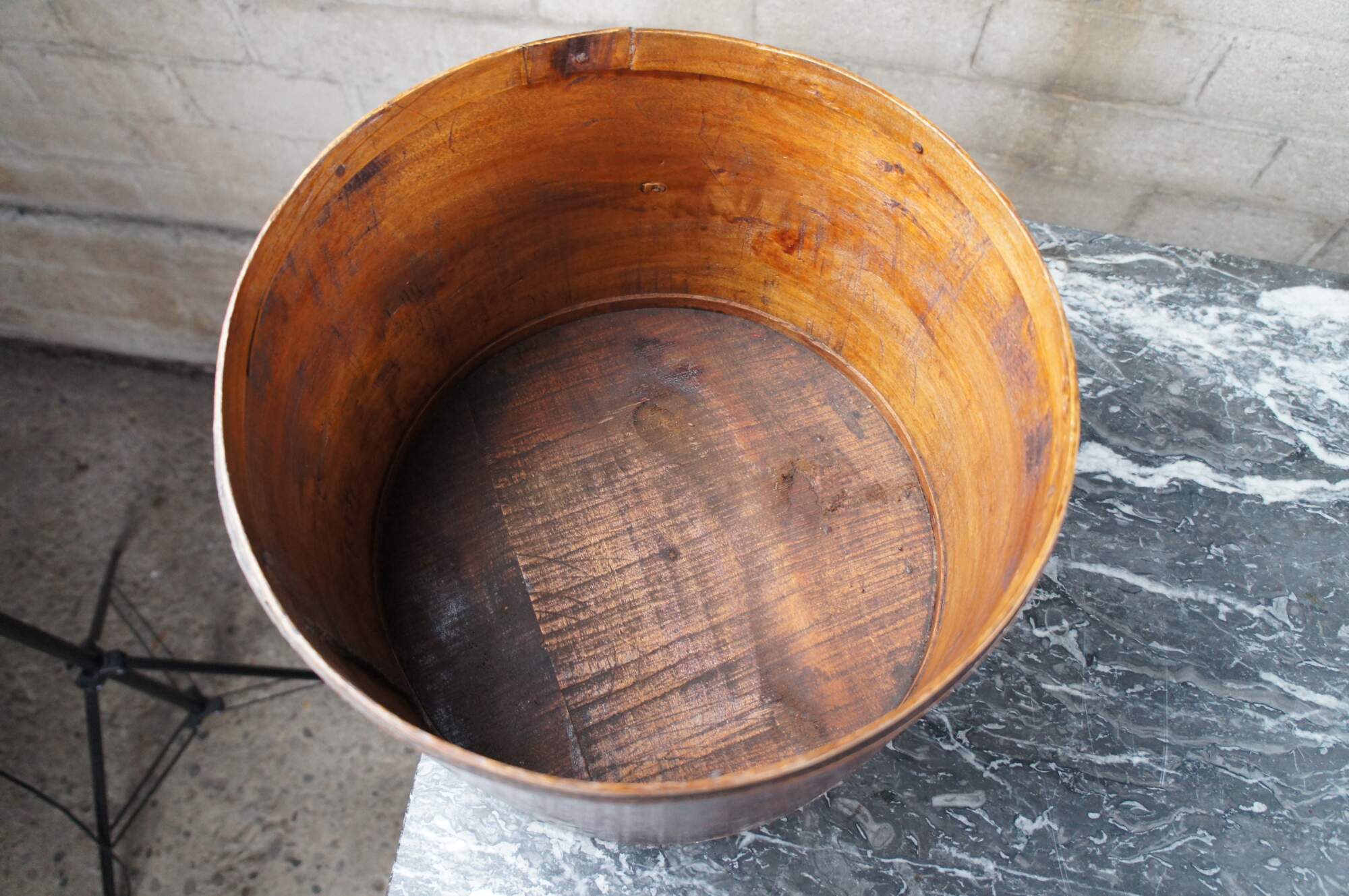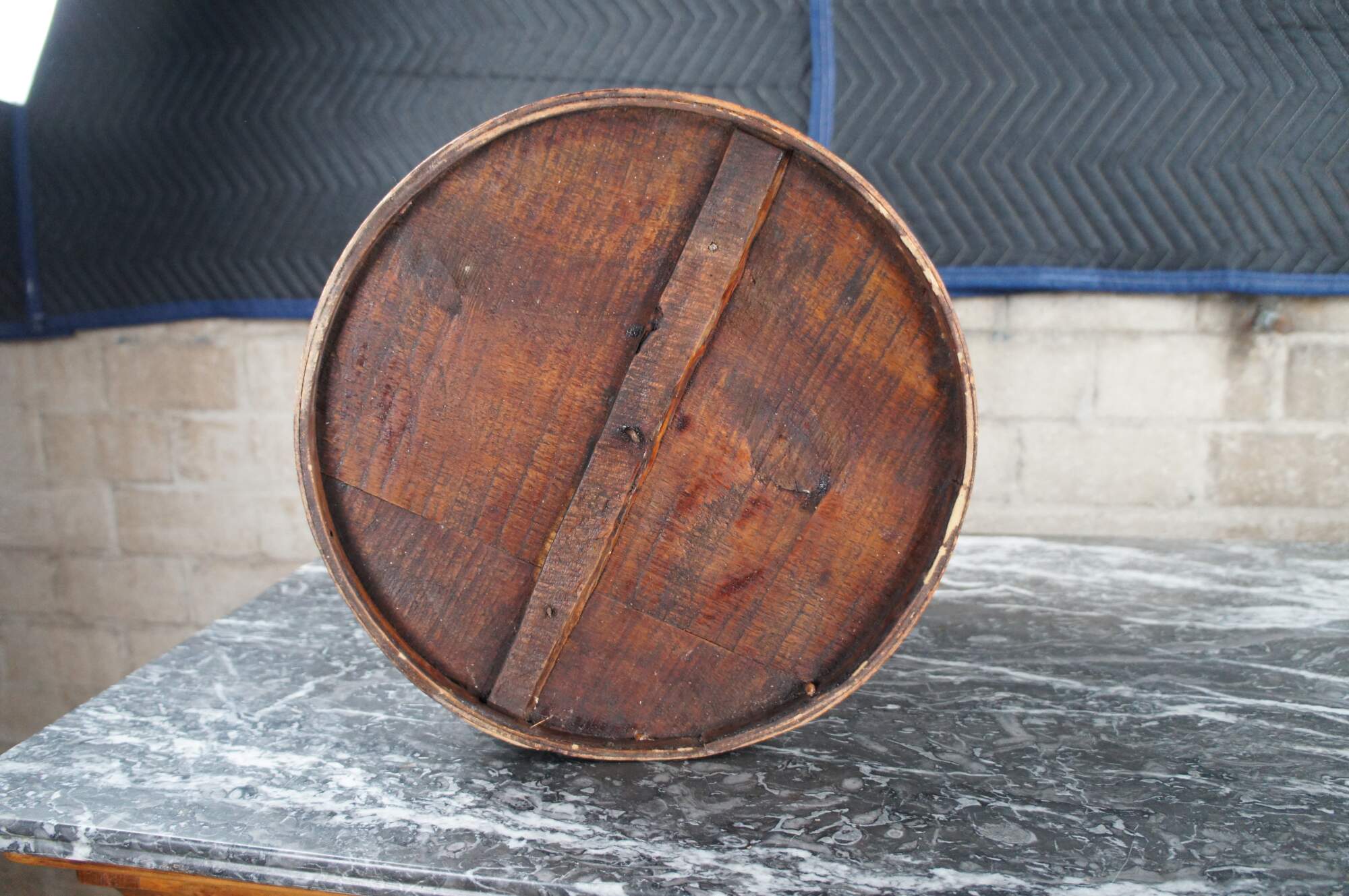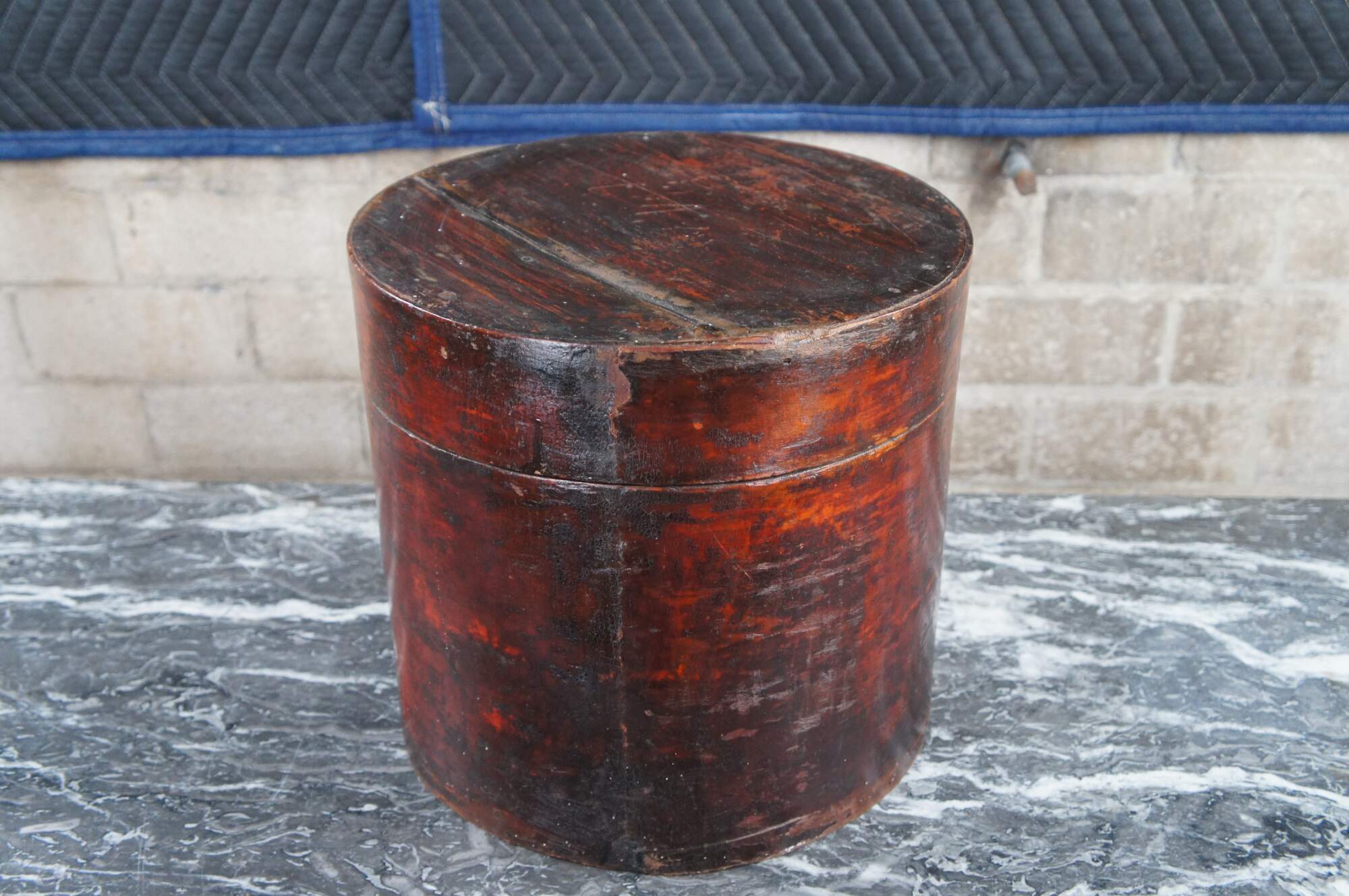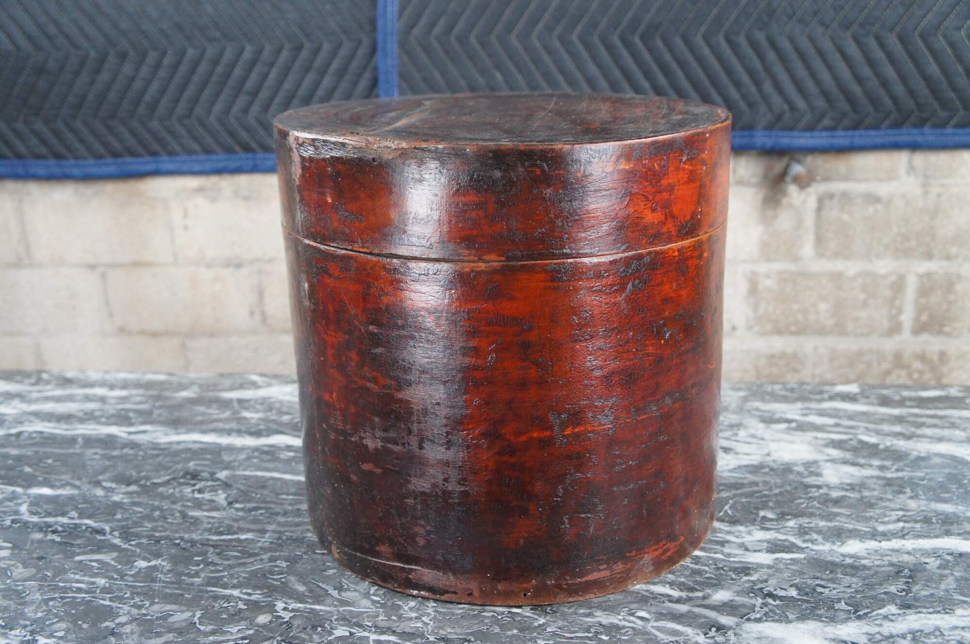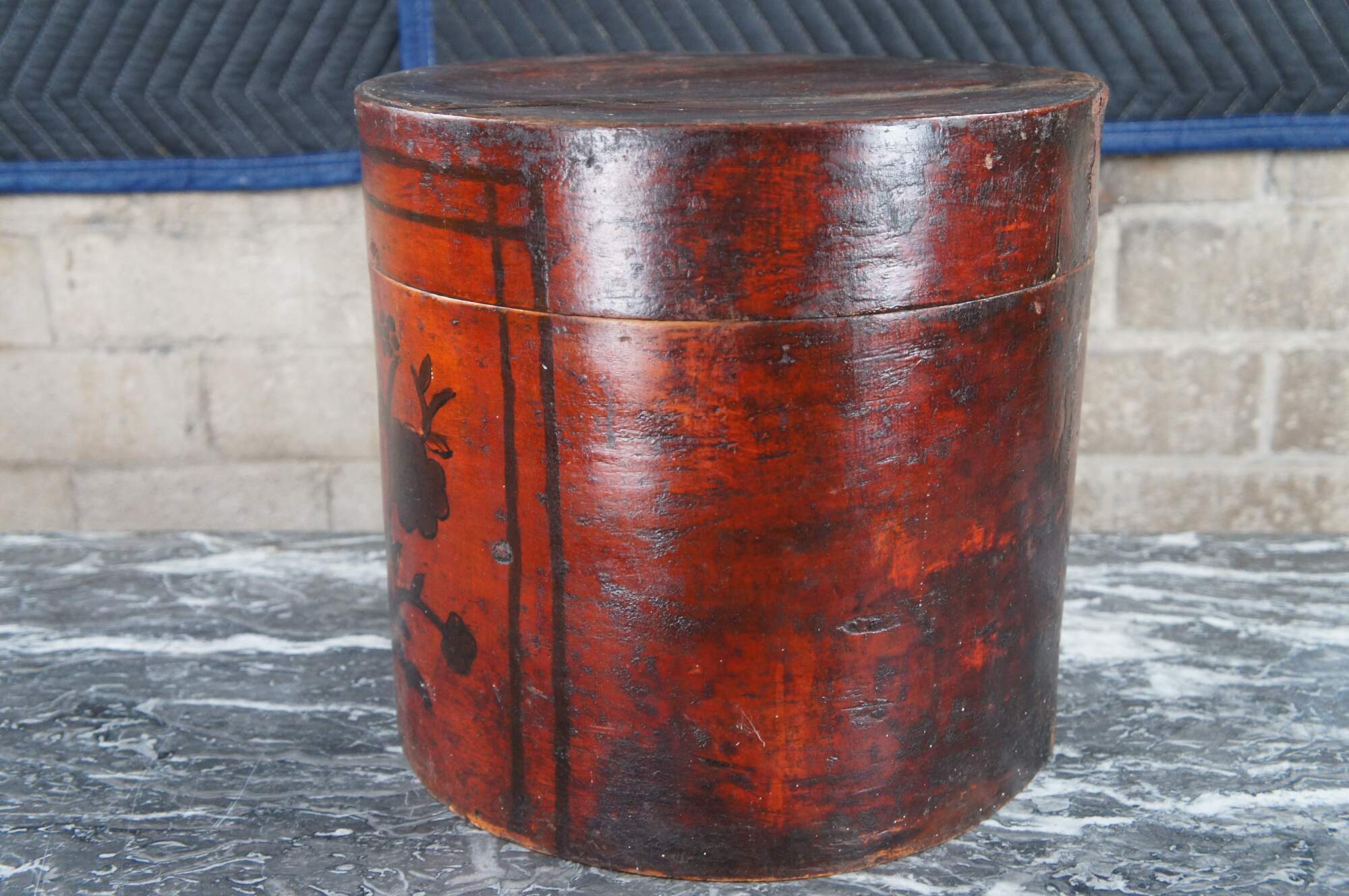 Antique Chinese Shanxi Red Lacquer Poplar Hat / Tea Box. Features a floral decorated design over red lacquer finish.