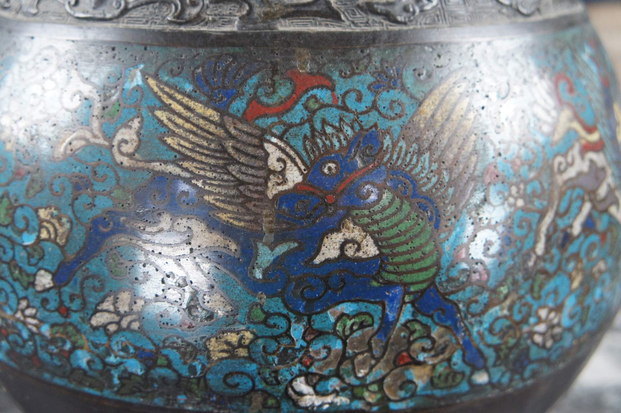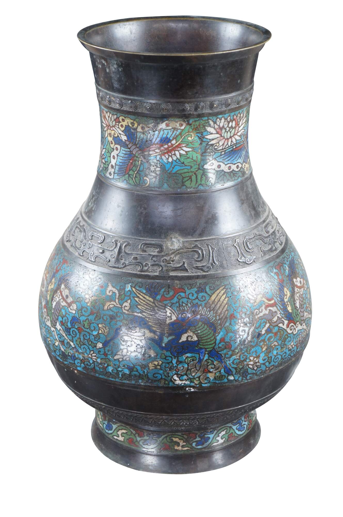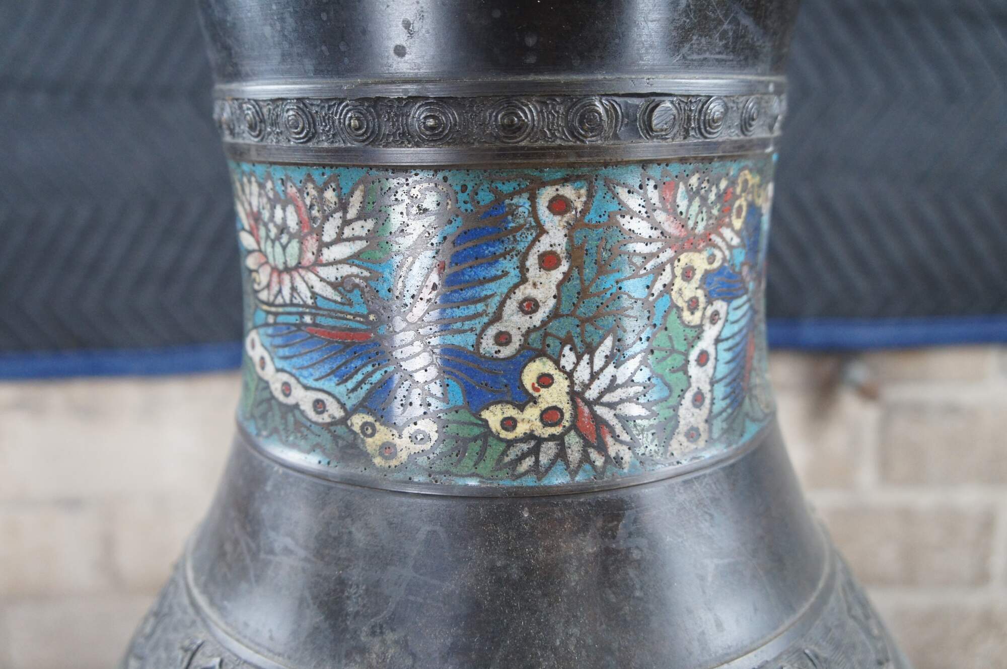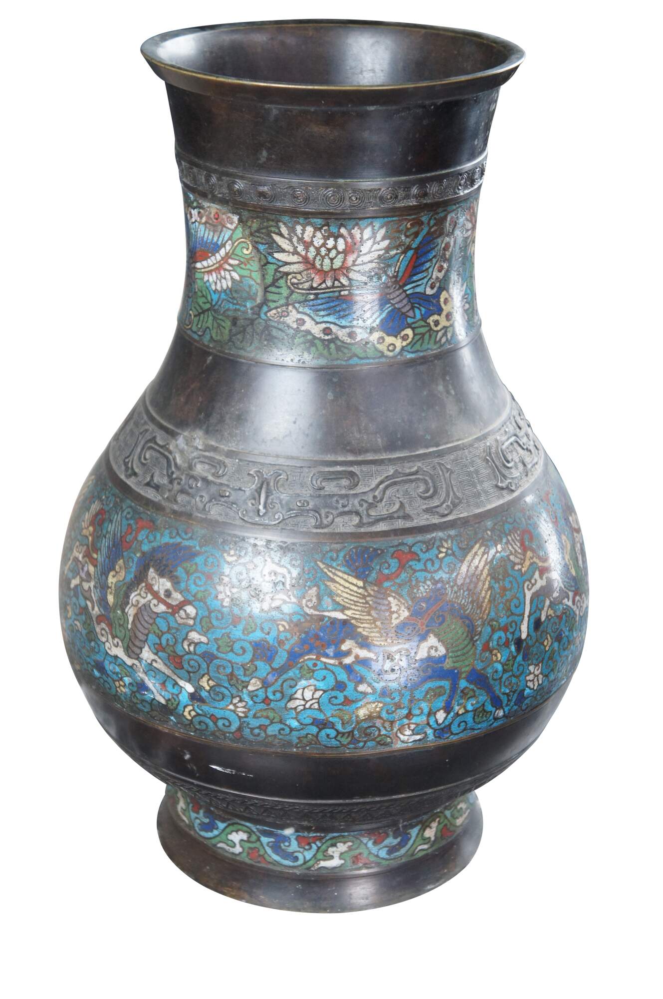 Early 20th century Japanese Bronze Champleve Flower Vase or Urn. Features a colorful champleve design of Pegasus's and butterflies between engraved bronze motifs. Marked Made in Japan on the base.