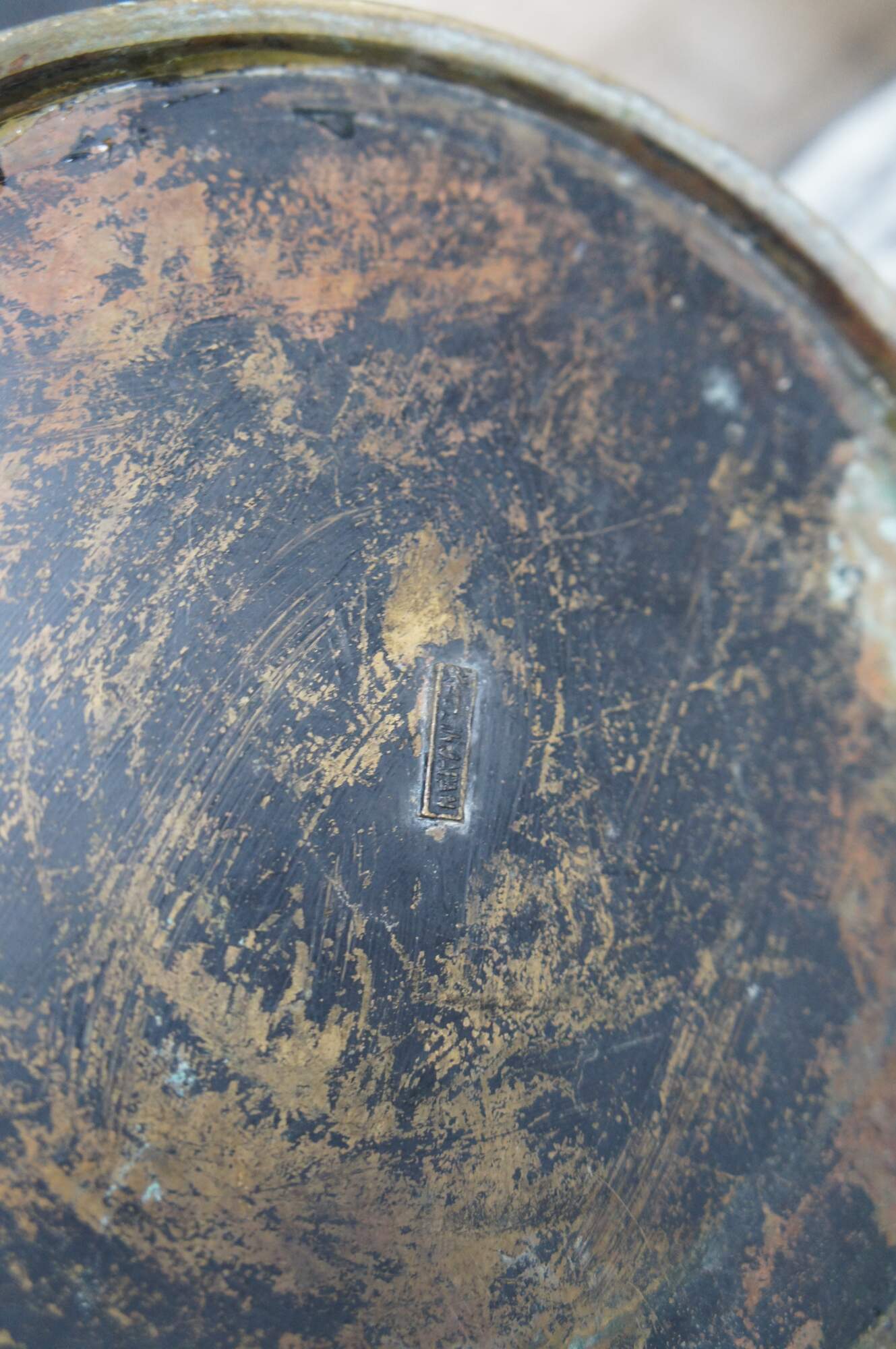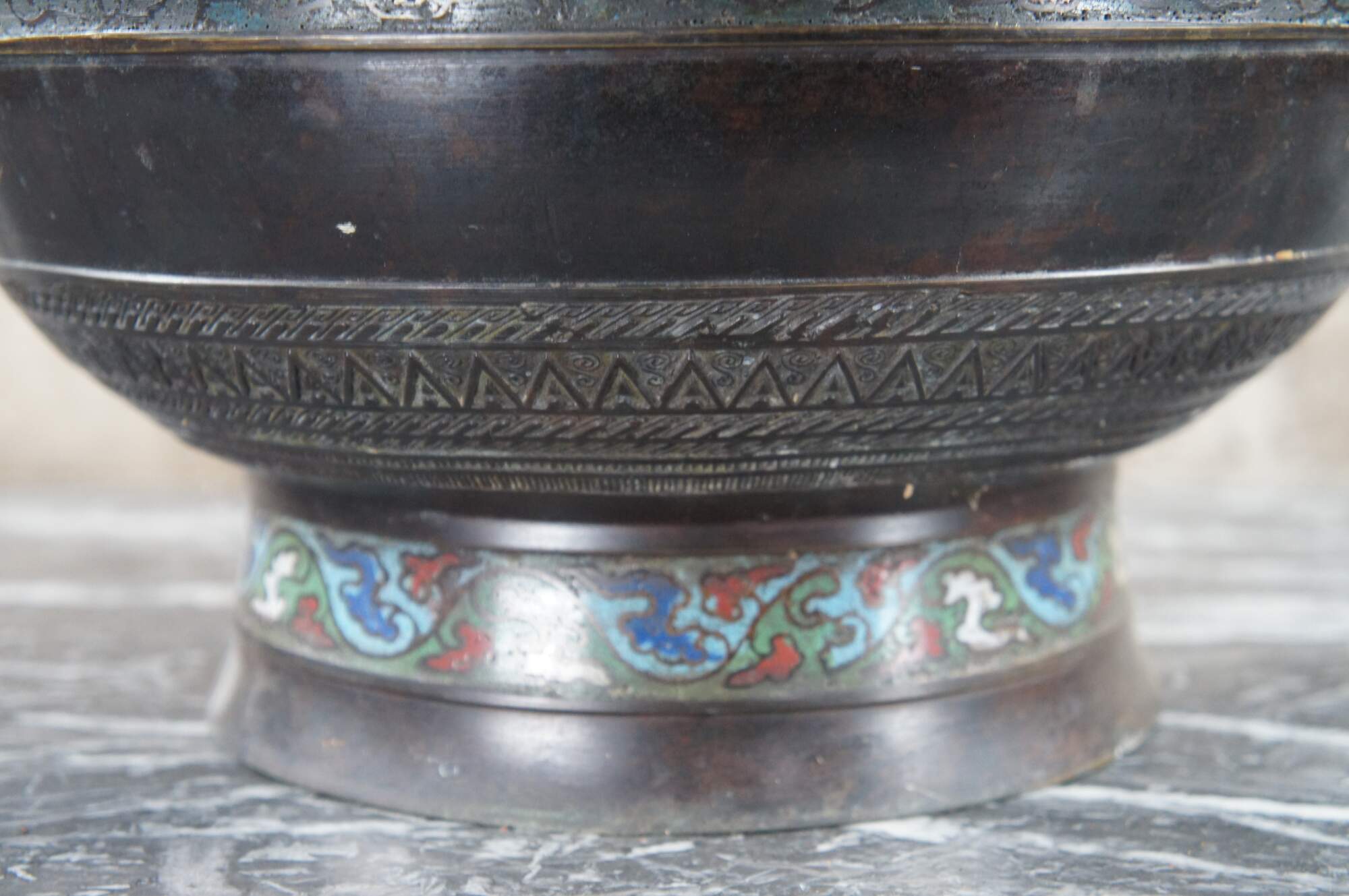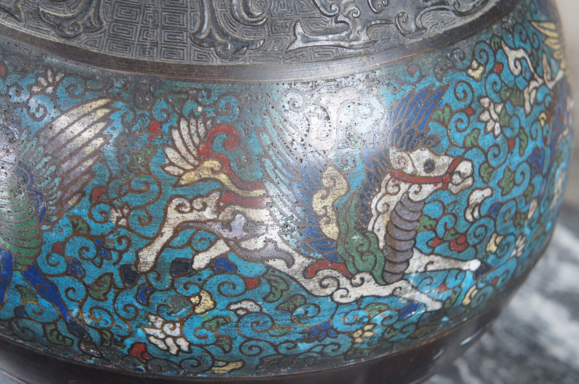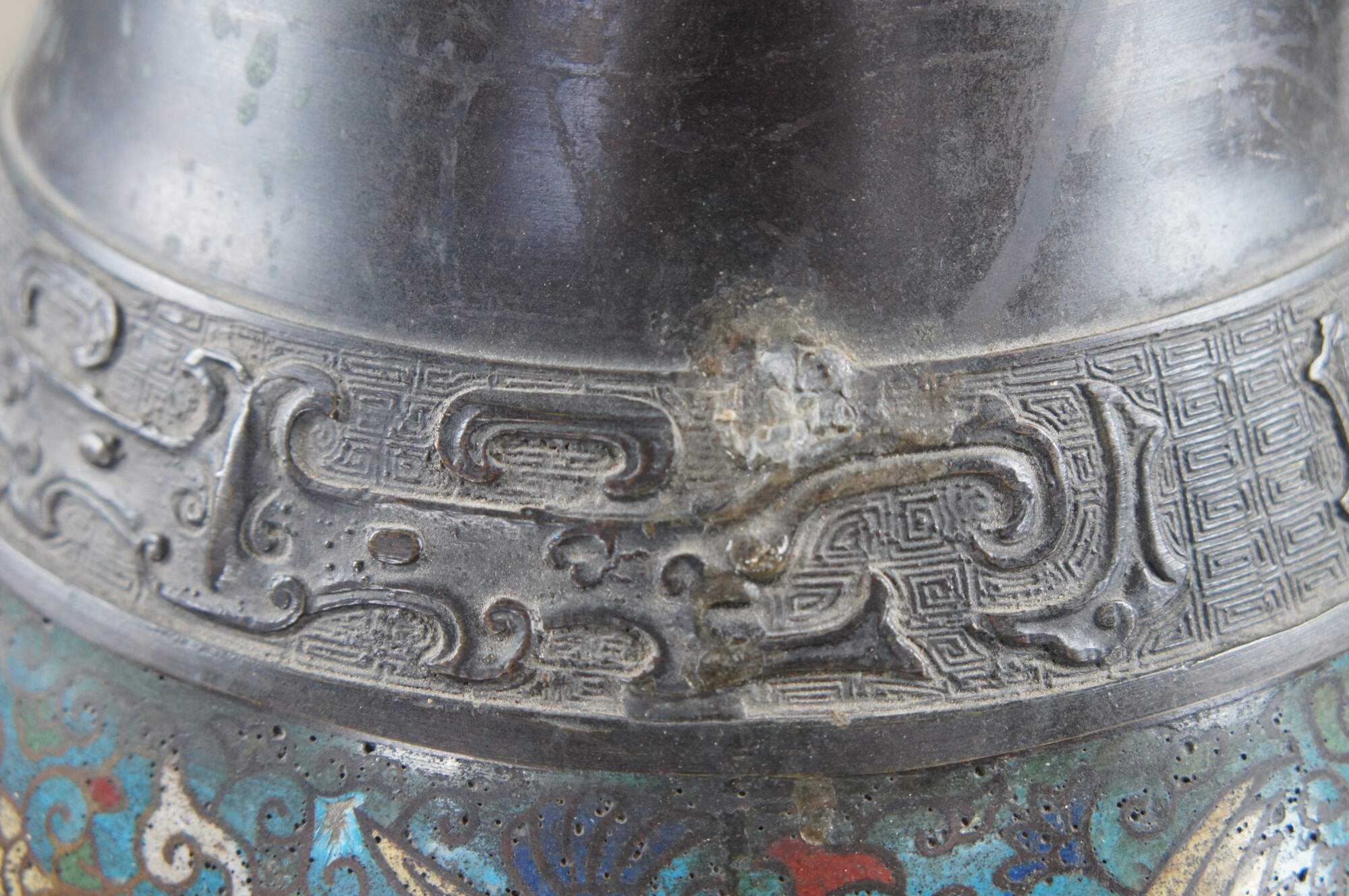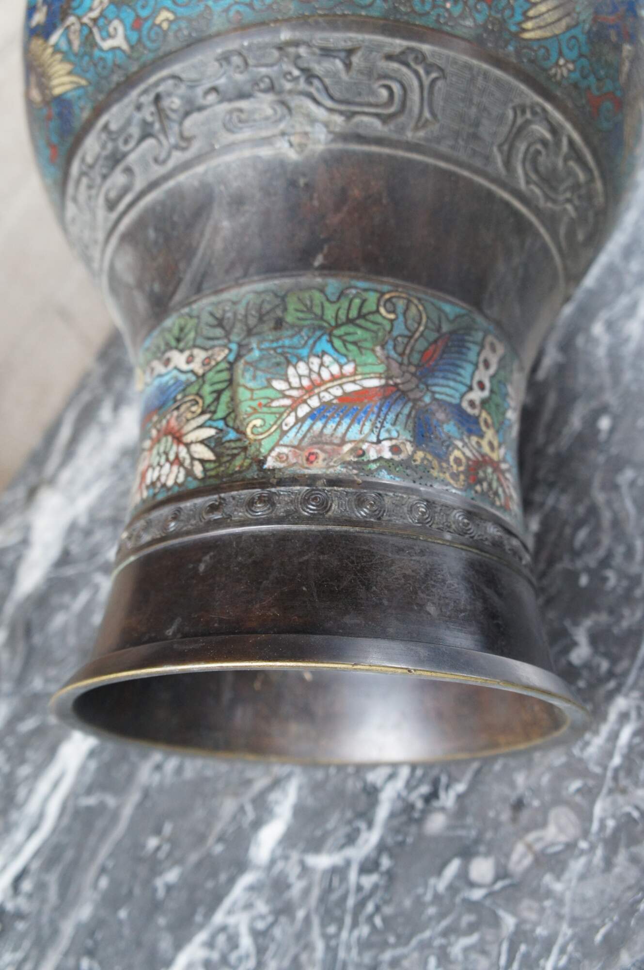 Early 20th century Japanese Bronze Champleve Flower Vase or Urn. Features a colorful champleve design of Pegasus's and butterflies between engraved bronze motifs. Marked Made in Japan on the base.